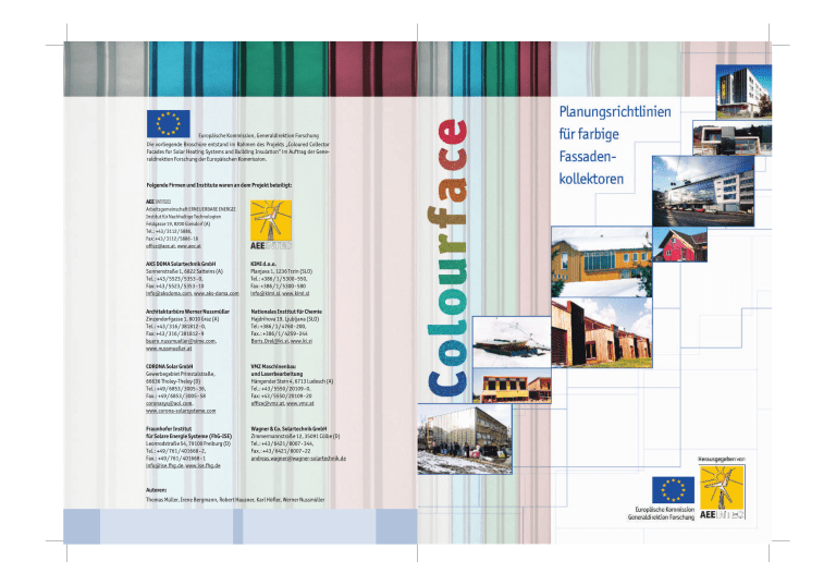 Inhalt 1 Einleitung 2 Dimensionierungsrichtlinien 2.1 Einstrahlungsprofil in der Fassade 2.2 Abschattung von Kollektoren . . . . . . . . . . . . . . . . . . . . . . . . . . . . . . . . . . . . . . . . . . . . . . . . . . . . . . . . . . . . . . . . 9 ............................................................................................... ................................................................ ....................................................... 2.2.1 Abschattung durch Vordächer und Gebäudeteile 8 9 .......................................................... 10 ............................................................... 10 2.3 Die Leistungsfähigkeit solarthermischer Systeme 2.4 Kollektorfläche in der Fassade 2.4.1 Anlagenbeispiele 8 ................................ 2.2.2 Abschattung durch Bepflanzung 2.2.3 Ermittlung des Schattenwurfs 3 .............................. 11 .............................................................. 12 ................................................................................... 12 2.4.2 Warmwasser- und Heizenergiebedarf ................................................... 2.4.3 Kollektorfläche bei Warmwasseranlagen ............................................. 2.4.4 Kollektorfläche bei Solaren Kombianlagen .......................................... 13 13 15 2.4.5 Einfluss der Kollektorbeschichtung auf die Dimensionierung der Kollektorfläche ................................................................................ 15 3 Auslegung der Kollektorhydraulik . . . . . . . . . . . . . . . . . . . . . . . . . . . . . . . . . . . . . . . . . . . . . . . . . . . . . . . . . 17 3.1 Kollektorhydraulik – Normalbetrieb 3.2 Kollektorhydraulik – Stillstandsverhalten . . . . . . . . . . . . . . . . . . . . . . . . . . . . . . . . . . . . . . . . . . . . 17 3.2.1 Vorgänge während des Stillstandes ..................................................... ...................................................... 17 17 3.2.2 Einfluss der Kollektor- und Systemhydraulik auf das Stillstandsverhalten .............................................................................. 3.2.3 Stillstandsverhalten von Fassadenkollektoren 3.3 18 Schlussfolgerungen für das Design von stillstandsicheren Systemen 4 .................................... 18 ................................................................................................ 18 Speichermanagement von Kombianlagen mit Fassadenkollektoren . . . . . . . . . . . . . . . . . . . . . . . . . . . . . . . . . . . . . . . . . . . . . . . . . . . . . . . . . . . . . . . . . . . . . . . . . . . . . . 20 5 Richtlinien und Empfehlungen zur Bauphysik 5.1 Wärme- und Feuchtetransport durch die Wandkonstruktionen 5.2 Reduktion des effektiven U-Wertes der Wand im Winter 5.3 Temperaturen im Wandaufbau 5.4 Einfluss der Feuchte auf den Wandaufbau 5.5 Betrachtete Wandaufbauten 2 21 ..................... 21 .............................................................. 21 ............................................ 22 ................................................................. 22 .......................................... 38 ........................................................................ 38 6 Richtlinien zu Bauverordnungen 7 Literatur 8 Abbildungsverzeichnis 9 Tabellenverzeichnis Colourface 21 ......... 5.5.1 Ergebnismatrix – Feuchte - Empfehlungen 5.5.2 Planungsempfehlungen ..................................... .......................................................... 39 ................................................................................................. 40 .......................................................................... 41 ............................................................................... 42 Einleitung 1 Beispiel Integration S Beispiel Akzentuierung olarthermische Kollektoren sind heute eine nicht mehr wegzudenkende Technologie zur Bereitstellung von Warmwasser und zur Heizungsunterstützung im Wohnbau. Intensive Forschungs- und Entwicklungstätigkeit von unabhängigen Instituten und auch von Solartechnikanbietern selbst hat zu Systemen geführt, die einen zuverlässigen Betrieb ermöglichen und eine Lebensdauer von mindestens 20 Jahren erreichen. Die Anwendungen reichen von thermischen Solaranlagen zur Warmwasserbereitung in Kleinanlagen über kombinierte solare Raumheizungen, großen Anlagen im städtischen Wohnbau und für Hotels bis hin zu solaren Nahwärmenetzen und der Unterstützung von Fernwärmenetzen. In den Mitgliedsländern der Europäischen Union wurden bis zum Jahr 2000 ca. 9,2 Mio. m² an Kollektorfläche installiert, wovon die Hälfte aller Anlagen in Deutschland und ca. 18% in Österreich installiert wurden. Einen weiteren großen Anteil hält Griechenland mit 17%, während die verbleibenden EU-Länder mit insgesamt 19% in Summe den restlichen Markt darstellen. Der Anteil von thermischen Solarsystemen, die neben der Warmwasserbereitung auch für die Heizungsunterstützung (so genannte Solare Kombisysteme) eingesetzt werden, beträgt z. B. für Deutschland ca. 25% und für Österreich ca. 50% der neu installierten Anlagen [Lit 1]. Im Weißbuch der Kommission [Lit 2] „Energie für die Zukunft: Erneuerbare Energieträger“ wird als strategisches Ziel angeführt, „... den Marktanteil der erneuerbaren Energieträger bis zum Jahre 2010 auf 12% zu erhöhen.“ Der jährliche Zuwachs der installierten Kollektorfläche in den Mitgliedsstaaten müsste etwa 40% betragen, um das von der EU Kommission gesteckte Ziel einer installierten Gesamtkollektorfläche für thermischen Anwendungen der Solarenergie von 100 Millionen m² im Jahr 2010 zu erreichen. Allein dieser Vergleich des EU-Zieles mit den derzeit bereits bestehenden Anlagen zeigt aus energiepolitischer Sicht die Notwendigkeit von neuen Anwendungen für die Solarthermie. Beispiel Reihenhaus Beispiel Geschoßbau Während bei geneigten Kollektoren die Entwicklung in Richtung einer o