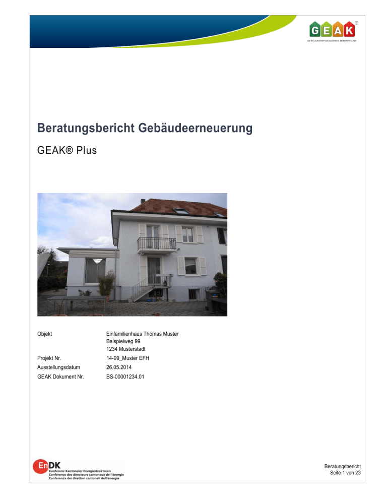 Beratungsbericht Gebäudeerneuerung GEAK® Plus Objekt Einfamilienhaus Thomas Muster Beispielweg 99 1234 Musterstadt Projekt Nr. 14-99_Muster EFH Ausstellungsdatum 26.05.2014 GEAK Dokument Nr. BS-00001234.01 Beratungsbericht Seite 1 von 23 Inhalt 1 Zusammenfassung ........................................................................................................................................................................................ 3 2 Empfehlung ................................................................................................................................................................................................... 3 3 Grundlagen .................................................................................................................................................................................................... 4 4 Gebäudedaten ............................................................................................................................................................................................... 4 5 Übersicht - Ist-Zustand .................................................................................................................................................................................. 5 6 Übersicht - Variante A ................................................................................................................................................................................... 7 7 Übersicht - Variante B ................................................................................................................................................................................... 9 8 Übersicht - Variante C ................................................................................................................................................................................. 11 9 Weiteres Vorgehen - Generelle Empfehlung ............................................................................................................................................... 13 10 Transmissionswärmeverluste ...................................................................................................................................................................... 14 11 Energiebedarf (Endenergie) ........................................................................................................................................................................ 15 12 Jährliche Energiekosten .............................................................................................................................................................................. 16 13 Beitragssätze Förderprogramme ................................................................................................................................................................. 17 14 Kosten der Massnahmen............................................................................................................................................................................. 20 15 Finanzierung der Massnahmen ................................................................................................................................................................... 21 Anhang A. Erläuterungen zum GEAK ............................................................................................................................................................ 22 Haftungsausschluss EnDK Der vorliegende Bericht wurde mit dem Online-Tool „GEAK® Plus“ erstellt. Dieses ist Eigentum der Konferenz der kantonalen Energiedirektoren (EnDK). Es wird von zertifizierten GEAK®-Experten für die Erstellung von Energieberatungsberichten und von GEAK®Dokumenten genutzt. Die Genauigkeit des Berichts hängt weitgehend davon ab, wie verlässlich die Experteneingaben sind. Das Tool ermöglicht die Erstellung von Entscheidungsgrundlagen für energetische Erneuerungen inklusive Anhaltspunkte für die zu erwartenden Kosten. Aus dem Bericht ergibt sich jedoch keine verbindliche Zusicherung, ob die dargestellten Erneuerungs-Varianten tatsächlich zu den geschätzten Preisen angeboten oder die abgeschätzten Subventionen effektiv ausbezahlt werden. Im Übrigen gilt das „Reglement zur Nutzung des GEAK®“, insbesondere dessen Ziff. 12. (Datenschutz und Nutzungsreglement) Beratungsbericht Seite 2 von 23 1 Zusammenfassung Freistehendes Einfamilienhaus mit unbeheiztem Swimmingpool, Baujahr 1979. Das Gebäude befindet sich in einem baulich guten Zustand. Die Gebäudehülle befindet sich überwiegend noch im Originalzustand. Einzig die Fenster wurden im Jahr 1995 komplett ersetzt. Raumwärme und Warmwasser werden über eine Ölheizung erzeugt. Variante A: Aussendämmung des Steildaches und Dämmung der Kellerdecke Variante B: Aussendämmung des Steildaches und Dämmung der Kellerdecke sowie Installation einer Photovoltaikanlage Variante C: Aussendämmung des Steildaches, Dämmung der Kellerdecke, Ersatz der Fenster und Dämmung der Aussenfassaden Ist-Zustand Variante A Variante B Variante C 192 192 192 192 29'245 17'741 17'741 10'979 Warmwasser* [kWh/a] 4'679 4'682 4'682 4'683 Elektrizität [kWh/a] 4'662 4'538 4'538 4'464 Gesamtkosten der Massnahmen [CHF] 0 71'335 91'335 146'399 Total Förderbeiträge [CHF] 0 0 0 -7'808 Total Initial-Aufwand [CHF] 0 71'335 91'335 138'591 3'987 2'854 1'072 2'187 Energiebezugsfläche [m²] Heizung* [kWh/a] Jährliche Energiekosten** [CHF/a] * ohne Solarthermie ** der anrechenbare Anteil der Solarthermie und Elektrizitätsproduktion ist abgezogen 2 Empfehlung Dämmmassnahmen an der Kellerdecke als Trennung zwischen beheizten und unbeheizten Bereichen weisen erfahrungsgemäss ein gutes Kosten / Nutzen Verhältnis auf. Solche Massnahmen sind einfach umzusetzen, bergen ein erhebliches Einsparpotenzial und werden auch in Ihrem Fall empfohlen. Dabei sollte auch die Treppenuntersicht gedämmt werden und 