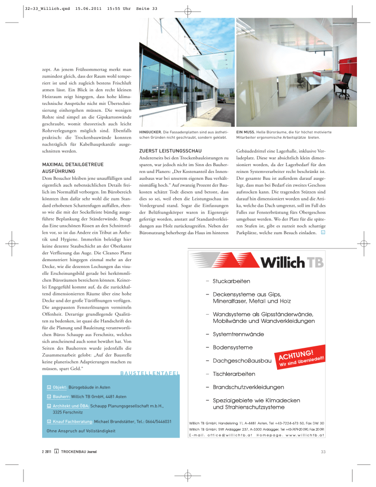 32-33_Willich.qxd 15.06.2011 15:55 Uhr zept. An jenem Frühsommertag merkt man zumindest gleich, dass der Raum wohl temperiert ist und sich zugleich bestens Frischluft atmen lässt. Ein Blick in den recht kleinen Heizraum zeigt hingegen, dass hohe klimatechnische Ansprüche nicht mit Übertechnisierung einhergehen müssen. Die wenigen Rohre sind simpel an die Gipskartonwände geschraubt, womit theoretisch auch leicht Rohrverlegungen möglich sind. Ebenfalls praktisch: die Trockenbauwände konnten nachträglich für Kabelhauptkanäle ausgeschnitten werden. MAXIMAL DETAILGETREUE AUSFÜHRUNG Dem Besucher bleiben jene unauffälligen und eigentlich auch nebensächlichen Details freilich im Normalfall verborgen. Im Bürobereich könnten ihm dafür sehr wohl die zum Standard erhobenen Schattenfugen auffallen, ebenso wie die mit der Sockelleiste bündig ausgeführte Beplankung der Ständerwände. Beugt das Eine unschönen Rissen an den Schnittstellen vor, so ist das Andere ein Tribut an Ästhetik und Hygiene. Immerhin beleidigt hier keine dezente Staubschicht an der Oberkante der Verfliesung das Auge. Die Cleaneo Platte demonstriert hingegen einmal mehr an der Decke, wie die dezenten Lochungen das visuelle Erscheinungsbild gerade bei herkömmlichen Büroräumen bereichern können. Keinerlei Engegefühl kommt auf, da die zurückhaltend dimensionierten Räume über eine hohe Decke und der große Türöffnungen verfügen. Die angepassten Fensterlösungen vermitteln Offenheit. Derartige grundlegende Qualitäten zu bedenken, ist quasi die Handschrift des für die Planung und Bauleitung verantwortlichen Büros Schaupp aus Ferschnitz, welches sich anscheinend auch sonst bewährt hat. Von Seiten des Bauherren wurde jedenfalls die Zusammenarbeit gelobt: „Auf der Baustelle keine planerischen Adaptierungen machen zu müssen, spart Geld.“ Seite 33 HINGUCKER. Die Fassadenplatten sind aus ästhetischen Gründen nicht geschraubt, sondern geklebt. EIN MUSS. Helle Büroräume, die für höchst motivierte Mitarbeiter ergonomische Arbeitsplätze bieten. ZUERST LEISTUNGSSCHAU Andererseits bei den Trockenbauleistungen zu sparen, war jedoch nicht im Sinn des Bauherren und Planers: „Der Kostenanteil des Innenausbaus war bei unserem eigenen Bau verhältnismäßig hoch.“ Auf zwanzig Prozent der Baukosten schätzt Todt diesen und betont, dass dies so sei, weil eben die Leistungsschau im Vordergrund stand. Sogar die Einfassungen der Belüftungskörper waren in Eigenregie gefertigt worden, anstatt auf Standardverkleidungen aus Holz zurückzugreifen. Neben der Büronutzung beherbergt das Haus im hinteren Gebäudedrittel eine Lagerhalle, inklusive Verladeplatz. Diese war absichtlich klein dimensioniert worden, da der Lagerbedarf für den reinen Systemverarbeiter recht beschränkt ist. Der gesamte Bau ist außerdem darauf ausgelegt, dass man bei Bedarf ein zweites Geschoss aufstocken kann. Die tragenden Stützen sind darauf hin dimensioniert worden und die Attika, welche das Dach umgrenzt, soll im Fall des Falles zur Fensterbrüstung fürs Obergeschoss umgebaut werden. Wo der Platz für die späteren Stufen ist, gibt es zurzeit noch schattige Parkplätze, welche zum Besuch einladen. B A U S T E L L E N TA F E L Objekt: Bürogebäude in Asten Bauherr: Willich TB GmbH, 4481 Asten Architekt und ÖBA: Schaupp Planungsgesellschaft m.b.H., 3325 Ferschnitz Knauf Fachberatung: Michael Brandstätter, Tel.: 0664/5446031 Ohne Anspruch auf Vollständigkeit 2 2011 TROCKENBAU Journal 33 34-35_Carnuntum.qxd 15.06.2011 15:56 Uhr Seite 34 Landesausstellungszentrum Carnuntum Entdeckungsreise mit modernem Start EINGEBETTET. Innen wie außen kann sich das neue Besucherzentrum sehen lassen. Der Archäologiepark Carnuntum vermittelt eine spannende Entdeckungsreise auf wissenschaftlicher Ebene. Aus einem Grabungsfeld wurde ein lebendiges Museum – als beliebtes Ausflugsziel (rund 150.000 Besucher pro Jahr) aber auch zum Freizeitpark und Schauplatz von Events, wie dieses Jahr der NÖ Landesausstellung. Dazu wurde ein interessantes, modernes Besucherzentrum errichtet. P 34 - ohne viel Erklärungen lesbares - Zeichen zu setzen, trotzdem aber zurückhaltend zu bleiben - und damit der Arbeit der Archäologen die gebührende Referenz zu erweisen. BAU AUF STELZEN „Der Boden rund um Petronell ist gespickt voll Artefakten und römischen Mauerresten“, erklärt Architekt DI Reinhardt Gallister. Um diese verborgenen Schätze so wenig wie möglich zu gefährden, musste das neu errichtet Besucherzentrum angehoben werden. Es wurde auf Betonsäulen errichtet, die rund 20 Meter tief in die IM FOCUS. Die weit über 1000 Jahre alten Fundstücke werden im Inneren präsentiert. Erde reichen. „Die Positionen der Säulen und der darunter liegenden Bohrpfähle wurden dabei in enger Zusammenarbeit mit den Archäologen solange verschoben, bis sichergestellt war, dass kein historisches Mauerwerk Schaden erlitt“, beschreibt der Architekt, „So wurden die historischen Zeugnisse gerettet und man kann unter dem Gebäude durchgehen und weitere Ausgrabungen durchführen“, sagt Gallister. Der Neubau hebt sich nun aufgrund der Funktionalität und der modernen Gestaltung im wahrsten Sinne des Wortes von den römischen Bauresten ab. Trotz umfangreichem Raumprogrammes – Fotos: R&M Tüchler, DI Gallister assend zu den besonderen Charakteristika der Region behandelt die diesjährige Landesausstellung Niederösterreich die Geschichte der Römer , die dort vor rund 2000 Jahren begann. Neben Natur-, Kultur-, Wirtschafts- und Siedlungsgeschichte werden auch die technischen Entwicklungen beleuchtet. Die ältesten Fundstücke werden auf die Jahre 40 bis 50 nach Christus datiert. Zu dieser Zeit war die Anlage bereits ein Standlager um das sich eine Lagerstadt bildete. Und diese Stadt bot bereits so manchen Luxus, den man mit den Römern verbindet. Großzügige Thermenanlagen, stattliche Villen und natürlich ein Amphietheater. Wahrzeichen der Region ist das so genannte „