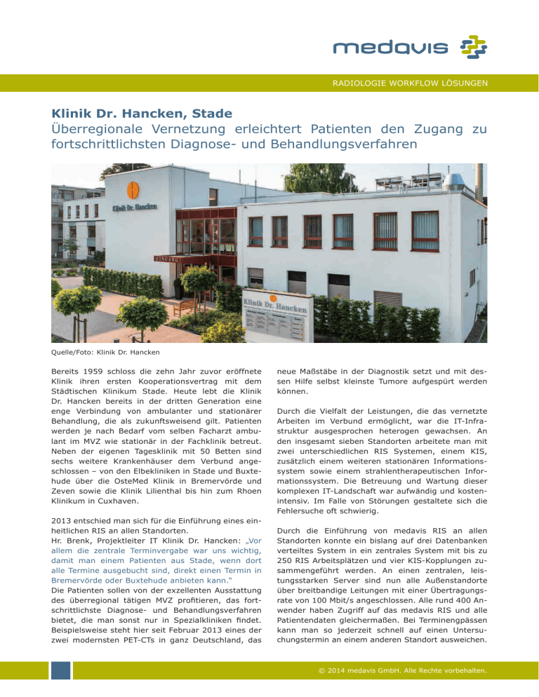 RADIOLOGIE WORKFLOW LÖSUNGEN Klinik Dr. Hancken, Stade Überregionale Vernetzung erleichtert Patienten den Zugang zu fortschrittlichsten Diagnose- und Behandlungsverfahren Quelle/Foto: Klinik Dr. Hancken Bereits 1959 schloss die zehn Jahr zuvor eröffnete Klinik ihren ersten Kooperationsvertrag mit dem Städtischen Klinikum Stade. Heute lebt die Klinik Dr. Hancken bereits in der dritten Generation eine enge Verbindung von ambulanter und stationärer Behandlung, die als zukunftsweisend gilt. Patienten werden je nach Bedarf vom selben Facharzt ambulant im MVZ wie stationär in der Fachklinik betreut. Neben der eigenen Tagesklinik mit 50 Betten sind sechs weitere Krankenhäuser dem Verbund angeschlossen – von den Elbekliniken in Stade und Buxtehude über die OsteMed Klinik in Bremervörde und Zeven sowie die Klinik Lilienthal bis hin zum Rhoen Klinikum in Cuxhaven. 2013 entschied man sich für die Einführung eines einheitlichen RIS an allen Standorten. Hr. Brenk, Projektleiter IT Klinik Dr. Hancken: „Vor allem die zentrale Terminvergabe war uns wichtig, damit man einem Patienten aus Stade, wenn dort alle Termine ausgebucht sind, direkt einen Termin in Bremervörde oder Buxtehude anbieten kann.“ Die Patienten sollen von der exzellenten Ausstattung des überregional tätigen MVZ profitieren, das fortschrittlichste Diagnose- und Behandlungsverfahren bietet, die man sonst nur in Spezialkliniken findet. Beispielsweise steht hier seit Februar 2013 eines der zwei modernsten PET-CTs in ganz Deutschland, das neue Maßstäbe in der Diagnostik setzt und mit dessen Hilfe selbst kleinste Tumore aufgespürt werden können. Durch die Vielfalt der Leistungen, die das vernetzte Arbeiten im Verbund ermöglicht, war die IT-Infrastruktur ausgesprochen heterogen gewachsen. An den insgesamt sieben Standorten arbeitete man mit zwei unterschiedlichen RIS Systemen, einem KIS, zusätzlich einem weiteren stationären Informationssystem sowie einem strahlentherapeutischen Informationssystem. Die Betreuung und Wartung dieser komplexen IT-Landschaft war aufwändig und kostenintensiv. Im Falle von Störungen gestaltete sich die Fehlersuche oft schwierig. Durch die Einführung von medavis RIS an allen Standorten konnte ein bislang auf drei Datenbanken verteiltes System in ein zentrales System mit bis zu 250 RIS Arbeitsplätzen und vier KIS-Kopplungen zusammengeführt werden. An einen zentralen, leistungsstarken Server sind nun alle Außenstandorte über breitbandige Leitungen mit einer Übertragungsrate von 100 Mbit/s angeschlossen. Alle rund 400 Anwender haben Zugriff auf das medavis RIS und alle Patientendaten gleichermaßen. Bei Terminengpässen kann man so jederzeit schnell auf einen Untersuchungstermin an einem anderen Standort ausweichen. © 2014 medavis GmbH. Alle Rechte vorbehalten. RADIOLOGIE WORKFLOW LÖSUNGEN Als ein weiterer Vorteil erweist sich, dass durch die zentrale Datenbank im medavis RIS die Erstellung von Auswertungen über alle Standorte hinweg nun spielerisch gelingt. Dem steigenden Bedarf nach Statistiken kann schnell und unkompliziert Rechnung getragen werden. Hr. Brenk: „Wir haben nur noch ein RIS, aus dem wir alle radiologischen und nuklearmedizinischen Informationen ziehen, und können nun ganz einfach Statistiken über alle Standorte aus einer Datenbank erstellen.“ Die Umstellung stellte das Unternehmen vor zwei große Herausforderungen. Zum einen galt es auf der technischen Seite die unterschiedlichen Systeme im medavis RIS zusammenzuführen. Zum anderen mussten rund 400 Anwender mit dem neuen System vertraut gemacht werden. schulten über mehrere Wochen vor Ort. Ein angenehmer Nebeneffekt: Die Anwender kennen ihre künftigen Ansprechpartner von Anfang an persönlich, da das Gros der medavis Trainer gleichzeitig als Support-Mitarbeiter arbeitet; eine optimale Grundlage für eine auch weiterhin gute Zusammenarbeit. Die Umstellung aller sieben Standorte erfolgte in nur 5 Monaten – von Oktober 2013 bis Februar 2014. Die finale Systemumstellung wurde jeweils innerhalb nur eines Arbeitstages vollzogen. Hr. Brenk: „Wir hatten im gesamten Projektverlauf nicht einen Tag Verzug, wir konnten jeden Termin, der geplant war, genau so einhalten.“ Mit der Einführung eines einheitlichen RIS hat man nicht nur die Systemstabilität verbessert, sondern auch die Fehlerfindung und -behebung erleichtert. Einen Zeit- und Kostengewinn bietet zusätzlich der medavis Agent. Das Software-Verteilungs-Tool sorgt dafür, dass Updates, aber auch spätere Software-Erweiterungen automatisiert eingespielt werden. Dadurch reduziert sich der Betreuungsaufwand auf Seiten der Administratoren beträchtlich. Um die zentrale IT-Infrastruktur vor Ausfällen zu schützen, legte man von Anfang an Wert auf Virtualisierbarkeit. Das medavis RIS wurde auf XEN virtualisiert, die gesamte Infrastruktur läuft jetzt auf einem SAN. So ist gewährleistet, dass beim Ausfall eines Gerätes, das zweite als Ersatz einspringt; der Workflow läuft reibungsfrei weiter, ohne dass die Anwender den Ausfall bemerken. Um mehr Effizienz in jedem einzelnen Arbeitsschritt zu erzielen, arbeitet das medavis RIS workflowbasiert nach einem ausgeklügelten Rollenverständnis. Die Anwender mussten zunächst ihre bisherige Arbeitsweise überdenken und die neue verinnerlichen. Eine wichtige Voraussetzung hierfür waren die umfassenden Ortsbegehungen. Man ging durch die einzelnen Abteilungen und nahm im Gespräch mit den Anwendern die konkreten Anforderungen auf. Laut Projektleiter Hr. Brenk zahlte sich jeder Tag, den man in diese Vorprojektphase investierte, in der Umsetzungsphase aus. Denn nur wenn man die Anforderungen der einzelnen Anwendergruppen kennt, können Workflow und Schulungskonzept passgenau auf die individuellen Bedürfnisse abgestimmt werden. Dies ist nicht zuletzt für die Bereitschaft der Anwender, sich parallel zum Klinikbetrieb mit dem neuen System auseinanderzusetzen, eine wichtige Grundlage. Die Begehungszeiten wurden mit den Sch