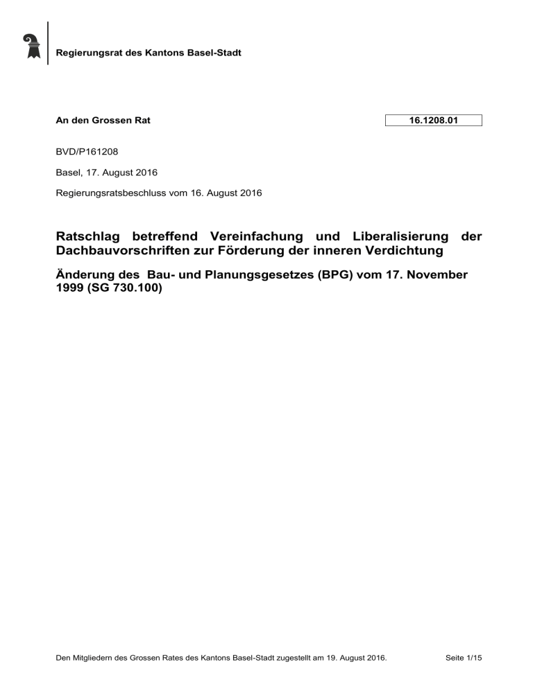 Regierungsrat des Kantons Basel-Stadt An den Grossen Rat 16.1208.01 BVD/P161208 Basel, 17. August 2016 Regierungsratsbeschluss vom 16. August 2016 Ratschlag betreffend Vereinfachung und Liberalisierung der Dachbauvorschriften zur Förderung der inneren Verdichtung Änderung des Bau- und Planungsgesetzes (BPG) vom 17. November 1999 (SG 730.100) Den Mitgliedern des Grossen Rates des Kantons Basel-Stadt zugestellt am 19. August 2016. Seite 1/15 Regierungsrat des Kantons Basel-Stadt Inhalt 1. Begehren .................................................................................................................... 3 2. Das Wichtigste in Kürze ............................................................................................ 3 3. Grundkonzeption der baselstädtischen Dachvorschriften .................................... 3 4. Die einzelnen Revisionspunkte ................................................................................ 4 4.1 4.2 4.3 4.4 Zweites Dachgeschoss frei von Bruttogeschossflächenbeschränkungen .................................... 4 Treppenhäuser und Liftschächte im Dachbereich zulassen ......................................................... 5 Mehr Spielraum für die Dachgestaltung innerhalb des Dachprofils .............................................. 7 4.3.1 Flexibilisierung der Abstandsvorschriften für Dachaufbauten ............................................9 4.3.2 Streichung der speziellen Zone 2-Dachbauvorschriften ................................................. 11 4.3.3 Mehr Rechtssicherheit betreffend Ausgestaltung von Dachterrassen ............................ 12 Finanzielle Auswirkungen dieser Gesetzesrevision .................................................................... 13 5. Formelle Prüfungen und Regulierungsfolgenabschätzung ................................. 13 6. Antrag ....................................................................................................................... 13 Seite 2/15 Regierungsrat des Kantons Basel-Stadt 1. Begehren Mit diesem Ratschlag beantragen wir Ihnen, dem vorliegenden Entwurf für die Änderung des Bau- und Planungsgesetzes (BPG, SG 730.100) zuzustimmen. 2. Das Wichtigste in Kürze In den letzten zehn Jahren hat die Anzahl Arbeitsplätze in Basel um rund 20‘000 zugenommen. Das Wohnungsangebot konnte mit dieser Zunahme an Arbeitsplätzen bei Weitem nicht Schritt halten, was zu Wohnungsknappheit, steigenden Mieten und zu massiv mehr Pendlerverkehr geführt hat. Um dieser Entwicklung entgegenzuwirken, müssen im Kanton Basel-Stadt zusätzliche Wohnungen geschaffen werden. Arealentwicklungen und kleinere Verdichtungsprojekte – wozu auch der Ausbau von Dachgeschossen zählt – helfen, den benötigten Wohnraum zu schaffen. Zudem kann damit dem Bedürfnis der Bevölkerung nach grosszügigeren Wohnungen entsprochen werden. Der erleichterte Ausbau von Dachgeschossen trägt damit zur "Siedlungsentwicklung nach Innen" bei, die von der Bevölkerung gewünscht ist und zu welcher sich der Kanton Basel-Stadt im Legislaturplan und dem kantonalen Richtplan auch klar bekennt. Mit der vorliegenden Gesetzesrevision wird auf diese Entwicklung reagiert, indem die baurechtlichen Vorschriften für Dachgeschosse zur besseren Nutzbarkeit liberalisiert werden. Künftig sollen sowohl bestehende Dachgeschosse wie auch solche von neu zu bauenden Gebäuden in erhöhtem Masse zu selbständigen Wohneinheiten ausgebaut werden können. Ziel ist es, durch die Liberalisierung der Dachvorschriften eine Mobilisierung und Verdichtung von brachliegendem Nutzungspotenzial in der Stadt zu bewirken und das dafür notwendige Baubewilligungsverfahren zu vereinfachen. Dies unter Wahrung der im Bau- und Planungsrecht bewährten Grundkonzeption bezüglich Strassenbild und Wohnqualität. Konkret soll die Erschliessung der Dachgeschosse durch Treppenhäuser und Lifte erleichtert werden. Ferner soll neu ein zweites Dachgeschoss auch bei baulich bereits übernutzten Parzellen zulässig werden; mit der Möglichkeit des Neuaufbaus eines zweiten Dachgeschosses (Satteldach oder Attika) über dem bestehenden Attikageschoss wird zusätzlicher Wohnraum im Dachgeschoss ermöglicht. Neu sollen die für Dachaufbauten bewährten Regeln als Voraussetzung für eine hochwertige Belichtung der Räume durch normale Fenster im Dachgeschoss für alle Bauzonen, also auch für die Zone 2, gelten. Klare Spielregeln für die Anordnung von Dachterrassen im Einklang mit den Fassaden sollen deren Realisierung und damit die Wohnqualität im Dachgeschoss fördern. Zur Erhöhung der Wohnqualität sollen schliesslich neu „brachliegende Flachdächer“ über dem ersten Attika auch dann als Terrasse genutzt werden können, wenn die nutzbare Flachdachfläche die zulässige Bruttogeschossfläche für offene Bauten und Bauteile überschreitet. Zudem soll die Aufhebung der zulässigen Maximalhöhen für Dachfirste die volle Ausnutzung des Dachraums innerhalb des Dachprofils bewirken und damit der Wohnraummaximierung im Dachgeschoss dienen. Für das Jahr 2017 ist der nächste Ratschlag zur Zonenplanrevision mit zusätzlichen Massnahmen zur inneren Verdichtung geplant. Mit Aufzonungen und einer möglichen Differenzierung des Lichteinfallswinkels sollen weitere Spielräume für das Wohnen in der Stadt geschaffen werden. 3. Grundkonzeption der baselstädtischen Dachvorschriften Die geltenden Rechtsgrundlagen für die Art und Ausgestaltung der zulässigen Dachgeschosse im Kanton Basel-Stadt sind im Bau- und Planungsgesetz (BPG) vom 17. November 1999 enthalten und wurden letztmals mit Revision des BPG vom 20. Januar 2005 modifiziert. Die Grundkonzep- Seite 3/15 Regierungsrat des Kantons Basel-Stadt tion dieser Dachbauvorschriften orientiert sich am alten Hochbautengesetz vom 11. Mai 1939: Seit 1968 erlaubt der Gesetzgeber die Erstellung eines vollumfänglich zu Wohnzwecken genutzten Dachgeschosses.1 Diese Gesetzesänderung sollte der Vermehrung des auch damals knappen