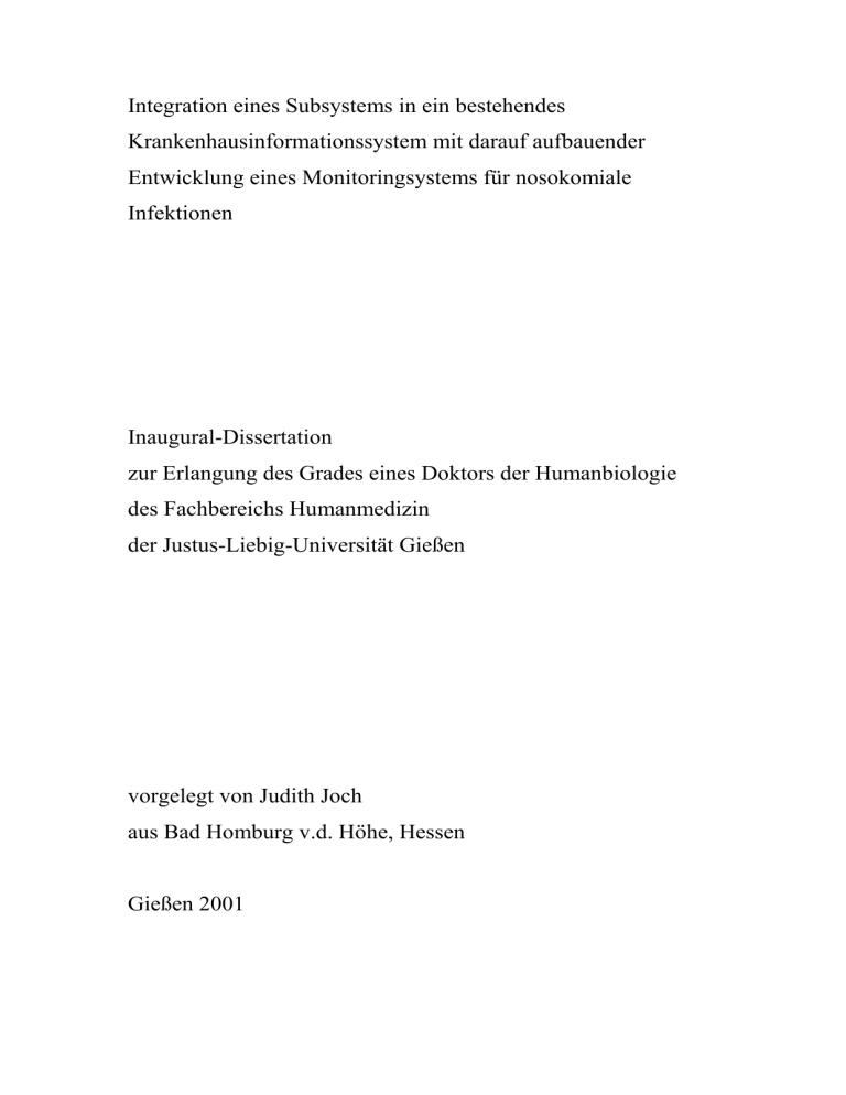 Integration eines Subsystems in ein bestehendes Krankenhausinformationssystem mit darauf aufbauender Entwicklung eines Monitoringsystems für nosokomiale Infektionen Inaugural-Dissertation zur Erlangung des Grades eines Doktors der Humanbiologie des Fachbereichs Humanmedizin der Justus-Liebig-Universität Gießen vorgelegt von Judith Joch aus Bad Homburg v.d. Höhe, Hessen Gießen 2001 Aus dem Medizinischen Zentrum für Ökologie Institut für Medizinische Informatik Leiter: Prof. Dr. J. Dudeck des Klinikums der Justus-Liebig-Universität Gießen Gutachter: Prof. Dr. Dudeck Gutachter: Prof. Dr. Dr. h.c. Hempelmann Tag der Disputation: 19.April 2002 INHALTSVERZEICHNIS 1 EINLEITUNG ...................................................................... 6 1.1 AUFGABENSTELLUNG ........................................................................................ 6 2 UMFELD............................................................................. 10 2.1 DAS KRANKENHAUSINFORMATIONSSYSTEM IN GIEßEN .................................. 10 2.2 DAS MDD....................................................................................................... 16 2.3 DAS MIKROBIOLOGIESYSTEM ......................................................................... 18 2.4 MIKROBIOLOGISCHE BEFUNDDATEN ............................................................... 20 2.5 NOSOKOMIALE INFEKTIONEN .......................................................................... 25 3 KONZEPT........................................................................... 28 3.1 DATENINTEGRATION ....................................................................................... 29 3.1.1 Methoden zur Datenintegration ............................................................... 30 3.1.2 Methoden zur Datenspeicherung ............................................................. 32 3.2 FUNKTIONALE INTEGRATION........................................................................... 33 3.2.1 Integration auf Funktionsebene ............................................................... 35 3.2.2 Methoden zur Integration heterogener Systeme...................................... 37 3.3 ENTERPRISEINTEGRATION ............................................................................... 38 3.3.1 Aufbau statistischer Funktionen zur Bewertung der Daten..................... 39 3.3.2 Methoden zur wissensbasierten Bewertung ............................................ 40 4 IMPLEMENTATION........................................................ 44 4.1 DATENINTEGRATION ....................................................................................... 44 4.1.1 Datenübertragung zwischen dem Mikrobiologiesystem und WING ...... 44 4.1.2 Datenintegration weiterer Subsysteme .................................................... 49 4.2 FUNKTIONALE INTEGRATION........................................................................... 55 4.2.1 Realisierte Funktionen ............................................................................. 56 4.2.2 MDD........................................................................................................ 62 4.3 ENTERPRISEINTEGRATION ............................................................................... 68 4.3.1 Architektur des Monitoringsystems......................................................... 69 4.3.2 Aufbau neuer Funktionen ........................................................................ 69 4.3.3 Einsatz wissensbasierter Methoden ......................................................... 84 4.3.4 Implementation........................................................................................ 98 5 ERGEBNISSE .................................................................. 101 5.1 DATENINTEGRATION ..................................................................................... 101 5.2 FUNKTIONALE INTEGRATION......................................................................... 102 5.3 ENTERPRISEINTEGRATION ............................................................................. 104 5.3.1 Finetuning.............................................................................................. 105 5.3.2 Klinische Testphase............................................................................... 108 5.3.3 Klinischer Routinebetrieb...................................................................... 110 5.3.4 Stationsvergleich ................................................................................... 124 6 DISKUSSION ................................................................... 127 6.1 KONZEPT ....................................................................................................... 127 6.2 DISKUSSION DER INTEGRATIONSMETHODE.................................................... 128 6.2.1 6.3 Middleware............................................................................................ 128 DISKUSSION DES KONZEPTS DER WISSENSANWENDUNG ............................... 129 6.3.1 Wissensbasierte Systeme....................................................................... 129 6.3.2 Das Monitoringsystem im Vergleich zu anderen Arbeiten ................... 134 6.4 PROBLEME BEI DER EINFÜHRUNG.................................................................. 138 7 ZUSAMMENFASSUNG ................................................. 139 LITERATUR ......................................................................... 142 INSTALLATION MONITORINGSYSTEM ..................... 151 INSTALLATION MIKROBIOLOGIE-DATENANZEIGE 152 UPDATES............................................................................... 152 PUBLIKATIONSLISTE ...................................................... 153 LEBENSLAUF ...................................................................... 154 DANKSAGUNG .................................................................... 155 6 1 Einleitung Früher waren Krankenhausinformationssysteme in d
