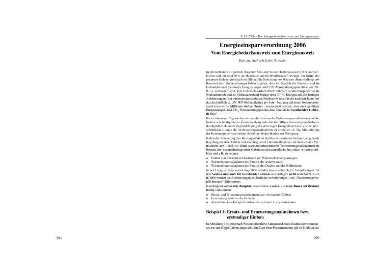 EvEV 2006 – Vom Energiebedarfsausweis zum Energieausweis Energieeinsparverordnung 2006 Vom Energiebedarfsausweis zum Energieausweis Dipl.-Ing. Architekt Stefan Horschler In Deutschland wird jährlich etwa eine Milliarde Tonnen Kohlendioxid (CO2) emittiert. Hieran sind mit rund 30 % die Haushalte und Kleinverbraucher beteiligt. Ein Drittel des gesamten Endenergiebedarfs entfällt auf die Beheizung von Räumen (Bereitstellung von Raumwärme). Untersuchungen haben ergeben, dass im Bereich des Neubaus und im Gebäudebestand technische Energieeinspar- und CO2-Verminderungspotentiale von 70 90 % vorhanden sind. Das technisch-wirtschaftlich nutzbare Reduktionspotential im Neubaubereich und im Gebäudebestand beträgt etwa 50 %, bezogen auf die heutigen Anforderungen. Bei einem prognostizierten Neubauzuwachs für die nächsten Jahre von durchschnittlich ca. 350 000 Wohneinheiten pro Jahr - bezogen auf einen Wohnungsbestand von etwa 39 Millionen Wohneinheiten - wird jedoch deutlich, dass das eigentliche Energieeinspar- und CO2-Verminderungspotential im Bereich der bestehenden Gebäude liegt! Bis zum heutigen Tag werden wärmeschutztechnische Verbesserungsmaßnahmen an Gebäuden sehr häufig nur im Zusammenhang mit ohnehin fälligen Sanierungsmaßnahmen durchgeführt, da unter Zugrundelegung der derzeitigen Energiekosten nur so eine Wirtschaftlichkeit durch die Verbesserungsmaßnahmen zu erreichen ist. Zur Minimierung der Heizenergieverluste stehen vielfältige Möglichkeiten zur Verfügung. Neben der Erneuerung des Heizungssystems (Einbau wirksamerer Brenner, angepasste Regelungstechnik, Einbau von nachträglichen Dämmmaßnahmen im Bereich des Verteilnetzes usw.) sind vor allem wärmeschutztechnische Verbesserungsmaßnahmen im Bereich der wärmeübertragenden Gebäudeumfassungsfläche besonders wirkungsvoll. Hier sind z.B. zu nennen: o Einbau von Fenstern mit hochwertigen Wärmeschutzverglasungen, o Wärmedämmmaßnahmen im Bereich der Außenwände, o Wärmedämmmaßnahmen im Bereich des Daches und der Kellerdecke. In der Energieeinsparverordnung 2006 werden voraussichtlich die Anforderungen für den Neubau und auch für bestehende Gebäude und Anlagen nicht verschärft. Auch in 2006 werden die Anforderungen in „bedingte Anforderungen“ und „Nachrüstungsverpflichtungen“ differenziert. Nachfolgend sollen drei Beispiele beschrieben werden, die beim Bauen im Bestand häufig vorkommen: o Ersatz- und Erneuerungsmaßnahmen bzw. erstmaliger Einbau o Erweiterung bestehender Gebäude o Ausstellen eines Energiebedarfsausweises bzw. Energieausweises Beispiel 1: Ersatz- und Erneuerungsmaßnahmen bzw. erstmaliger Einbau In Abbildung 1 ist eine nach Westen orientierte Außenwand eines Einfamilienwohnhauses aus den 60iger Jahren dargestellt. Im Zuge einer Putzerneuerung gilt im Hinblick auf 294 295 EnEV 2006 – Vom Energiebedarfsausweis zum Energieausweis EnEV 2006 – Vom Energiebedarfsausweis zum Energieausweis die einzuhaltenden U-Wertanforderungen zu prüfen welcher U-Wert diese Außenwand aufweist. Ist dieser größer als 0,90 W/(m2K) dürfte nach gegenwärtig geltender Energieeinsparverordnung 2002/2004 im Zuge einer umfassenden Putzerneuerung der U-Wert von UAW = 0,35 W/(m2K) nicht überschritten werden. Zur Klärung der ggf. erforderlichen Dämmmaßnahme ist die Klärung des vorhandenen U-Wertes erforderlich. Dieser wird hier mit einem U-Wert von 1,16 W/(m2K) angenommen. Diesen im Bestand zu ermitteln, stellt im Einzelfall eine große Herausforderung an den Nachweisenden dar, da die thermische Qualität im Altbau und auch im Neubau nicht dokumentiert wurde bzw. wird [Horschler, Stefan: Dokumentation baulicher Wärmeschutz, hrsg. proKlima-Fonds Hannover, 01/2005]. Abbildung 2: Erweiterung eines bestehenden Wohngebäudes. Abbildung 1: Putzerneuerung einer Außenwand. Betroffen sind hier mehr als 20 Prozent der nach Westen orientierten Fassade. Die erforderliche Dicke des Wärmedämmstoffes ergibt sich wie folgt: UAW,gef. = 0,35 W/(m2K) RT,gef. = 1/ UAW,gef. R T,gef. = 2,857 m2K/W UAW,vorh = 1,16 W/(m2K) RT,vorh. = 1/ UAW,vorh. R T,vorh. = 0,862 m2K/W RWD,erf. = 2,857 – 0,862 RWD,erf. = 1,995 1,993 = d/0,04 d = 0,080 m Bei einem Bemessungswert der Wärmeleitfähigkeit von 0,04 W/(mK) ergibt sich die erforderliche Dämmschichtdicke zu 0,08 m. Beispiel 2: Erweiterung bestehender Gebäude In Abbildung 2 bzw. 3 sind Beispiele für bauliche Erweiterungsmaßnahmen bestehender Gebäude dargestellt. Sofern das beheizte Volumen des Erweiterungsbaus 100 m3 nicht überschreitet, sind für den Erweiterungsbau lediglich U-Werte nachzuweisen. So dürfen beispielsweise für eine von außen wärmegedämmte Außenwand ein U-Wert von UAW ≤ 0,35 W/(m2K), für ein geneigtes Dach ein U-Wert von UD ≤ 0,30 W/(m2K) und für die Fenster im Regelfall ein U-Wert von Uw ≤ 1,7 W/(m2K) nicht überschritten werden. 296 Abbildung 3: Ausbau eines ursprünglich nicht beheizten Dachgeschosses. In einem Mehrfamilienhaus (Baujahr 1958), Abbildung 3, soll im Dachgeschoss ein nicht beheizter Trockenboden zu einer Wohnung umgenutzt werden. Das Gebäude wird zentral mit einem Heizkessel von 1980 beheizt. A Ve A/Ve = 200 m2 = 320 m3 = 0,63 m–1 297 EnEV 2006 – Vom Energiebedarfsausweis zum Energieausweis EnEV 2006 – Vom Energiebedarfsausweis zum Energieausweis Folgen aus EnEV 2002/2004: Variante 1: Konsequenzen aus der Änderungsnovelle 2006 Es müssen der Jahres- Primärenergiebedarf und der spezifische, auf die wärmeübertragende Umfassungsfläche bezogene Transmissionswärmeverlust überprüft werden. Für den Fall, dass für den bestehenden Wärmeerzeuger keine Regeln der Technik vorliegen, kann die Anlagenaufwandszahl ep zur Berechnung des Jahres-Primärenergiebedarfs nicht ermittelt werden. In diesem Fall ist allein der Nachweis des spezifischen, auf die wärmeübertragende Umfassungsfläche bezogenen Transmissionswärmeverlustes nach § 3 Absatz 3 Satz 1 Nr. 3 vorzunehmen. Es wird gefordert, dass der jeweilige Höc