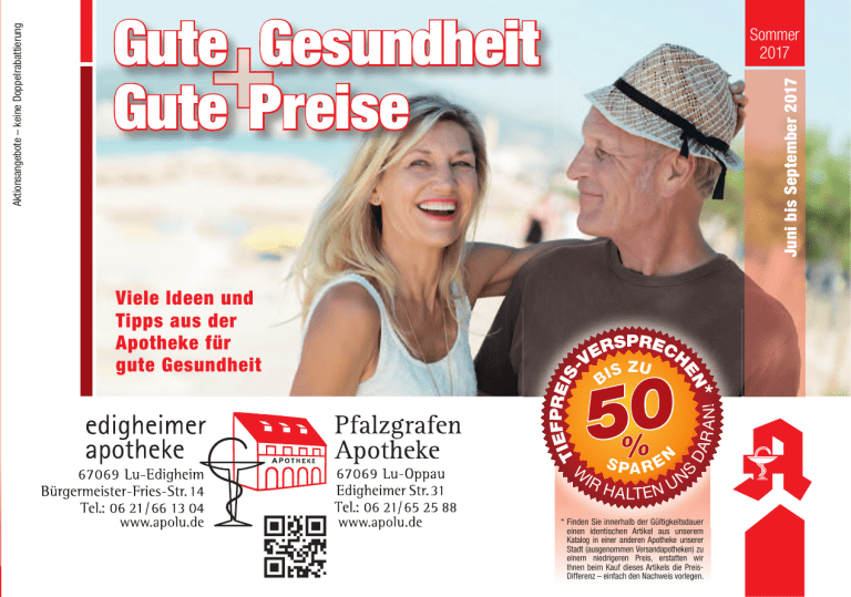 Juni bis September 2017 50 IR R A N! DA S W RSPRECH VE EN Viele Ideen und Tipps aus der Apotheke für gute Gesundheit FPREI STIE Aktionsangebote – keine Doppelrabattierung Gute Gesundheit Gute Preise Sommer 2017 H A LT E N U N * Finden Sie innerhalb der Gültigkeitsdauer einen identischen Artikel aus unserem Katalog in einer anderen Apotheke unserer Stadt (ausgenommen Versandapotheken) zu einem niedrigeren Preis, erstatten wir Ihnen beim Kauf dieses Artikels die PreisDifferenz – einfach den Nachweis vorlegen. Ihre Edigheimer Apotheke und Pfalzgrafen Apotheke im Porträt Edigheimer Apotheke Bürgermeister-Fries-Straße 14 67069 Lu-Edigheim Telefon: 06 21/66 13 04 Telefax: 06 21/6 29 66 02 Öffnungszeiten: Mo., Di., Do. und Fr.: 8.30 – 12.30 Uhr und 14.30 – 18.30 Uhr Mi. und Sa.: 8.30 – 12.30 Uhr Pfalzgrafen Apotheke Liebe Kundin, lieber Kunde, Ihre Gesundheit liegt uns besonders am Herzen. Damit Sie den Sommer in vollen Zügen genießen können, benötigen Sie den für Sie geeigneten Sonnenschutz, falls Sie von Allergien geplagt sind, ein wirkungsvolles Gegenmittel, und für Ihren Urlaub checken wir Ihre Reiseapotheke auf Vollständigkeit. Und damit die Reisekasse voll bleibt, bekommen Sie neben unserer freundlichen, kompetenten Beratung zahlreiche Produkte zu kleinen Preisen. Wir freuen uns, Sie bald in unserer Apotheke begrüßen zu dürfen! Ihr Team der Edigheimer Straße 31 67069 Lu-Oppau Telefon: 06 21/65 25 88 Telefax: 06 21/65 39 42 Neue Öffnungszeiten: Mo. – Fr.: 8.30 – 18.30 Uhr (durchgehend!) Sa.: 8.30 – 12.30 Uhr Die Angebote in diesem Katalog sind gültig bis: 30.09.2017. Fotograf: Klaus Litzel Unsere Leistungspunkte Vielfältige Gesundheitsprogramme und Beratungen, z. B. bei Inkontinenz, Diabetes, Wundversorgung, Grippe, Allergien, Osteoporose Kostenloser Lieferservice: Wenn eine Arznei für Sie mal nicht vorrätig ist, liefern wir sie Ihnen kostenfrei nach Hause (im Landkreis unserer Apotheke). Wenn Sie gar nicht kommen können oder krank sind, so rufen Sie uns an oder bestellen Sie per Fax oder E-Mail. Bestellung ausländischer Arzneimittel Prüfung auf Wechselwirkung Ihrer Arzneimittel Kosmetikberatung – Anti-Aging-Beratung Gewinnspiel Bitte beachten Sie das Gewinnspiel auf der vorletzten Seite dieses Katalogs. Gewinnen Sie mit etwas Glück einen einzigartigen Aufenthalt für 2 Personen im „Gut Edermann“ in Teisendorf! 2/3 Gute Gesundheit Gute Preise AL Ä I T S SIG • LÄ ate lpräpar Origina ältlich erh ER U •Q 20.000 T V AUS DE R E IHRES VE EK RT TH R O über –S IC H E R U N D ZU Impressum Herausgeber und Redaktion: markom GmbH & Co. KG Lange Straße 128 · 76530 Baden-Baden [email protected] · www.markomgroup.de Haftungsausschluss 4–9 Sonnen- und Insektenschutz, Reiseübelkeit, Halsschmerzen, Husten, Harnwege, Pilz, Herpes, Warzen onnen- und Insektenschutz, Reiseübelkeit, Halsschmerzen, Husten, Harnwege, Pilz, Herpes, Warzen S EN AU AP Sommer, Sonne, Reiseapotheke Nachdruck und Vervielfältigungen jeder Art – auch auszugsweise – nur mit ausdrücklicher Genehmigung. Wir haften nicht für Druckfehler, Vollständigkeit und Richtigkeit der Hinweise zu den in diesem Katalog dargestellten Produkten. Die bei jedem Produkt aufgeführten Hinweise beruhen auf den vom jeweiligen Hersteller zur Verfügung gestellten Informationen. Die Inhalte sind auf wichtige Informationen reduziert. Sie sollen sachlich informieren und keine Empfehlung oder Bewerbung des Medikaments darstellen und können lückenhaft oder unvollständig sein. Keinesfalls ersetzen Informationen und Gesundheitstipps dieses Katalogs eine Beratung durch einen Arzt oder Apotheker oder das Lesen des Original-Beipackzettels des Arzneimittels. Eine sinnvolle Therapie ist nur unter Berücksichtigung aller individuellen Besonderheiten, zum Beispiel Art und Dauer der Beschwerden, Begleiterkrankungen usw., möglich, worauf nur in einem persönlichen Gespräch mit einer fachkundigen Person (Arzt/Apotheker) eingegangen werden kann. Zu Risiken und Nebenwirkungen von Arzneimitteln lesen Sie die Packungsbeilage und fragen Sie Ihren Arzt oder Apotheker. Allergie, Augen, Atemwege 10 – 13 Schleimlöser, Husten, Augenreizung, Pollenallergie Schmerzen, Migräne 14 – 15 Schmerz- und Migränemittel Muskeln, Knochen, Gelenke 16 – 18 Nahrungsergänzung, Osteoporose, Muskelschmerzen, Rückenschmerzen Rätselseite 19 Magen-Darm-Gesundheit 20 – 21 Verstopfung, Durchfall, Bähungen, Sodbrennen Diabetes, Kreislauf, Gefäße 22 – 23 Venen, Hämorriden, Hirnleistung, Blutdruck Homöopathie, Naturheilmittel 24 – 26 Schmerzen, Husten, Kreislauf, Blähungen, Schüßler-Salze Hautgesundheit, Schönheitspflege 27 – 29 Mund-/Körperpflege, Kosmetik, Läuse Index 30 Sommer, Sonne, Reiseapotheke Gut gerüstet zu Hause und auf Reisen Wie sieht es mit Ihrer Hausapotheke aus? Eine vollständige Hausapotheke sollte bei den häufigsten kleineren – und größeren – Notfällen Erste Hilfe leisten können. Daher gehören neben Präparaten gegen Schmerzen, Fieber, Erkältungskrankheiten und Magen-/Darmbeschwerden auch Mittel für kleinere Verletzungen hinein. Fieberthermometer und Kühlkompressen sollten jederzeit einsatzbereit sein, eine Zeckenzange ist zudem empfehlenswert. Bei Kleinkindern sind Mittel gegen Blähungen, Zahnungsbeschwerden und Fieberzäpfchen unverzichtbar. Im Grunde sollte der Großteil der Hausapotheke auch auf Reisen mitgenommen werden. Ebenso wichtig sind rezeptpflichtige Medikamente, die regelmäßig eingenommen werden müssen. Aber auch bei unvorhersehbaren kleineren Gesundheitsproblemen ist es oft sehr mühsam, die notwendigen Medikamente im Ausland aufzutreiben. Nicht alle Arzneimittel sind überall erhältlich oder tragen den gleichen Namen. Zusätzlich gehören in eine Reiseapotheke noch Mittel gegen Sonnenbrand und Insektenstiche, Sonnenschutz mit hohem Lichtschutzfaktor und eventuell Mittel gegen Reiseübelkeit. Fenistil® Gel* FeniHydrocort® Creme 0,5 %* Sie sparen: nur 35 % 