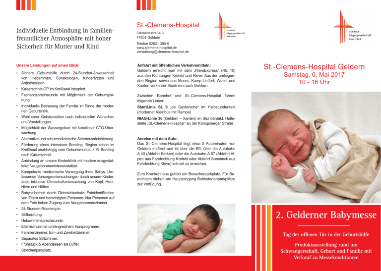 Individuelle Entbindung in familienfreundlicher Atmosphäre mit hoher Sicherheit für Mutter und Kind Unsere Leistungen auf einen Blick: • Sichere Geburtshilfe durch 24-Stunden-Anwesenheit von Hebammen, Gynäkologen, Kinderärzten und Anästhesisten. • Kaiserschnitt-OP im Kreißsaal integriert. • Facharztsprechstunde mit Möglichkeit der Geburtsplanung. • Individuelle Betreuung der Familie im Sinne der modernen Geburtshilfe. • Wahl einer Gebärposition nach individuellen Wünschen und Vorstellungen. • Möglichkeit der Wassergeburt mit kabelloser CTG-Überwachung. • Alternative und schulmedizinische Schmerzerleichterung. • Förderung eines intensiven Bonding. Beginn schon im Kreißsaal unabhängig vom Geburtsmodus, z. B. Bonding nach Kaiserschnitt. • Anbindung an unsere Kinderklinik mit modern ausgestatteter Neugeborenenintensivstation. • Kompetente medizinische Versorgung Ihres Babys. Umfassende Vorsorgeuntersuchungen durch unsere Kinderärzte inklusive Ultraschalluntersuchung von Kopf, Herz, Niere und Hüften. • Babysicherheit durch Diebstahlschutz: Fotoidentifikation von Eltern und berechtigten Personen. Nur Personen auf dem Foto haben Zugang zum Neugeborenenzimmer. • 24-Stunden-Rooming-in. • Stillberatung. • Hebammensprechstunde. • Elternschule mit umfangreichem Kursprogramm. • Familienzimmer, Ein- und Zweibettzimmer. • Separates Stillzimmer. • Frühstück & Abendessen als Buffet. • Storchenparkplatz. St.-Clemens-Hospital Clemensstraße 6 47608 Geldern Telefon 02831 390-0 www.clemens-hospital.de [email protected] Anfahrt mit öffentlichen Verkehrsmitteln: Geldern erreicht man mit dem „NiersExpress“ (RE 10) aus den Richtungen Krefeld und Kleve. Aus der umliegenden Region sowie aus Moers, Kamp-Lintfort, Wesel und Xanten verkehren Buslinien nach Geldern. St.-Clemens-Hospital Geldern Samstag, 6. Mai 2017 10 - 16 Uhr Zwischen Bahnhof und St.-Clemens-Hospital fahren folgende Linien: StadtLinie SL 9 „de Geldersche“ im Halbstundentakt (moderner Kleinbus mit Rampe) NIAG-Linie 36 (Geldern – Xanten) im Stundentakt. Haltestelle „St.-Clemens-Hospital“ an der Königsberger Straße. Anreise mit dem Auto: Das St.-Clemens-Hospital liegt etwa 5 Autominuten von Geldern entfernt und ist über die B9, über die Autobahn A 40 (Abfahrt Kerken) oder die Autobahn A 57 (Abfahrt Alpen aus Fahrtrichtung Krefeld oder Abfahrt Sonsbeck aus Fahrtrichtung Kleve) schnell zu erreichen. Zum Krankenhaus gehört ein Besucherparkplatz. Für Berechtigte stehen am Haupteingang Behindertenparkplätze zur Verfügung. 2. Gelderner Babymesse Tag der offenen Tür in der Geburtshilfe Produktausstellung rund um Schwangerschaft, Geburt und Familie mit Verkauf zu Messekonditionen Informationen zu Schwangerschaft, Geburt und zur Zeit danach Alles andere als langweilig die 2. Gelderner Babymesse Wir freuen uns auf Sie! Liebe Schwangere, liebe Eltern, liebe Interessierte, Geburtshilfe im St.-Clemens-Hospital das Team der Geburtshilfe möchte Sie ganz herzlich zur 2. Gelderner Babymesse am 6. Mai von 10 – 16 Uhr in das St.-Clemens-Hospital Geldern einladen. • Hebammen mit Elternschule und Stllberatung Gemeinsam mit uns präsentieren sich mehr als 20 Dienstleister, Produktanbieter, Sozial- und Beratungseinrichtungen vor dem Eingangsbereich und im Erdgeschoss des Krankenhauses. Informieren Sie sich über Angebote während Ihrer Schwangerschaft und für die Zeit danach, nutzen Sie die Beratungsangebote der Aussteller und shoppen Sie zu attraktiven Messekonditionen auf unserer Babymesse. • Seelsorge • Ärzte und Pflegende der Klinik für Geburtshilfe • Team der Kinderklinik mit vielfältigen Informationen • Förderverein der Klinik für Kinder und Jugendliche Schwangerenfotogafie „Kribbeln im Bauch“ • Babysmile Unsere Teams der Geburtshilfe und der Kinderklinik sind natürlich auch vor Ort. Wir nehmen uns Zeit für Ihre Fragen und laden Sie ein, unsere modernen Kreißsäle, die Neugeborenen- und die Wöchnerinnenstation zu besichtigen. Kreißsaalführungen Gerne zeigen wir Ihnen unsere Kreißsäle, die Neugeborenen- und die Wöchnerinnenstation. Bitte melden Sie sich dazu am Info-Point im Eingangsbereich. Als besonderes Highlight bietet Ihnen unser Kooperationspartner Babysmile die Möglichkeit zur Bauchfotografie. Kinderattraktionen und Leckeres aus unserer Krankenhausküche runden das Angebot ab. Kurzvorträge im Begegnungsraum, Station G 1 (EG) Der Eintritt zu allen Angeboten ist kostenlos. 11:30 Uhr Stillen Hebamme Sabine Toennessen Das Team der Geburtshilfe freut sich, Sie auf der 2. Gelderner Babymesse begrüßen zu dürfen, und verspricht Ihnen einen interessanten und spannenden Samstag. Mit freundlichen Grüßen aus Geldern Das Team der Geburtshilfe im St.-Clemens-Hospital Geldern 11:00 Uhr Hauptpflege von Säuglingen Oberärztin Dr. med. Mirjam Ungerechts 14:00 Uhr Sichere, familienorientierte Geburtshilfe Oberärztin Ursula Wiesel 14:30 Uhr Stillen Hebamme Sabine Toennessen Spaß für die Kleinen mit Hüpfburg, Luftballonkunst, Kinderschminken und Wickeldiplom Speisen und Getränke in der Mitarbeitercafeteria im EG 2. Gelderner Babymesse www.clemens-hospital.de Produktanbieter, u. a. • Baby‘s Best • bücher keuck • Cocolita • Gelderland Apotheke • Maschenwicht • Mayong Tragetücher • Pilzwiese • Pumuckel Kindermoden • Sanitätshaus Kessels • Thermomix Sozial- und Beratungsangebote • AOK • Donum vitae • Hebammenpraxis Lucie Bald • Kinderschutzbund Xanten • Netzwerk „Frühe Hilfe“ • Physiotherapie im Wohlfühlhaus Issum • Sicher im Auto