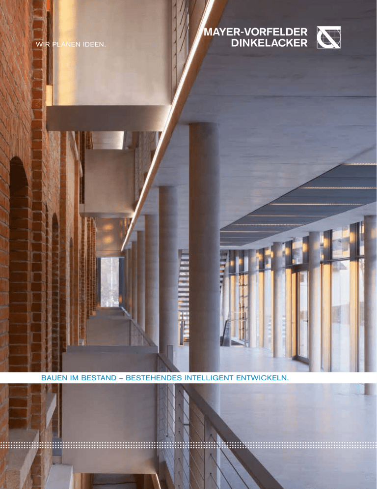 WIR PLANEN IDEEN. bauen im bestand – Bestehendes intelligent entwickeln. 02 | 03 Bauen im Bestand Bestehendes gestalten mit innovativer Planung und zukunftsorientierten Ideen. Der Erhalt, die Sanierung und Entwicklung von Bestandsimmobilien sind heute ein zentrales Thema. Für eine erfolgreiche Revitalisierung steht Mayer-Vorfelder und Dinkelacker mit langjähriger Erfahrung sowie Rat und Tat an Ihrer Seite. Basis erfolgreicher Zusammenarbeit ist dabei ein pro­ fe­ssio­nelles und partnerschaftliches Miteinander aller Planungs- und Baubeteiligten – verbunden mit der Bereit­ schaft, nach vorn gerichtet zu denken und zu handeln. Um so die Vergangenheit neu zu beleben, ohne dabei die Wurzeln zu verlieren. Richtig verstehen – um frei zu gestalten. Erste Aufgabe ist es, den Bestand im Detail kennenzuler­ nen, um im zweiten Schritt daraus stimmige Szenarien für die Sanierungen oder Erweiterung zu planen. Mit dem Ziel, aus alternativen Strategien die richtigen Ent­schei­dungen für das Zukunftspotenzial Ihrer Immobilie treffen zu können. Diese Ideen und Maßnahmen ökonomisch verlässlich und ökologisch sinnvoll zu planen, ist dabei eine unserer Kern­ kompetenzen. Unser Anspruch: Sensibel mit den Ressour­ cen umgehen. Bevor ein Gebäude abgerissen und neu gebaut wird, prüfen wir ganz genau, ob nicht der Erhalt der sinnvollere Weg ist. Rechnen sich Investitionskosten auf die Nutzungsdauer? Schlagen sich höhere Investitio­nen am Anfang eventuell über die Lebensdauer positiv auf laufende Kosten nieder? Gerne aktivieren wir mit Ihnen die Möglichkeiten Ihrer Gebäude. Mit Fingerspitzengefühl und Begeisterung für Neues. Bauen im Bestand: Die Themen im Überblick sanieren ¬ Brandschutz ¬ Nutzlaständerungen ¬ Fundamentverstärkung ¬ Entfernen von Stützen ¬ Ertüchtigung ¬ Unterfangung Erneuern ¬Alte Bauteile werden durch neue ersetzt – Entkernung, Rückbau, Abbruch, Teilabbruch, lokale Erneuerung oder Materialwechsel Ergänzen ¬ Überbauung ¬ Anbauten ¬ Einbauten sicherung 1 2 3 1 | Denkmalschutz: Festspielhaus Baden-Baden 2 | Umbau und Sanierung: Kleines Haus am Staatsschauspiel in Dresden 3 | Umbau bei laufendem Betrieb: M + W Zander in Stuttgart laufender betrieb Denkmalschutz bestandsanalyse 04 | 05 Analyse Im Detail verstehen und konsequent weiterdenken – um erfolgreich Neues zu schaffen. Vorhandenes erfassen und die Substanz auf Herz und Nieren prüfen für maximale Planungssicherheit. So ent­ stehen Ergebnisse, auf die Sie beruhigt bauen können. Tragfähigkeit gleich Zukunftsfähigkeit Wir diagnostizieren die Zukunftsfähigkeit Ihrer Gebäude auf drei unterschiedliche Arten: 1. mithilfe der Bestandsaufnahme vor Ort 2. mittels Versuchsreihen vor Ort 3. auf der Basis von Laboruntersuchungen Die dritte Methode kommt zum Zug, wenn die Beschaffen­ heit und Tragfähigkeit der verwendeten Materialien unklar ist. Mit unserem Partner, dem Sindelfinger Ingenieurbüro für Instandsetzung Zimbelmann GmbH, untersuchen wir dann die Tragfähigkeit von Werkstoffen beispielsweise anhand von am Gebäude gezogenen Bohrkernen im Labor – und schaffen so die solide Grundlage für fundierte Berechnungen. Zuerst prüfen wir jedoch anhand der Bau­ pläne den Soll- und Ist-Zustand der statisch relevanten Konstruktions­ele­mente, um deren Gebrauchsfähigkeit und Tragwerks­sicher­heit zu beurteilen. Bei Bedarf analysieren wir die Herkunft vorhandener Schäden, um nicht die be­ rühmten Symptome, sondern deren Ursachen zu behandeln. Wenn theoretische Überlegungen und Berechnungen nicht weiterführen, wird die bestehende Bausubstanz mit Pro­be­­belastungen beurteilt, indem beispielsweise Deckenkon­ s­truk­­tionen mit Wasserfässern beschwert werden, um das Verhalten unter Last zu testen. Aus diesen Ergebnissen wird dann auf die Tragfähigkeit zurückgeschlossen. Die Ergebnisse bilden die Grundlage für unsere Konzepte und Ihre Entscheidungen. Bei Bedarf arbeiten wir zusammen: 2 1 | Fassade erhalten, Decken erneuert, Erschließungsspange ergänzt: Strickfabrik in Weissach, Architekt: Hansulrich Benz, Weissach 1 3 4 21 | Archivmaterial: Bosch-Areal in Stuttgart 32 | Umbau des histo­ rischen Gebäudes mit Hörsälen und Bibliothek: Fachhochschule Stuttgart 43 | Belastungsversuche zur Deckentragfähigkeit mit Beton: Bosch-Areal in Stuttgart 06 | 07 Sanieren modern sanieren bedeutet, Bestehendes gekonnt zu Erneuern. Alter, Lebensweise und Umwelteinflüsse verändern das Gesicht der Menschen – der Charakter bleibt meist erhal­ ten. Ebenso ist es bei Gebäuden: Ihre Nutzung unterliegt veränderten Erwartungen sowie technischem und gesell­ schaftlichem Wandel. Unser Anspruch: Sanieren, ohne die architektonische Idee zu beeinträchtigen oder gar zu ver­ lieren. Und gleichzeitig zeitgemäße Akzente setzen. So kom­ biniert sich Bewährtes mit Neuem auf überzeugende Art. Dabei gilt der Grundsatz: Das Ganze ist mehr als die Summe seiner Teile. Die Anforderungen der Zukunft Anforderungen und Vorschriften für Brandschutz und Lärmschutz werden immer komplexer und umfangreicher – aus guten Gründen der Sicherheit und Gesundheit. Neunzig Minuten müssen Gebäude Flammen standhalten – um im Notfall Leben zu retten. Ihren Bestand optimieren wir genau dort, wo kleine Ur­sachen große Wirkung erzielen. Nicht nur, um Katas­trophen zu verhindern, sondern um effiziente und sinnvolle Nutzungs­möglichkeiten zu schaffen. Oft sind es genau die tech­nischen Anforderungen an ein bestehendes Gebäude, die flexible Nutzungsszenarien ermöglichen – oder verhindern. 4 4 | Umbau, Sanierung und Neubau: Diagnostisch-Internistisch-Neurologisches Zentrum, Universitätsklinik in Dresden Architekten: HWP Planungsgesellschaft, Stuttgart; Arcass Gesellschaft für Bauplanung mbH, Stuttgart Der konstruktiven Besonderheit Ihres Bestandes begegnen wir mit der richtigen Mischung aus Kreativität, Erfahrung, Know-how und Respekt. moderne sanierung SCHALLSCHUTZ, Energetik 4 3 2 1 Bestand Neubau 