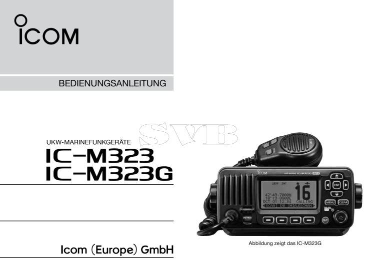 BEDIENUNGSANLEITUNG UKW-MARINEFUNKGERÄTE iM323 iM323G Abbildung zeigt das IC-M323G VORWORT WICHTIG Vielen Dank, dass Sie dieses Icom-Produkt erworben haben. Wir haben die UKW-Marinefunkgeräte IC-M323/IC-M323G mit unserer erstklassigen Technologie in her­ vor­ ragender Verarbeitungs­qualität gefertigt. Bei richtiger Be­nut­zung sollte Ihr Funkgerät jahrelang einwandfrei funktionieren muss. LESEN SIE ALLE BEDIENUNGSHINWEISE vor Inbetriebnahme sorgfältig und vollständig durch. BEWAHREN SIE DIE BEDIENUNGSANLEITUNG AUF. Sie enthält wichtige Hinweise für den Betrieb der Marinefunkgeräte. DDBESONDERHEITEN ❍ Dank großer Tasten gut bedienbar EXPLIZITE DEFINITIONEN ❍ Gute Klangqualität ❍ Eingebauter DSC-Controller, der den Erfordernissen der ITU-Klasse D entspricht ❍ Wasserdichte Konstruktion ❍ Einfaches Senden von individuellen DSC-Rufen mit dem optionalen Class-B-AIS-Transponder MA-500TR ❍ Eingebauter GPS-Empfänger * RWARNUNG! VORSICHT HINWEIS BEDEUTUNG erletzungen, Feuergefahr oder V elektrische Schläge sind möglich. Das Gerät kann beschädigt werden. alls angeführt, beachten Sie ihn bitte. F Es besteht kein Risiko von Verletzung, Feuer oder elektrischem Schlag. *nur IC-M323G Icom, Icom Inc. und das Icom-Logo sind registrierte Marken der Icom Inc. (Japan) in Japan, in den Vereinigten Staaten, im Vereinigten Königreich, in Deutschland, Frankreich, Spanien, Russland und/oder in anderen Ländern. i BEGRIFF REINIGEN SIE DAS FUNKGERÄT UND DAS MIKRO­FON SORGFÄLTIG MIT KLAREM WASSER, falls es mit Was­ ser, einschließlich Salzwasser, in Berührung gekom­men ist. Andernfalls können die Tasten und Schalter durch auskris­ tallisierendes Salz unbedienbar werden. IM NOTFALL INSTALLATIONSHINWEISE Wenn Sie Hilfe benötigen, kontaktieren Sie andere See­funk­­ stellen und die Küstenfunkstelle durch Absetzen eines Not­ alarms über DSC (Digitales Se­lek­tiv­rufverfahren) auf K ­ anal 70. Installation: Die Installation der Funkanlage muss so erfol­gen, dass die Grenzwerte für elektromagnetische Feldstärken gemäß Richt­­­­linie 1999/519/EG eingehalten werden. DSC-NOTALARMIERUNG (Kanal 70) ANRUFVERFAHREN 1.Schutzkappe anheben und die [DISTRESS]-Taste 3 Sek. lang gedrückt halten, bis 3 kurze Signaltöne und ein langer Signalton zu hören sind. 2.Warten Sie die Quittierung durch eine Küstenfunkstelle ab. • Kanal 16 wird danach automatisch eingestellt. 3.Den Notalarm wie unten beschrieben über Sprechfunk durchgeben. Dazu die [PTT]-Taste gedrückt halten. Sie können den Notalarm auch über Kanal 16 absetzen. NOTALARM ÜBER KANAL 16 ANRUFVERFAHREN 1. „MAYDAY MAYDAY MAYDAY.“ 2. „HIER IST ...............“ (Schiffsname) 3.Ihr Rufzeichen oder eine andere Schiffskennung (UND die 9-stellige DSC-ID, falls Sie eine haben). 4. „MEINE POSITION IST ...............“ (Ihre Position) 5. Grund des Notalarms (und evtl. Hilfe erforderlich) 6.Weitere dienliche Details durchgeben. Die maximale Sendeleistung dieser Funkanlage beträgt 25 W. Um eine größtmögliche Reichweite zu erzielen, sollte die Antenne so hoch wie möglich angebracht werden. Dabei sollte die Mindesthöhe über Grund 1,5 m betragen. Sollte es nicht möglich sein, die Antenne in ausreichender Höhe zu ins­tallieren oder sollten sich Personen im Umkreis von 1,5 m zur Antenne aufhalten, darf mit der Funkanlage nicht über längere Zeit gesendet werden. Senden Sie niemals, wenn Personen die Antenne berühren! Es wird angeraten, eine Antenne mit maximal 3 dB Gewinn zu verwenden. Sollte es erforderlich sein, eine Antenne mit einem höheren Gewinn einzusetzen, wenden Sie sich bitte an Ihren Icom-Händler, der Sie über die Besonderheiten der Antenneninstallation und die Sicherheitsabstände informieren kann. Betrieb: Funkgeräte bzw. -anlagen erzeugen nur während des Sendens hochfrequente elektromagnetische Felder, deren Mittelwerte ganz entscheidend vom Sende-Empfangs-Verhältnis abhängen. Wenn man Wert auf geringe Belastungen der Umgebung legt, kann man versuchen, die Sendezeiten so kurz wie möglich zu halten. ii SICHERHEITSHINWEISE RWARNUNG! NIE das Funkgerät direkt über Wechsel­ strom (AC) versorgen. Dadurch könnten Brandgefahr entste­ hen und Stromschläge verursacht werden. RWARNUNG! NIE das Funkgerät mit mehr als 16 V DC VERMEIDEN Sie die Reinigung des Funkgeräts mit chemischen Mitteln wie z. B. Benzin oder Alkohol, da die Ge­ häuse­oberfläche dadurch beschädigt werden könnte. Bei Verschmutzungen oder Staub wischen Sie das Funk­gerät nur mit einem weichen, trockenen Tuch ab. RWARNUNG! NIE das Funkgerät verpolt an die Span- difizieren. versorgen. Das Funk­gerät wird dadurch beschädigt. nungsversorgung anschließen. Das Funk­gerät wird dadurch beschädigt. RWARNUNG! NIE die Kabelsicherungen des Stromversorgungskabels durch Kürzen des Kabels entfernen. Bei einem fehlerhaften Anschluss an die Spannungsversorgung könnte das Funk­gerät beschädigt werden. ACHTUNG: NIE das Funkgerät so einbauen, dass die Schiffsführung dadurch behindert wird oder Verletzungsgefahr entsteht. HALTEN Sie beim Einbau des Funkgeräts einen Sicher­ heitsabstand von mindestens 1 Meter zu magnetischen Na­ vi­­gationsinstrumenten. VERMEIDEN Sie den Betrieb oder das Aufstellen des Funkgeräts an Orten mit Umgebungstemperaturen unter –20 °C oder über +60 °C sowie dort, wo es direkter Sonnen­ ein­strahlung ausgesetzt ist. iii NIEMALS das Funkgerät auseinandernehmen oder moVORSICHT! Bei längerem ununterbrochenen Sende­be­trieb wird die Rückseite des Funkgeräts heiß. Achten Sie darauf, dass das Funkgerät für Kinder nicht un­ beaufsichtigt zugänglich ist. VORSICHT! Das Funkgerät ist wasserdicht nach IPX7*. Unabhängig davon kann Wasserbeständigkeit nicht mehr garantiert werden, wenn das Funkgerät auf den Boden fallen ge­lassen wurde, da dabei die Gehäuse oder die Dichtungen beschädigt wer­den können. * außer Stromversorgungsanschluss, NMEA-Ein-/Ausgangsleitungen und NF-