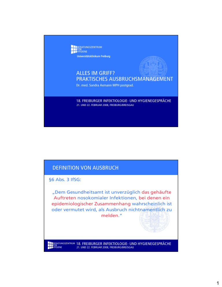 B Universitätsklinikum Freiburg ALLES IM GRIFF? PRAKTISCHES AUSBRUCHSMANAGEMENT Dr. med. Sandra Axmann MPH postgrad. 18. FREIBURGER INFEKTIOLOGIE- UND HYGIENEGESPRÄCHE 21. UND 22. FEBRUAR 2008, FREIBURG/BREISGAU DEFINITION VON AUSBRUCH §6 Abs. 3 IfSG: „Dem Gesundheitsamt ist unverzüglich das gehäufte Auftreten nosokomialer Infektionen, bei denen ein epidemiologischer Zusammenhang wahrscheinlich ist oder vermutet wird, als Ausbruch nichtnamentlich zu melden.“ B 18. FREIBURGER INFEKTIOLOGIE- UND HYGIENEGESPRÄCHE 21. UND 22. FEBRUAR 2008, FREIBURG/BREISGAU 1 AUSBRUCH ERKENNEN • Auffällige Häufung von Erkrankungen mit ähnlichen Symptomen bzw. Erreger (MRSA, VRE, ESBL, Streptokokken Gruppe A) • Isolierte Infektion durch einen multiresistenten Erreger • Surveillance • „Pseudoausbrüche“ Ammon, Krankenhaushygiene up2date 2007; 2: 217-230 B 18. FREIBURGER INFEKTIOLOGIE- UND HYGIENEGESPRÄCHE 21. UND 22. FEBRUAR 2008, FREIBURG/BREISGAU ANFORDERUNGEN AN DIE HYGIENEABTEILUNG • Epidemiologische Risikobewertung unter hohem Zeitdruck • Schnelle Kontrolle -> Patientengefährdung minimieren • Ausbruch stoppen, Ursache ermitteln, Maßnahmen ergreifen • Vorkehrungen treffen für zukünftige Prävention B 18. FREIBURGER INFEKTIOLOGIE- UND HYGIENEGESPRÄCHE 21. UND 22. FEBRUAR 2008, FREIBURG/BREISGAU 2 STRUKTURELLE / ORGANISATORISCHE VORAUSSETZUNGEN • Zusammensetzung Ausbruchsmanagementteam • Informationsfluss strukturieren: Öffentlichkeitsarbeit Gesundheitsamt Belegschaft • Festlegen der Untersuchungskapazitäten • Unterbringung und Betreuung von Betroffenen regeln RKI, Bundesgesundheitsblatt 2002; 45: 180-186 B 18. FREIBURGER INFEKTIOLOGIE- UND HYGIENEGESPRÄCHE 21. UND 22. FEBRUAR 2008, FREIBURG/BREISGAU AUSBRUCHSMANAGEMENTTEAM Krankenhaushygieniker Hygienebeauftragte Ärzte Hygienefachkraft Mikrobiologe Klinik- und Pflegeleitung Mitarbeiter der betroffenen Stationen/Bereiche Mitarbeiter des Gesundheitsamtes Ansprechpartner für die Presse B 18. FREIBURGER INFEKTIOLOGIE- UND HYGIENEGESPRÄCHE 21. UND 22. FEBRUAR 2008, FREIBURG/BREISGAU 3 AUFGABEN DES AUSBRUCHSMANAGEMENTTEAMS Regelmäßige Treffen zum Infoaustausch Hauptkoordinator bestimmen Verantwortungsbereiche, Aufgaben und Kompetenzen innerhalb der Teammitglieder festlegen Pressearbeit „Logbuch“ erstellen B 18. FREIBURGER INFEKTIOLOGIE- UND HYGIENEGESPRÄCHE 21. UND 22. FEBRUAR 2008, FREIBURG/BREISGAU ÖFFENTLICHKEITSARBEIT NUR EINE PERSON INFORMIERT ! Aktiv informieren: - Unangenehme Nachrichten proaktiv weiterleiten - Unklarheiten oder noch unbekannte Zusammenhänge als solche deutlich machen - Regelmäßige Info an die Öffentlichkeit B 18. FREIBURGER INFEKTIOLOGIE- UND HYGIENEGESPRÄCHE 21. UND 22. FEBRUAR 2008, FREIBURG/BREISGAU 4 VORGEHEN BEI EINER AUSBRUCHSUNTERSUCHUNG Ortsbesichtigung Laboruntersuchungen (Proben von Patienten, Geräte, Lösungen, etc.) Epidemiologische (deskriptive/analytische) Untersuchung B 18. FREIBURGER INFEKTIOLOGIE- UND HYGIENEGESPRÄCHE 21. UND 22. FEBRUAR 2008, FREIBURG/BREISGAU ORTSBEGEHUNG Umgehende Begehung aller Räumlichkeiten des Bereichs Erkennung von Schwachstellen Hinweise von Personal vor Ort Präventionsmaßnahmen Schulung B 18. FREIBURGER INFEKTIOLOGIE- UND HYGIENEGESPRÄCHE 21. UND 22. FEBRUAR 2008, FREIBURG/BREISGAU 5 MÖGLICHE KONTROLLMAßNAHMEN Diarrhoe/Erbrechen MRE - - HD nach Patientenkontakt - Tragen von Handschuhen, MNS und Kittel bei Pflege - Einzelisolierung/Kohorteniso - Zuordung von Pflegepersonal - Ggf. Dekolonisierung - Bei Verlegung: Info an Zieleinrichtung - (Ggf. Personalscreening) Stopp von Neuaufnahmen Besucherverbot Arbeitsverbot Personal HD nach Patientenkontakt Pat.-Bewegung in andere Abteilungen begrenzen - Zuordnung von Reinigungsund Versorgungspersonal - erweiterte Flächendesinfektion (evtl. DM ändern) B 18. FREIBURGER INFEKTIOLOGIE- UND HYGIENEGESPRÄCHE 21. UND 22. FEBRUAR 2008, FREIBURG/BREISGAU DIAGNOSESICHERUNG Probenumfang, Untersuchungsmethode und Art des mikrobiologischen Materials festlegen (ggf. sichern) Erregerisolate bis zur Speziesebene bestimmen Erreger-Typisierung je nach Situation erwägen -> Kontaktaufnahme mit entsprechendem NRZ B 18. FREIBURGER INFEKTIOLOGIE- UND HYGIENEGESPRÄCHE 21. UND 22. FEBRUAR 2008, FREIBURG/BREISGAU 6 DESKIPTIVE EPIDEMIOLOGIE Weitergehende Literaturrecherche - Symptome - Inkubationszeit - Übertragungsweg - Untersuchungsmöglichkeiten - Frühere Ausbrüche Falldefinition- Fallsuche Zusammenführung der Information Graphische Darstellung B 18. FREIBURGER INFEKTIOLOGIE- UND HYGIENEGESPRÄCHE B 18. FREIBURGER INFEKTIOLOGIE- UND HYGIENEGESPRÄCHE 21. UND 22. FEBRUAR 2008, FREIBURG/BREISGAU 21. UND 22. FEBRUAR 2008, FREIBURG/BREISGAU 7 DESKIPTIVE EPIDEMIOLOGIE Falldefinition und ggf. Fallsuche - Klinische/Laborkriterien (Symptomatik, Erregernachweis) - Definierter Zeitraum (Tag, Woche, Monat) - Ortsangabe (Station, Abteilung, Krankenhaus) - Personeneigenschaften (Alter, Geschlecht, Beruf) Zusammenführung der Information Graphische Darstellung B 18. FREIBURGER INFEKTIOLOGIE- UND HYGIENEGESPRÄCHE 21. UND 22. FEBRUAR 2008, FREIBURG/BREISGAU STANDARDISIERUNG DER DATENERHEBUNG Demographische Daten (Namen, Geb.datum, Geschlecht) Klinische Symptome (Art, Beginn/Ende, Ausprägung) Zeit (Aufnahmedatum, Entlassung) Ort (Abteilung, Station, Krankenhaus) Grund-/Begleiterkrankung Labor (Entnahmedatum, Material, Methode, Laborname) Untersuchung/Eingriffe weitere Kriterien der Falldefinition B 18. FREIBURGER INFEKTIOLOGIE- UND HYGIENEGESPRÄCHE 21. UND 22. FEBRUAR 2008, FREIBURG/BREISGAU 8 DESKIPTIVE EPIDEMIOLOGIE Zusammenführung der Information - Urliste bzw. „line list“ Graphische Darstellung B 18. FREIBURGER INFEKTIOLOGIE- UND HYGIENEGESPRÄCHE 21. UND 22. FEBRUAR 2008, FREIBURG/BREISGAU DESKIPTIVE EPIDEMIOLOGIE Graphische Darstellung - Histogramm (Epidemie-Kurve) - Räumliche Beurteilung - Personen eingrenzen B 18. FREIBURGER INFEKTIOLOGIE- UND HYGIENEGESPRÄCHE 21. UND 22. FEBRUAR 2008, FREIBURG/BR