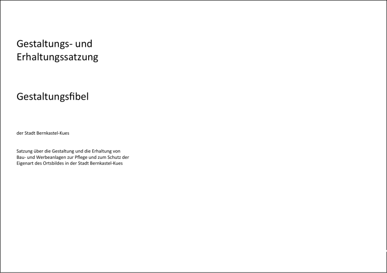 Gestaltungs- und Erhaltungssatzung Gestaltungsfibel der Stadt Bernkastel-Kues Satzung über die Gestaltung und die Erhaltung von Bau- und Werbeanlagen zur Pflege und zum Schutz der Eigenart des Ortsbildes in der Stadt Bernkastel-Kues Impressum Herausgeber: Stadt Bernkastel-Kues Mandatstr. 1 54470 Bernkastel-Kues Redaktion, Fotografie und Layout: Entwicklungsagentur Bernkastel-Kues e.V. Mandatstr. 2 54470 Bernkastel-Kues Systemzeichnungen und Fotografie: Architekturbüro Peter R. Berdi Schanzstr. 10 54470 Bernkastel-Kues Bernkastel-Kues, Juli 2011 2 Grußwort des Stadtbürgermeisters Der unverwechselbare historische Grundriss der Stadt Bernkastel-Kues und ihr umfangreicher, zum größten Teil gut erhaltener Baubestand gehören zu unseren wichtigen Zukunftspotenzialen. Die Identität und die Schönheit des gewachsenen städtischen Ensembles zählen heute, wo ausdrucksschwache Architektur mit umso wirkungsmächtigeren Werbeeinrichtungen und dem immer gleichen Geschäftsbesatz viele Städte zunehmend austauschbar machen, zu den entscheidenden Standortfaktoren. Auch als Wohnstandort profitiert die Stadt Bernkastel-Kues von einem lebendigen, kulturell vielseitigen Wohnumfeld. tungsfibel alle Akteure der Stadt davon überzeugen, dass eine attraktive Gestaltung im Sinne eines geschlossenen Erscheinungsbildes der Stadt ein wichtiger Wettbewerbsvorteil für jeden einzelnen sein kann. Dieses historische Erbe ist stets gefährdet: durch Gedankenlosigkeit, fehlende Mittel oder ein schwach ausgeprägtes historisches Bewusstsein. Die Stadt Bernkastel-Kues möchte mit der vorliegenden Gestaltungs- und Erhaltungssatzung dazu beitragen, dass sowohl bei Neu- und Umbaumaßnahmen als auch bei Veränderungen im historischen Bestand gestalterische Aspekte berücksichtigt werden. Vor allem den Immobilieneigentümern und Geschäftsbetreibern im Geltungsbereich der Satzung kommt eine Schlüsselrolle zu, damit die Vielfalt der Ladenlokale und Einrichtungen sowie der besondere Charme der Stadt erhalten bleibt. Wolfgang Port Stadtbürgermeister Bernkastel-Kues Ich möchte an dieser Stelle allen danken, die die von der Stadt getroffenen Entscheidungen nicht nur befolgen, sondern diese aus Überzeugung mittragen und mit Leben füllen. Das Leben und Arbeiten in und mit der historischen Bausubstanz fordert in besonderem Maße Rücksichtnahme und Regeln. Die Aufgabe, ja die Kunst besteht darin, Regeln einerseits hinreichend klar zu definieren, um unerwünschten Entwicklungen gegenzusteuern, andererseits die grundsätzlich erwünschte Entfaltungsfreiheit und Nutzungsvielfalt nicht unnötig zu reglementieren. So soll diese Satzung und im Besonderen die Gestal3 Grußwort des Stadtbürgermeisters Inhaltsverzeichnis Inhaltsverzeichnis Gestaltungs- und Erhaltungssatzung Gestaltungsfibel (Leitfaden für Immobilieneigentümer, Geschäftsinhaber und Bauherrn) Präambel Erster Abschnitt: Umfang und Reichweite der Regelungen §1 Sinn und Zweck der Satzung Räumlicher Geltungsbereich § 2 § 3 Sachlicher Geltungsbereich und Genehmigungspflicht Zweiter Abschnitt: Allgemeine Gestaltungsvorschriften § 4 Gliederung der Baukörper Dritter Abschnitt: Anforderung an die bauliche Gestaltung § 5 §6 § 7 § 8 §9 § 10 § 11 § 12 § 13 § 14 § 15 Dachlandschaft Fassaden Materialien Farben Fenster, Türen, Rollläden, Fensterläden Schaufenster Markisen Außentreppen Freileitungen, Antennen, Sonderanlagen Einfriedungen Ausstattungselemente Vierter Abschnitt: Werbeanlagen § 16 Begriffe § 17 Allgemeine Anforderungen an Werbeanlagen § 18 Werbung auf Fassadenflächen § 19 Werbeanlagen als Ausleger § 20 Werbung auf Fensterflächen § 21 Plakate § 22 Werbung auf Baugerüsten § 23 Automaten Fünfter Abschnitt: Verwaltungsvorschriften § 24 § 25 § 26 Ausnahmen und Befreiungen Ordnungswidrigkeiten Inkrafttreten Anhang Begründung der Geltungsbereiche Anlage 1 - Geltungsbereich Andel Anlage 2 - Geltungsbereich Bernkastel und Kues Anlage 3 - Geltungsbereich Alt Kues Anlage 4 - Geltungsbereich Wehlen 4 Die an der Überarbeitung beteiligten Stellen – Stadtrat Bernkastel-Kues, der von ihr beauftragte Sanierungsplaner, die Entwicklungsagentur Bernkastel-Kues e.V. sowie die Verbandsgemeindeverwaltung – haben jede Vorschrift einer kritischen Überprüfung unterzogen, wobei keine der Regelungen als verzichtbar angesehen werden konnte. Das Ziel der Verringerung und Vereinfachung konnte also nicht erreicht werden. Ein historiIm Jahr 1995 hatte der damalige Stadtrat von Bernkastel-Kues bereits erkannt, dass das einzigartige Stadtbild sches Stadtbild lebt nun einmal von den vielen kleinen Details, die wie ein Mosaik erst in der Gesamtheit ihre von Bernkastel-Kues mit seiner über 1.000-jährigen Wirkung entfalten. Geschichte eines besonderen Schutzes bedarf. Dies Insofern sind die einzelnen Regelungen dem Grunde zum einen, um den städtebaulich-architektonischen nach erhalten geblieben, wurden jedoch entsprechend Reichtum als Zeugnis jahrhundertealten Bauschaffens, der Erfahrungen aus der Vergangenheit sowie geänder auch die Identität der Stadt ausmacht, für die derter (z.B. energetischer) Anforderungen verbessert. kommenden Generationen zu erhalten. Zum anderen Im Zuge der Überarbeitung wurde auch der Geltungsaber auch, um der Tatsache Rechnung zu tragen, dass für die „Internationale Stadt der Rebe und des Weines“ bereich der Satzung nochmals überprüft und, wo erforderlich, angepasst. Außerdem wurden aufgrund der Tourismus die wichtigste Lebensgrundlage darstellt und das Stadtbild hierfür wiederum ein entscheidender der städtebaulichen Gewichtung des Baubestandes zwei Bereiche mit verschiedenen Einzelfestlegungen Standortfaktor ist. unterschieden und in den Übersichtskarten entspreWeiterhin hatte die Stadt Bernkastel-Kues durch Auschend farblich dargestellt: weisung der Sanierungsgebiete „Altstadt Bernkastel“ und „Bahnhof Kues“ im Jahr 1989 eine besondere städ- Bereich 1 - In diesem Bereich wurden die historisch wertvollst
