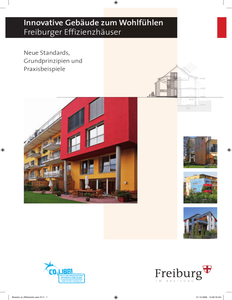 Innovative Gebäude zum Wohlfühlen Freiburger Effizienzhäuser Neue Standards, Grundprinzipien und Praxisbeispiele Broschu re_Effizienzha user 27.i1 1 21.12.2009 14:49:18 Uhr Inhalt Teil 1: Einleitung Vorwort des Oberbürgermeisters 1 Freiburger Effizienzhaus-Standards 2 Teil 2: Energieoptimiertes Bauen Was macht ein Passivhaus aus 5 Fachliche Grundlagen 6 Teil 3: Praxisbeispiele Übersicht Vauban 16 Übersicht Freiburg 18 „Kleehäuser“ 20 Einfamilienhaus in Munzingen 22 Die Reihenhäuser „Gute Aussichten“ 24 Sanierung Risler Str. 1-5 und 7-13 26 Sanierung Lorettostr. 30 28 Städtisch öffentliche Gebäude in Passivhausbauweise 30 Teil 4: Info- und Serviceteil Broschu re_Effizienzha user 27.i2 2 Informationen zum Thema energieeffizientes Bauen in Freiburg 32 Förderprogramme: Eine Übersicht 33 Literaturverzeichnis 34 Webseitenverzeichnis 35 Impressum 36 21.12.2009 14:49:24 Uhr Nachhaltig planen und vorausschauend bauen Der weltweite Klimawandel ist für alle Städte und Gemeinden eine der größten Herausforderungen unserer Zeit, der wir mit kommunalen Konzepten begegnen müssen. Die Minderung der CO2-Emissionen wird mehr denn je ein Schlüssel für die künftige Lebensfähigkeit unserer Stadt. Ein wichtiger Baustein sind dabei wirksame Energiesparkonzepte für Gebäude. Der Gemeinderat hat für 2009 die stufenweise Einführung des Freiburger Effizienzhaus-Standards beschlossen. Mit der Definition energetischer Standards für Neubauten um rund 30 Prozent unter den bundesgesetzlich normierten Grenzwerten wird die Stadt Freiburg bundesweit ihrer Vorreiterrolle im Klimaschutz gerecht. Die Freiburger EffizienzhausStandards sind damit ein zentraler Baustein des städtischen Klimaschutzkonzepts und tragen zu einer Reduktion fossiler Energien bei. Freiburger Effizienzhäuser entsprechen dem international bekannten Passivhaus-Standard und bieten mehrere Vorteile: Sie tragen aktiv zu einer Senkung der CO2-Emissionen bei. Sie bieten einen hohen Wohnkomfort und garantieren als wirtschaftlichen Vorteil niedrige Heizenergiekosten. Schließlich ist ein Passivhaus eine besonders hochwertige Immobilie mit einem im Vergleich zu herkömmlichen Gebäuden exzellenten Wiederverkaufswert. Seit 2009 baut die Stadt Freiburg auch alle öffentlichen Gebäude in Passiv­haus­bauweise und setzt damit Standards für alle weiteren Gebäude: Die Erweiterung der Wentzinger-Schulen im Stadtteil Mooswald und der Neubau der Feyel-Grundschule in Ebnet wurden vollständig in Passivhausbauweise realisiert. Als weiteres großes Projekt steht die Haupt­ feuer­wache an der Eschholzstrasse an, die mit Passivhauskomponenten er­wei­tert wird. Dies sind richtungsweisende Projekte, die ein gesundes Arbeitsklima bieten und Energiekosten und CO2-Ausstöße deutlich verringern. In den vergangenen Jahren sind in den Stadtteilen Vauban und Rieselfeld rund 5.000 Wohneinheiten nach dem Freiburger Niedrigenergiehaus-Standard realisiert worden. Hinzu kommen 270 Wohneinheiten in Passivhausbauweise. Viele Vorhaben wurden vom renommierten Passivhausinstitut in Darmstadt wissenschaftlich untersucht. Die Ergebnisse belegen, dass sich qualifiziert geplante und gebaute Passivhäuser in der Praxis bewähren. An diese Erfahrungen knüpfen wir nun an. Diese Broschüre gibt einen Überblick über bereits realisierte energie­ effiziente Gebäude. Sie informiert über die Passivhausbauweise von der Haustechnik bis zu den Erfahrungen der BewohnerInnen. Zahlreiche vorbildliche Projekte belegen, dass Ökologie, Wirtschaftlichkeit und hoher Wohnkomfort bestens miteinander vereinbar sind. Dr. Dieter Salomon Oberbürgermeister Stadt Freiburg im Breisgau 1 Broschu re_Effizienzha user 27.i3 3 21.12.2009 14:49:28 Uhr 1 1 Die Freiburger Effizienzhaus-Standards Stufenplan und Baugebiete Seit dem 1. Januar 2009 gilt ein Stufenplan für die Anhebung der energetischen Standards bei Neubauten mit überwiegender Wohnnutzung in Freiburg. Die Stadtverwaltung machte diesen Schritt nach guten Erfahrungen mit der Niedrigenergiebauweise, besonders in den Stadtteilen Rieselfeld und Vauban. Die Freiburger Effizienzhaus-Standards ersetzen ab 2009 den NEH-Standard 2005. Die Freiburger Effizienzhaus-Standards orientieren sich am international bekannten Passivhausstandard. Sie werden in zwei zeitlichen Stufen, 2009 und 2011, eingeführt. Dieser Stufenplan mit festgelegten Zeitpunkten soll der Bau- und Wohnungswirtschaft Zeit für die Umstellung geben. 1. Stufe 2009 Stufenplan Freiburger Effizienzhaus-Standard Freiburger Stadtbau GmbH Gebäudemanagement Freiburg Kaufverträge 40 2010 Effizienzhaus 40 Anforderungen an die Freiburger EffizienzhausStandards 40 Effizienzhaus 40 60 40 60 60 Effizienzhaus 60 Städtebauliche Verträge 2. Stufe 2011 2012... Effizienzhaus 60 Effizienzhaus 40 Effizienzhaus 60 Freiburger Freiburger Effizienzhaus 60 Effizienzhaus 40 Primärenergie- max. 60% des max. 40% des bedarf Anforderungswerts Anforderungswerts nach EnEV2009 nach EnEV2009 spezifische max. 85% des max. 70% des Transmissions- Rechenwerts* Rechenwerts* verluste Lüftung Lüftungsanlage mit Wärmerückgewinnung, Effizienz > 75% Luftdichtigkeit max n50 <= 0,60 1/h * Rechenwert nach Referenzgebäudeverfahren nach EnEV 2009 2 Broschu re_Effizienzha user 27.i4 4 Der Freiburger Effizienzhausstandard 60 wird festgelegt R in städtebaulichen Verträgen für private Wohnbaugrundstücke in neuen Bebauungsplänen (Offenlagebeschluss nach dem 31.12.2008) sowie R in Kaufverträgen für städtische Wohnbaugrundstücke, die vor dem 01.01.2011 geschlossen werden. Hiervon ausgenommen sind die PassivhausPilotgebiete (s.u.), die Bebauungsplangebiete Rieselfeld, Vauban und Innere Elben und die Kaufverträge, die auf der Grundlage einer noch im Jahr 2008 veröffentlichten Ausschreibung geschlossen werden. Der Freiburger Effizienhausstandard 40 wird festgelegt R für Neubauten der Stadt Freiburg: Gebäudemanagement und Freiburger Stadtbau GmbH, R in Kaufverträgen für städtische Wohnbaugrundstüc