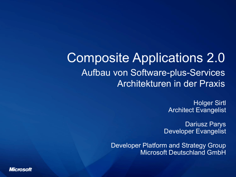 Composite Applications 2.0 Aufbau von Software-plus-Services Architekturen in der Praxis Holger Sirtl Architect Evangelist Dariusz Parys Developer Evangelist Developer Platform and Strategy Group Microsoft Deutschland GmbH Agenda • Anforderungen des Marktes • Definition von Software-plus-Services • Azure – Microsofts Cloud Plattform • Herausforderungen bei Software-plus-Services Lösungen • Antworten mit Microsoft Azure Anforderungen des Marktes + SaaS Geschäftsmodelle Betrieb Web 2.0 User Experience + SOA Services Mashups Integration von InternetDiensten Software + Services Lokal betriebene Software kombiniert mit Cloud Services • User Experience • Verschiedene Endgeräte • OfflineFähigkeit • Flexible Konfiguration (Funktionalität) • Vertrauen • Regularien • Unternehmens -kritische Anwendungen Betrieb vor-Ort Betrieb bei einem Dienstleister Client Server Services Vor-Ort Software Cloud Services • Skalierbarkeit • Flexible Bezahlung / alternative Bezahlmodelle • Flexible Bereitstellung • Kurze Time-toMarket Software-plus-Services Flexibilität bei der Wahl des Betriebsmodells Betrieb vor-Ort Betrieb bei einem Hoster • Eigene Hardware • Eigenes Rechenzentrum • Rechenzentrum des Hosters • Spezifikation der Hardware Software Betrieb auf Azure • Rechenzentren des Plattformanbieters • Spezifikation von Service Leveln Services Möglichkeiten zu individuellen Anpassungen Skaleneffekte Software in der Cloud Neue Herausforderungen • Eigenschaften der Cloud: – Scale-out (Einsatz massiv-redundanter Standard-Hardware) – Hardwarekomponenten können ausfallen (Ausfallsicherheit muss in die Software) – Hohe Verfügbarkeitsanforderungen (24 x 7) • Auswirkungen auf: – Softwarearchitektur – Softwareaktualisierungen – Betrieb (Überwachung und Fehlersuche) Microsoft Azure Plattform für Partner- und Microsoft-Dienste Partner Lösungen Azure Services Platform ™ Microsoft Infrastruktur (Rechenzentren etc.) Software-plus-Services Durchgängigkeit der Microsoft Plattform Betrieb vor-Ort Betrieb bei einem Hoster Kunden- und Parterlösungen Kunden- und Partnerlösungen Betrieb auf Azure Kundenund Partnerlösungen Microsoft Application Platform (BizTalk Server, SQL Server, SharePoint Server, …) Software Services Möglichkeiten zu individuellen Anpassungen Skaleneffekte MS Live MS Online Windows Azure Betriebssystem für die Cloud • Gleiche Funktionalitäten, die ein Desktop-OS bietet, nur auf einer Menge vernetzter Server: – Ausführungsumgebung für Anwendungen – Dateisystem, das sich mehrere Anwendungen teilen – Ressourcenzuordnung – Programmierumgebung • Und darüber hinaus: Utility Computing – 24*7 Betrieb – “Pay for what you use” – Einfache, intuitive Administration Entwicklung von Cloud Services • In einer lokalen Entwicklungsumgebung (mit vollen Zugriff auf die Umgebung) – Entwicklung – Testen – Debugging • In der Cloud Umgebung – Betrieb und Überwachung – Management und Konfiguration – Aktualisierungen Softwareaktualisierung in der Cloud Aktualisierungen von Code und Datenschema • Herausforderung: – Rollback eines fehlgeschlagenen Deployments ist schwierig bis unmöglich • Lösung: – Nur Code- oder nur Datenupdate – Versionsnummern im Datenschema Code Vn+1 Code Vn Schema Vn Schema Vn Code Vn Code Vn+1 Schema Vn+1 Schema Vn+1 Softwareaktualisierung in der Cloud Aktualisierungen ohne Downtime • Herausforderung: – 24 x 7 Anforderungen Development • Lösung: – Stop + Start, bei größeren Änderungen oder wenn Downtimes akzeptabel sind – Azure: Rolling Updates und Staging-Umgebung Stage Deployment Production Deployment Betrieb von Cloud Services Konfigurierbares Logging und Tracing mit Alerts • Herausforderung: – Kein direkter Zugriff auf die Umgebung in der Cloud • Lösung: – Separierung von Konfigurationsinformationen vom Code – Azure: Management Konsole mit Möglichkeit zur Konfigurationsänderung zur Laufzeit – Azure: Alerts E-Mail IM SMS Betrieb in der Cloud Debugging und Fehlersuche • Herausforderung: – Kein direkter Zugriff auf die Umgebung in der Cloud • Lösung: – Logging mit Informationen zu Timestamp, Version, Umgebung, … – Azure: Windows Azure SDK mit lokaler Testumgebung („lokale Cloud“) Demo Windows Azure Zugriff auf Cloud Services • Zugriff von verschiendenartigen Clients möglich • Lose Koppelung von Clients und Services • Anbindung über Standardschnittstellen SQL Services Daten für die Cloud Database Data Sync Reporting Data Mining ETL Reference Data • Datenbankdienste für die Cloud • Relationale Datenverarbeitung über strukturierte und unstrukturierte Daten • Aktuelle Dienste: – Datenbank, Synchronisation • Zukünftige Dienste: – Reporting, Data Mining, ETL, Referenzdaten Integration von Cloud Services • Lose Koppelung von Services • Berücksichtigung des Ausfalls einzelner Services • Authentifizierung über Services hinweg • Durchgängige User Experience für den Anwender Softwarearchitektur für die Cloud Unzuverlässige Komponenten • Herausforderung: – Komponenten können ausfallen • Lösung: – Lose Koppelung – Vermeidung von „Shutdown“-Code – Einsatz von Queues für asynchrone Aufrufe – .NET Services – Azure: Azure Queues LB Einsatz von Azure Queues Default.aspx (Input) Worker.cs (Make Coffee) Windows Azure Queues .NET Services Integration für die Cloud • Erweiterung von.NET Technologien in die Cloud • Offene Zugriffsstandards Service Bus Access Control Workflow Services – REST, SOAP, RSS, … – Klassen für Java, PHP, Ruby, … • Fokus auf drei zentrale Herausforderungen bei verteilten Anwendungen: – Integration – Zugriffskontrolle – Orchestrierung Beispiel: EchoService Service A (Server) Service B (Client) Live Services Anwendungsdienste für die Cloud Mesh Services Users Devices Apps Sync Identity Communication & Presence Directory Search & Geospacial • Identity: 