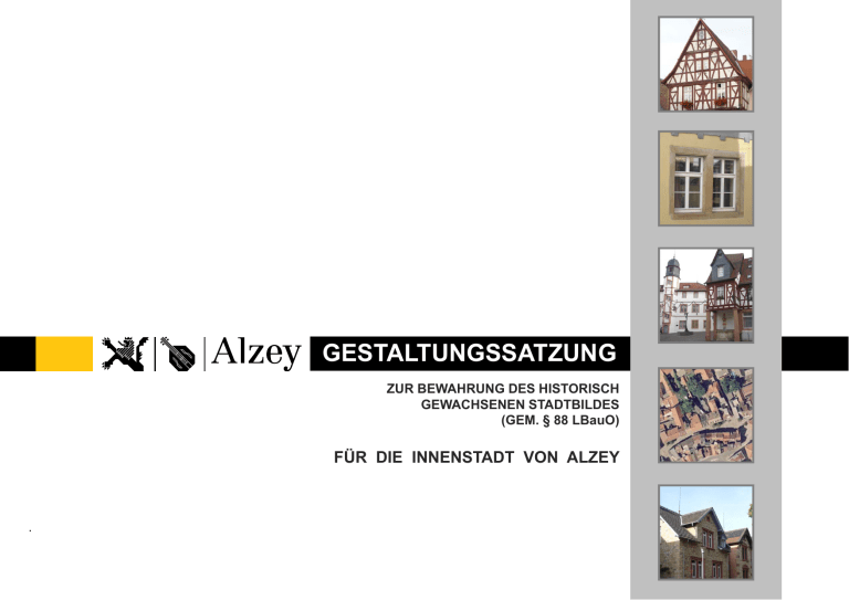 GESTALTUNGSSATZUNG ZUR BEWAHRUNG DES HISTORISCH GEWACHSENEN STADTBILDES (GEM. § 88 LBauO) FÜR DIE INNENSTADT VON ALZEY . Gestaltungssatzung | 09/2012 | Seite 1 INHALT VORWORT 3 §7 ANFORDERUNGEN AN ANTENNENANLAGEN 24 §1 RÄUMLICHER GELTUNGSBEREICH 4 §8 ANFORDERUNGEN AN EINFRIEDUNGEN 25 §2 ZIEL UND ZWECK 6 §9 ANFORDERUNGEN AN WERBEANLAGEN 26 §3 GENEHMIGUNGSPFLICHT 7 § 10 REDUZIERUNG DER IM § 8 LBauO VORGESCHRIEBENEN MASSE 28 §4 ALLGEMEINE ANFORDERUNGEN 8 § 11 ABWEICHUNGEN 29 §5 § 5.1 § 5.2 § 5.3 § 5.4 § 5.5 § 5.6 § 5.7 § 5.8 § 5.9 § 5.10 § 5.11 § 5.12 ANFORDERUNGEN AN FASSADEN Fassadengliederung Fassadenfarbe Fachwerk Balkone und Loggien Wärmedämmung Fenster Türe und Tore Gewände Schaufenster Rollläden /Jalousien Markisen Materialien 9 9 10 10 11 11 12 13 14 15 16 17 18 § 12 ANFORDERUNGEN AN DIE GENEHMIGUNGSUNTERLAGEN 29 § 13 ORDNUNGSWIDRIGKEITEN 30 § 14 INKRAFTTRETEN 30 §6 § 6.1 § 6.2 § 6.3 ANFORDERUNGEN AN DÄCHER Dachformen Dacheindeckung Dachaufbauten, Dachfenster Solarkollektoren und Photovoltaikanlagen 19 19 20 21 § 6.4 KONTAKT: Stadtverwaltung Alzey Fachbereich 4 – Bauen und Umwelt Ernst-Ludwig-Straße 42 55232 Alzey 23 Tel.: + 49 (0) 6731 / 495-0 Fax: + 49 (0) 6731 / 495-555 E-Mail: [email protected] Gestaltungssatzung | 09/2012 | Seite 2 VORWORT Liebe Mitbürgerinnen und Mitbürger, der historische Ortskern Alzeys zeugt mit seinen Gebäuden, Plätzen und Freiflächen von der bedeutenden Geschichte der Stadt. Dieses geschichtliche Erbe, mit seinen baulichen Eigenarten und typischen Elementen, gilt es zu bewahren und behutsam weiterzuentwickeln, um die historisch gewachsene Individualität Alzeys nachhaltig zu sichern. Bereits seit über 30 Jahren widmet sich die Stadt Alzey intensiv der Bewahrung, Erneuerung und Gestaltung des historischen Potentials. Die Sanierung von Bauwerken sowie die Neugestaltung von Straßen und Plätzen haben den historischen Ortskern funktionstüchtiger und das Leben vor Ort attraktiver und angenehmer gemacht. Dennoch gibt es auch weiterhin vielerorts Handlungsbedarf. Deshalb hat sich die Stadt Alzey dazu entschlossen, die Gestaltungssatzung neu aufzustellen. Sie ist in der vorliegenden Broschüre im Originaltext wiedergegeben (grau hinterlegter Text). Durch Begründungen sowie zeichnerische Erläuterungen und Beispiele, welche dem jeweiligen Paragraphen direkt gegenübergestellt sind, werden Sinn und Ziel des Satzungstextes anschaulich erläutert. Interessierten Eigentümern stehen außerdem vielfältige Möglichkeiten der kostenlosen Beratung zur Verfügung. Ich hoffe, dass diese Broschüre vielen Bürgerinnen und Bürger veranschaulicht, wo die Qualitäten unserer historischen Innenstadt liegen und dass es sich lohnt, diese zu bewahren und zu pflegen. Mit freundlichen Grüßen Ihr Christoph Burkhard Bürgermeister der Stadt Alzey Gestaltungssatzung | 09/2012 | Seite 3 § 1 RÄUMLICHER GELTUNGSBEREICH Diese Satzung gilt für den historisch gewachsenen Kernbereich der Stadt Alzey und umfasst im Wesentlichen die Bebauung der folgenden Straßenzüge: LAGEPLAN Datengrundlage: Geobasisinformationen der Vermessungs- und Katasterverwaltung Alzey (Aktualität 03/2010) Am Damm, Am Heiligen Häuschen, Am Schlosspark, Amtgasse, An der Hexenbleiche, An der Zehntscheune, Antoniterstraße, Atzel, Augustinerstraße, Blauer Hut, Bleichstraße, Distelhof, Donnersbergstraße, Ernst-Ludwig-Straße, Fischmarkt, Flonheimer Straße, Glockenturmweg, Hellgasse, Hinkelgasse, Hospitalstraße, Judengasse, Käfiggasse, Kaiserstraße, Kästrich, Kirchenplatz, Kirchgasse, Klosterstraße, Kronenplatz, Lohgasse, Löwengasse, Neugasse, Obermarkt, Ochslergasse, Rossmarkt, Ruprechtstraße, Schießgraben, Schillerplatz, Schlossgasse, Schulgässchen, Selzgasse, Seubertstraße, Spießgasse, St.-Georgen-Straße, Untere Schanzenstraße, Volkerstraße, Wächterspfad, Wartbergstraße, Weberstube, Weinrufstraße, Wilhelmstraße, Winkelgässchen, Zehnbrückerstraße, Zwerchgasse. Die genaue Begrenzung des Geltungsbereiches dieser Satzung ist dem beigefügten Lageplan zu entnehmen. Ohne Maßstab Gestaltungssatzung | 09/2012 | Seite 4 Begründung zu § 1 Der räumliche Geltungsbereich umfasst den historischen Stadtkern Alzeys, der für das städtebauliche Erscheinungsbild prägend ist. Die Struktur der Straßen und Plätze vermittelt noch heute den Charakter einer mittelalterlichen Stadt. Der Kreuzungspunkt „Rossmarkt“ verweist darüber hinaus auf den Grundriss der römischen Provinzstadt "Vicani Altiaienses". Noch heute trifft man in vielen Bereichen auf die Straßen des mittelalterlichen Stadtgrundrisses, wie diese Skizze verdeutlicht. Das Stadtbild weist eine beachtliche Zahl kulturgeschichtlich bedeutsamer Denkmäler aus unterschiedlichen Epochen auf, einige mittelalterlichen Ursprungs, die Mehrzahl aber aus der Neuzeit. Eine Vielzahl der Gebäude stammt aus dem 18. Jahrhundert. Die in der Liste „Nachrichtliches Verzeichnis der Kulturdenkmäler Kreis Alzey-Worms“ (Hg. Generaldirektion kulturelles Erbe Rheinland-Pfalz; Stand August 2011) im Einzelnen aufgeführten Objekte befinden sich fast ausschließlich im Geltungsbereich der Gestaltungssatzung. 1894 In diesem Zusammenhang wird darauf hingewiesen, dass bei Kulturdenkmälern und in deren Umgebung ggf. weitere Gestaltungsauflagen von Seiten der Denkmalpflegebehörde zum Tragen kommen können. Gestaltungssatzung | 09/2012 | Seite 5 § 2 ZIEL UND ZWECK Diese Satzung dient der Bewahrung der städtebaulichen Eigenart des Gebietes, insbesondere dem Schutz von kulturell, historisch und städtebaulich bedeutsamen Bauten, Straßen und Plätzen. Begründung Mit den Festsetzungen der Gestaltungssatzung soll das charakteristische Erscheinungsbild und das historische Potential der Stadt bewahrt und in Bereichen mit Gestaltungsmängeln wieder hergestellt werden. Hierzu gehört, neben dem Schutz der historischen Bausubstanz und der ortsgerechten Gestaltung der öffentlichen Räume, die stil- und maßstabsgerecht