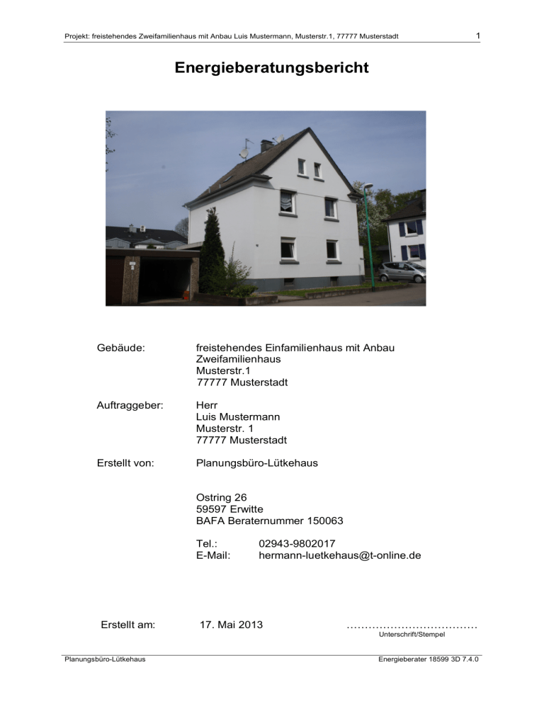 Projekt: freistehendes Zweifamilienhaus mit Anbau Luis Mustermann, Musterstr.1, 77777 Musterstadt 1 Energieberatungsbericht Gebäude: freistehendes Einfamilienhaus mit Anbau Zweifamilienhaus Musterstr.1 77777 Musterstadt Auftraggeber: Herr Luis Mustermann Musterstr. 1 77777 Musterstadt Erstellt von: Planungsbüro-Lütkehaus Ostring 26 59597 Erwitte BAFA Beraternummer 150063 Tel.: E-Mail: Erstellt am: Planungsbüro-Lütkehaus 02943-9802017 [email protected] 17. Mai 2013 ……………………………… Unterschrift/Stempel Energieberater 18599 3D 7.4.0 Projekt: freistehendes Zweifamilienhaus mit Anbau Luis Mustermann, Musterstr.1, 77777 Musterstadt 2 Inhaltsverzeichnis Vorbemerkungen ................................................................................................. 3 Zusammenfassende Darstellung ......................................................................... 7 2.1 Zusammenfassende Erläuterung .................................................................. 7 2.1.1 Gesamtsanierung in einem Zug ............................................................. 8 2.1.2 Gesamtsanierung in Schritten (Maßnahmenfahrplan) ........................... 8 2.2 Übersicht aller Maßnahmen und Maßnahmenkombinationen..................... 11 2.3 Wirtschaftlichkeitsbetrachtungen ................................................................ 11 2.3.1 Kosten/Nutzen-Verhältnis der Maßnahmen ......................................... 12 2.4 Energie-, Schadstoff- und Kosteneinsparungen ......................................... 13 2.5 Energieverbrauch ....................................................................................... 20 2.6 Vorteile der energetischen Sanierung ......................................................... 20 2.7 Verbesserung des Fassaden-, sommerlichem Wärme- und Schallschutz .. 21 2.8 Steigerung der Behaglichkeit und des Wertes der Immobilie...................... 21 2.9 Wohnwert- und Komfortsteigerung ............................................................. 22 2.10 Gesetze und Normen .................................................................................. 22 2.10.1 Nachrüstpflichten nach EnEV .............................................................. 22 2.10.2 Lüftungskonzept nach DIN 1946-6 ...................................................... 22 3 Aufnahme des Ist-Zustandes von Gebäude und Heizung.................................. 24 3.1 Gebäude ..................................................................................................... 24 3.1.1 Gebäudehülle ...................................................................................... 25 3.1.2 Baulicher und wärmetechnischer Zustand ........................................... 27 3.1.3 Wärmebrücken – Erfassung und Auflistung......................................... 28 3.1.4 Lüftungswärmeverluste – Erfassung und Auflistung ............................ 28 3.1.5 Wärmeschutztechnische Einstufung der Gebäudehülle ...................... 29 3.2 Anlagentechnik ........................................................................................... 30 3.2.1 Heizungsanlage ................................................................................... 30 3.2.2 Warmwasserversorgung ...................................................................... 30 3.3 Darstellung der Energiebilanz des Ist-Zustandes ....................................... 30 3.3.1 Energiebilanz Ist-Zustand .................................................................... 30 3.3.2 Bewertung des Gebäudes ................................................................... 33 3.3.3 Nutzverhalten....................................................................................... 34 3.3.4 Energieverbrauch und –kosten über drei Heizperioden ....................... 34 3.4 Gesamtsanierung zum förderfähigen KfW-Effizienzhaus............................ 37 3.4.1 Sanierung der thermischen Hülle......................................................... 37 3.4.2 Sanierung der Anlagentechnik............................................................. 37 3.4.3 Maßnahmen zur Beseitigung oder Minderung der festgestellten Wärmebrücken und unkontrollierter Lüftungswärmeverluste ............... 38 3.4.4 Hinweise zum Lüftungskonzept ........................................................... 38 3.4.5 Maßnahmen zur Beseitigung oder Minderung von Schwachstellen des vorhandenen Heizsystems ................................................................... 39 3.4.6 KfW-Effizienzhausniveau 100 .............................................................. 39 3.4.7 Bewertung der Wirtschaftlichkeit.......................................................... 39 3.4.8 Energieeinsparung............................................................................... 39 3.4.9 Energiekosten...................................................................................... 40 3.5 Einzelmaßnahmen und/oder Maßnahmenkombinationen........................... 40 3.5.1 Sanierung der thermischen Hülle......................................................... 40 3.5.2 Sanierung der Anlagentechnik............................................................. 40 3.5.3 Maßnahmen zur Beseitigung oder Minderung der festgestellten Wärmebrücken und unkontrollierter Lüftungswärmeverluste ............... 40 1 2 Planungsbüro-Lütkehaus Energieberater 18599 3D 7.4.0 Projekt: freistehendes Zweifamilienhaus mit Anbau Luis Mustermann, Musterstr.1, 77777 Musterstadt 3 3.5.4 3.5.5 4 5 6 7 8 Hinweise zum Lüftungskonzept ........................................................... 40 Maßnahmen zur Beseitigung oder Minderung von Schwachstellen des vorhandenen Heizsystems ................................................................... 41 3.5.6 Maßnahmenfahrplan............................................................................ 41 3.5.7 KfW-Effizienzhausniveau ...................................