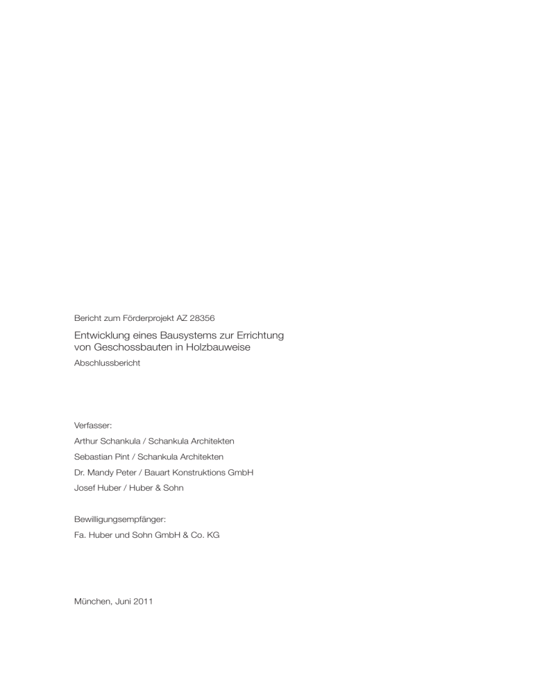 Bericht zum Förderprojekt AZ 28356 Entwicklung eines Bausystems zur Errichtung von Geschossbauten in Holzbauweise Abschlussbericht Verfasser: Arthur Schankula / Schankula Architekten Sebastian Pint / Schankula Architekten Dr. Mandy Peter / Bauart Konstruktions GmbH Josef Huber / Huber & Sohn Bewilligungsempfänger: Fa. Huber und Sohn GmbH & Co. KG München, Juni 2011 Projektteilnehmer / Ansprechpartner Huber & Sohn GmbH & Co. KG Wasserburger Straße 4 83549 Bachmehring Ansprechpartner: Josef Huber SCHANKULA Architekten Garmischer Straße 35 81373 München Ansprechpartner: Arthur Schankula, Sebastian Pint bauart Konstruktions GmbH & Co. KG Destouchestraße 65 80796 München Ansprechpartner: Dr. Mandy Peter 06/02 Projektkennblatt der Deutschen Bundesstiftung Umwelt Az 28356 Antragstitel Referat 25 Fördersumme 124.608,00€ Errichtung eines Bausystems zur Errichtung von Geschossbauten in Holzbauweise Stichworte Laufzeit Projektbeginn Projektende Projektphase(n) 12 Monate 09.03.2010 09.03.2011 1 Zwischenberichte über Forschungsarbeit bis zum 09.09.2010 Bewilligungsempfänger Huber & Sohn GmbH & Co. KG Wasserburger Straße 4 83549 Bachmehring Tel 08071 / 919-101 Fax 08071 / 919-140 Projektleitung Josef Huber Bearbeiter Johann Peteratzinger Kooperationspartner SCHANKULA Architekten Garnischer Straße 35; 81373 München Bauart Konstruktions GmbH & Co.KG Destouchestraße 65; 80796 München Zielsetzung und Anlaß des Vorhabens Im Hochbaubereich herrschen die Materialen Beton, Stahl und Ziegel-, Kalksand- oder Betonsteine vor. Dies ist Stand der Technik. Holz als Baustoff spielt trotz regionaler Unterschiede nur eine untergeordnete Rolle. Ziel des Vorhabens ist es, durch intensive Forschung neue Einsatzgebiete für das Holz als Baustoff zu erschließen. Mit der Entwicklung eines Bausystems für die Errichtung von bis zu achtgeschossigen Gebäuden soll vor allem dazu beigetragen werden, dass sich der Holzbau im Bereich des Geschosswohnungsbaus etabliert, in dem er bisher eine sehr geringe Bedeutung hat. Holz soll auch für Bauteile wie Balkone und Aufzugturm verwendet werden, für die dies bisher nicht üblich ist. Langfristig kann so durch die hauptsächliche Verwendung des nachwachsenden Rohstoffs in großem Umfang ein wichtiger Beitrag zur Schonung der Ressourcen geleistet werden. Darstellung der Arbeitsschritte und der angewandten Methoden In enger Zusammenarbeit von Holzbaufirma, Architekt und Tragwerksplaner wurde die Entwicklung des Bausystems hinsichtlich technischen, wirtschaftlichen und gestalterischen Aspekten betrieben. Wesentliche Elemente des Systems sind Massivholzwände und -decken, die das Tragwerk der Gebäude bilden. Es galt, die Elemente in ihrem Tragverhalten und ihrer Aussteifungswirkung zu optimieren und Details zu entwickeln, die eine einfache, schnelle Montage bei einem sehr hohen Vorfertigungsgrad ermöglichen, den hohen Anforderungen an den Wärmeschutz genügen und zugleich eine kostengünstige Lösung darstellen. Neben der rechnerischen Untersuchung wurden auch Belastungstests durchgeführt. Ein weiterer wichtiger Aspekt des Systems ist der Brandschutz. Es wurden hier Konzepte erarbeitet, um den Anforderungen bis Gebäudeklasse 5 zu genügen, sowohl in Bezug auf den vorbeugenden Brandschutz als auch in Bezug auf den baulichen Brandschutz. Ein Hauptziel dabei war es, dass Holzoberflächen im Innenraum und auch an der Fassade sichtbar bleiben, um den wesentlichen Baustoff des Gebäudes auch zu zeigen und dessen positive Auswirkung auf die Behaglichkeit zu nutzen. Ebenfalls von großer Bedeutung für die Akzeptanz beim Nutzer sind ein funktionierender Schallschutz und die integrierte technische Ausstattung. Auch hier wurden Konzepte und technische Lösungen erarbeitet werden, um dies mit dem neuen System zu leisten. Neben der Entwicklungsarbeit und Tests an Bauteilen wurden im Zuge des Projektes zwei Gebäude realisiert und das System planungs- und ausführungsbegleitend optimiert. Deutsche Bundesstiftung Umwelt An der Bornau 2 49090 Osnabrück Tel 0541/9633-0 Fax 0541/9633-190 http://www.dbu.de Ergebnisse und Diskussion Unter Berücksichtigung der wesentlichen Aspekte Tragwerk, Brandschutz und Schallschutz wurden Bauteile entwickelt, mit denen das erste Bauvorhaben, ein viergeschossiges Wohngebäude, realisiert wurde: - tragende Massivholz-Innenwände mit Gipsfaser-Beplankungen - tragende Massivholz-Außenwände, vorgefertigt einschließlich Holzschalung als Fassadenbekleidung und werkseitig eingebauten Fenstern - Massivholz-Decken - Balkone aus Furnierschichtholz-Platten - Aufzugturm aus Massivholzwänden Das Brandschutzkonzept ermöglichte die Ausführung von sichtbaren Holzoberflächen der Decken im Innenraum sowie von Holzschalung an der Fassade, so dass der wesentliche Baustoff des Gebäudes wahrnehmbar bleibt. Für die Wandkonstruktionen wurden Zulassungen erwirkt, die die geforderten Feuerwiderstandsklassen garantierten und hinsichtlich des Schallschutzes konnten die erhöhten Anforderungen nach VDI 4100 für Decken und Wände eingehalten werden. Die Funktionsfähigkeit der Balkonkonstruktion wurde durch einen Belastungstest nachgewiesen. Aufgrund des sehr hohen Vorfertigungsgrades konnte eine sehr kurze Montagezeit von einem Tag pro Geschoss realisiert werden. Basierend auf den Erkenntnissen aus der Errichtung des viergeschossigen Gebäudes erfolgte anschließend eine Optimierung des Bausystems mit dem Ziel, auch Gebäude an Hochhausgrenze errichten zu können. Ein wichtiger Aspekt war hier die Entwicklung von Typengrundrissen, die einerseits die vom Nutzer gewünschte Flexibilität bieten, andererseits aber auch auf die erhöhten Anforderungen des Tragwerks und des Brandschutzes abzustimmen waren. Das Ergebnis war ein Gebäudetypus, der mit einem integrierten Treppenhaus aus Stahlbeton und einer Laubengang-Erschließung eine optimale Sicherheit des Rettungsweges bietet und zugleich die nötige Aussteifung gegen Windkräfte bewerkstelligt. Um mit dem Betonkern 