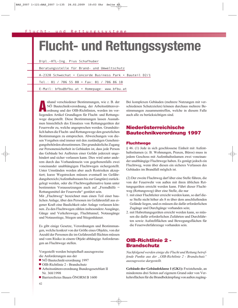 BAS_2007 1-121:BAS_2007 1-135 Flucht- und 26.02.2009 10:03 Uhr Seite 42 Rettungssysteme Flucht- und Rettungssysteme Dipl.-HTL-Ing. Pius Schafhuber Beratungsstelle für Brand- und Umweltschutz A-2320 Schwechat • Concorde Business Park • Bauteil D2/1 Tel.: 01 / 706 55 00 • Fax: 01 / 706 86 10 E-Mail: [email protected] • Homepage: www.bfbu.at nhand verschiedener Bestimmungen, wie z. B. der NÖ Bautechnikverordnung, der Arbeitsstättenverordnung und der OIB-Richtlinien, werden im vorliegenden Artikel Grundlagen für Flucht- und Rettungswege dargestellt. Diese Bestimmungen lassen Ausnahmen hinsichtlich des Einsatzes von Rettungsgeräten der Feuerwehr zu, welche angesprochen werden. Grundsätzlich haben die Flucht- und Rettungswege den gesetzlichen Bestimmungen zu entsprechen. Abweichungen von diesen Vorgaben sind immer mit den zuständigen Genehmigungsbehörden abzustimmen. Der grundsätzliche Zugang zur Personensicherheit in Gebäuden ist, dass jede Person das Gebäude bei Auftreten einer Gefahr jederzeit ungehindert und sicher verlassen kann. Dies wird unter anderem durch das Vorhandensein von gegebenenfalls zwei voneinander unabhängigen Fluchtwegen sichergestellt. Unter Umständen werden aber auch Restrisiken akzeptiert; kurze Wegstrecken müssen eventuell im Gefährdungsbereich (Aufenthaltsraum bis zur Gangtüre) zurückgelegt werden, oder die Fluchtwegalternative kann unter bestimmten Voraussetzungen auch auf „Fremdhilfe = Rettungsmittel der Feuerwehr“ gestützt sein. Mit „Fluchtweg“ bezeichnet man einen Teil einer baulichen Anlage, über den Personen im Gefahrenfall aus eigener Kraft eine Baulichkeit oder Anlage verlassen können. Zu den Fluchtwegen zählen insbesondere Ausgänge, Gänge und Verkehrswege, Fluchttunnel, Notausgänge und Notausstiege, Stiegen und Stiegenhäuser. A Es gibt einige Gesetze, Verordnungen und Bestimmungen, welche konkret von der Größe eines Objekts, von der Anzahl der Personen die im Gefahrenfall flüchten müssen und vom Risiko in einem Objekt abhängige Anforderungen an Fluchtwege stellen. Vorgestellt werden beispielhaft auszugsweise die Anforderungen aus der NÖ Bautechnikverordnung 1997 OIB-Richtlinie 2 - Brandschutz Arbeitsstättenverordnung Bundesgesetzblatt II Nr. 368/1998 Barrierefreies Bauen ÖNORM B 1600 42 Bei komplexen Gebäuden (mehrere Nutzungen mit verschiedenen Schutzzielen) können durchaus mehrere Bestimmungen zusammentreffen, welche in diesem Falle auch alle zu berücksichtigen sind. Niederösterreichische Bautechnikverordnung 1997 Fluchtwege § 46. (1) Jede in sich geschlossene Einheit mit Aufenthaltsräumen (z. B. Wohnungen, Praxen, Büros) muss in jedem Geschoss mit Aufenthaltsräumen zwei voneinander unabhängige Fluchtwege haben. Es genügt jedoch ein Fluchtweg, wenn über diesen ein sicheres Verlassen des Gebäudes im Brandfall möglich ist. (2) Der zweite Fluchtweg darf über eine Stelle führen, die von der Feuerwehr von außen mit ihren üblichen Rettungsgeräten erreicht werden kann. Führt dieser Fluchtweg (Rettungsweg) über eine Stelle, die nur 1. mit einer Fluchtleiter erreicht werden kann, so darf diese Stelle nicht höher als 8 m über dem anschließenden Gelände liegen, und es müssen die dafür erforderlichen Zugänge und Durchgänge vorhanden sein; 2. mit Hubrettungsgeräten erreicht werden kann, so müssen die dafür erforderlichen Zufahrten und Durchfahrten sowie Aufstellflächen und Bewegungsflächen für die Feuerwehrfahrzeuge vorhanden sein. OIB-Richtlinie 2 Brandschutz Nachfolgend werden einige die Flucht und Rettung betreffende Punkte aus der „OIB-Richtlinie 2 - Brandschutz“ auszugsweise dargestellt. Gebäude der Gebäudeklasse 1 (GK1): Freistehende, an mindestens drei Seiten auf eigenem Grund oder von Verkehrsflächen für die Brandbekämpfung von außen zugäng- BAS_2007 1-121:BAS_2007 1-135 26.02.2009 10:03 Uhr Seite 43 liche Gebäude mit nicht mehr als drei oberirdischen Geschossen und mit einem Fluchtniveau von nicht mehr als 7 m, bestehend aus einer Wohnung oder einer Betriebseinheit von jeweils nicht mehr als 400 m2 Grundfläche. Gebäude der Gebäudeklasse 2 (GK2): Gebäude mit nicht mehr als drei oberirdischen Geschossen und mit einem Fluchtniveau von nicht mehr als 7 m, bestehend aus höchstens fünf Wohnungen bzw. Betriebseinheiten von insgesamt nicht mehr als 400 m2 Grundfläche; Reihenhäuser mit nicht mehr als drei oberirdischen Geschossen und mit einem Fluchtniveau von nicht mehr als 7 m, bestehend aus Wohnungen bzw. Betriebseinheiten von jeweils nicht mehr als 400 m2 Grundfläche. Die Fluchtwege dürfen innerhalb der Wohnung und auf eine Länge von höchstens 5 m außerhalb der Wohnung (z. B. Stichgang) gemeinsam verlaufen. Einer der beiden Fluchtwege darf durch einen anderen Brandabschnitt führen, sofern dieser innerhalb von höchstens 40 m Gehweglänge erreichbar ist, und dieser einen Ausgang zu einem sicheren Ort des angrenzenden Geländes im Freien hat. Werden Treppenhäuser atrien- oder hallenähnlich ausgeführt, sind gegebenenfalls von den Anforderungen der Tabelle 2 bzw. Tabelle 3 abweichende bzw. ergänzende Brandschutzmaßnahmen zu treffen. Rettungswege Gebäude der Gebäudeklasse 4 (GK4): Gebäude mit nicht mehr als vier oberirdischen Geschossen und mit einem Fluchtniveau von nicht mehr als 1 m, bestehend aus einer Wohnung bzw. einer Betriebseinheit ohne Begrenzung der Grundfläche oder aus mehreren Wohnungen bzw. mehreren Betriebseinheiten von jeweils nicht mehr als 400 m2 Grundfläche. Gebäude der Gebäudeklasse 5 (GK5): Gebäude mit einem Fluchtniveau von nicht mehr als 22 m, die nicht in die Gebäudeklassen 1, 2, 3 oder 4 fallen sowie Gebäude mit ausschließlich unterirdischen Geschossen. Bei Gebäuden mit einem Fluchtniveau von über 22 m ist die ONR 22000 anzuwenden. Fluchtwege Von jeder Stelle eines Raumes - ausgenommen nicht ausgebaute Dachräume - muss in höchstens 40 m Gehweglänge erreichbar sein: (a) ein direkter Ausgang zu einem sicheren Ort des ang