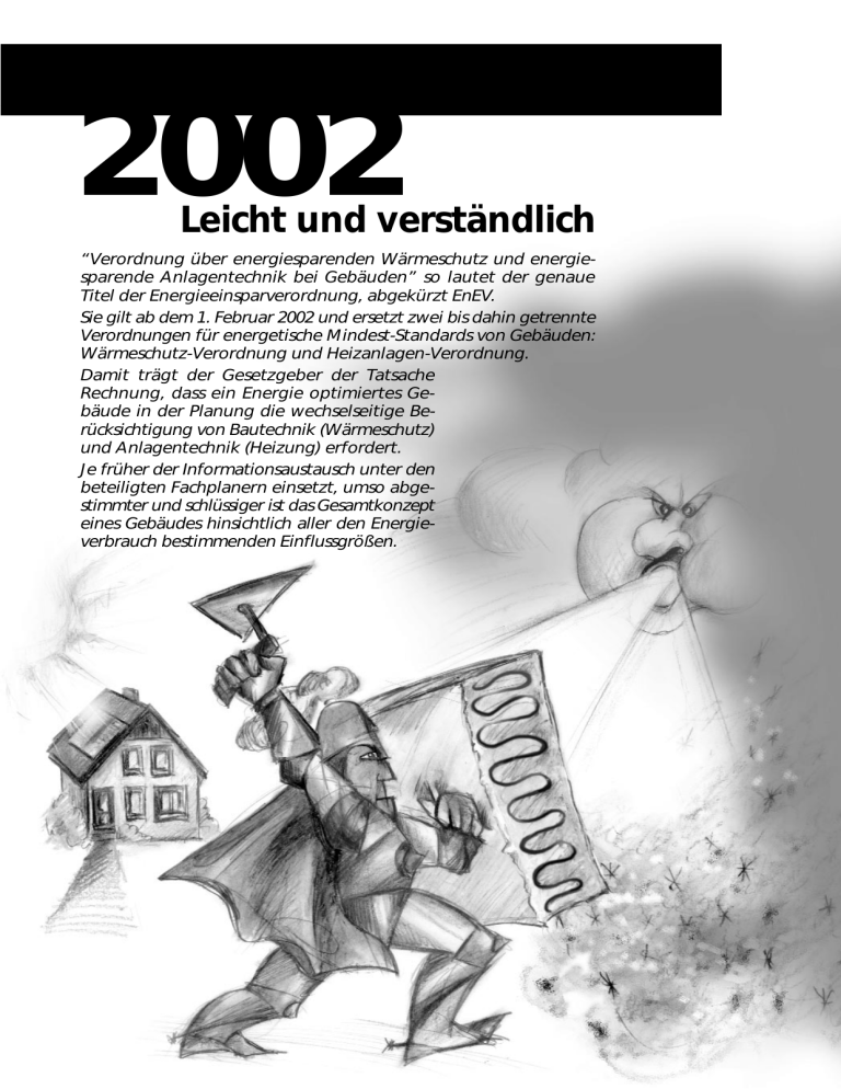 Energieeinsparverordnung 2002 Leicht und verständlich “Verordnung über energiesparenden Wärmeschutz und energiesparende Anlagentechnik bei Gebäuden” so lautet der genaue Titel der Energieeinsparverordnung, abgekürzt EnEV. Sie gilt ab dem 1. Februar 2002 und ersetzt zwei bis dahin getrennte Verordnungen für energetische Mindest-Standards von Gebäuden: Wärmeschutz-Verordnung und Heizanlagen-Verordnung. Damit trägt der Gesetzgeber der Tatsache Rechnung, dass ein Energie optimiertes Gebäude in der Planung die wechselseitige Berücksichtigung von Bautechnik (Wärmeschutz) und Anlagentechnik (Heizung) erfordert. Je früher der Informationsaustausch unter den beteiligten Fachplanern einsetzt, umso abgestimmter und schlüssiger ist das Gesamtkonzept eines Gebäudes hinsichtlich aller den Energieverbrauch bestimmenden Einflussgrößen. EnEV Die größten Einsparmöglichkeiten In Deutschland entfällt nach wie vor ein Drittel des gesamten Energiekonsums auf die Raumheizung. Die entscheidende Rolle spielt dabei die überwiegende Zahl älterer Gebäude. So wendet ein privater Haushalt im Durchschnitt des Gebäudebestandes rund 80 Prozent seines Energiebedarfs nur für die Heizung auf, der Rest verteilt sich zu etwa gleichen Anteilen auf Haushaltsstrom und Warmwasserbereitung. Es kommt also darauf an, die lohnenden Einsparpotenziale an den Gebäuden zu erfassen und möglichst effizient zu erschließen. Steigende Energiekosten, drohende Klimaveränderungen und die Begrenztheit der Energierohstoffe sind Anlass für den Einsatz innovativer Energiespartechniken bei Gebäuden - gerade auch im Altbau. Die EnEV enthält für den Fachmann neue Rechenverfahren und für den Bauherrn und Hauseigentümer leicht verschärfte Anforderungen. Hier erfahren Sie die wesentlichen Inhalte als Verständnis- und Entscheidungshilfe. Von der Wärmebildkamera entlarvt: Verzicht auf Dämmung im linken Bild verursacht erhebliche Energieverluste. Vom k-Wert zum U-Wert U-Werte für Fenster ändern sich! Die U-Werte nicht transparenter Bauteile werden sich zahlenmäßig von den bisherigen k-Werten nicht unterscheiden. Anders ist dies bei den Fenstern. Hier gelten neue europäische Meßvorschriften für den Wärmedurchgang beim Rahmenmaterial, außerdem werden die bisher stets vernachlässigten Verluste durch den metallischen Randverbund mit einbezogen. Es müssen also erstmals die tatsächlichen Rahmenverlust-Anteile eingerechnet werden, was kleinformatige (Sprossen)-Fenster deutlich schlechter abschneiden läßt (Rahmenanteil z.B. 60%). Generell ergeben sich künftig physikalisch korrekt höhere Zahlenwerte für dasselbe Fenster. Grob vereinfacht gilt die Regel, dass sich der U-Wert eines Fensters gegenüber dem bisherigen k-Wert um 0,2 - 0,3 W/m2K erhöht. 2 Rahmenmaterial bisher kF künftig UW Holzrahmen 68 mm Weichholz 1,5 1,7 Holzrahmen 68 mm Hartholz 1,5 1,8 PVC-Rahmen 3 Hohlkammern 1,5 1,8 Metallrahmen sehr gute thermische Trennung 1,5 1,8 Metallrahmen gute thermische Trennung 1,8 2,2 kF kV kR Uw Ug Uf Weitere neue Bezeichnungen Fenster (window) Verglasung (glazing) Rahmen (frame) Vergleich kF / UW (in W/m2K) am Beispiel einer typischen Wärmeschutzverglasung mit Ug = 1,4 (nach DIN gemessen Ug = 1,3) und einem üblichen Rahmenanteil von 30% der Fensterfläche EnEV - 2002 J. Zink BAU-Kommunikation Der k-Wert ist der Sparwert, wurde bisher sehr zutreffend gereimt. Im Rahmen der internationalen Anpassung wird mit Inkrafttreten der EnEV nun auch in Deutschland die Bezeichnung U-Wert eingeführt, abgeleitet von der englichen Bezeichnung „Unit of heat-transfer“. Als „Wärmedurchgangskoeffizient“ ist diese Bauteileigenschaft ein Maß für den Wärmeverlust, seine Einheit ist „Watt pro m2 Bauteilfläche je Kelvin Temperaturdifferenz“ (W/m2K). EnEV Teil 1: Gebäudemodernisierung Für Gebäude, die bereits vorhanden sind, gilt weiterhin das Prinzip des Bestandsschutzes. Das heißt, dass kein Eigentümer zu Nachbesserungen gezwungen werden kann. Ausnahmen bestehen in den außerordentlich wirtschaftlichen Fällen einer Neubeschaffung von Feuerungsanlagen (wie schon bisher im Rahmen der Kleinfeuerungsanlagenverordnung) und erstmals auch beim Wärmeschutz von Dachböden. So wird unterschieden zwischen so genannten bedingten Anforderungen, wenn ohnehin Sanierungen vorgenommen werden (§8) und Anforderungen mit Nachrüstverpflichtung (§9). Die Nachrüstpflichten Ausnahmen Unabhängig davon, ob ohnehin Sanierungen geplant sind, führt die EnEV in drei Punkten eine Verpflichtung für Hauseigentümer ein, Nachbesserungen vorzunehmen. Dies sind im Einzelnen: • Heizkessel, mit Gas oder Öl betrieben, die vor dem 01.10.1978 eingebaut wurden, sind bis 31.12.2006 außer Betrieb zu nehmen, bei Einhaltung bestimmter Grenzwerte erst bis 31.12.2008. Da die genauen Zusammenhänge etwas komplizierter sind, finden Sie die Bestimmungen im Ablaufdiagramm auf der nächsten Seite. • Heizungs- und Warmwasserrohre in nicht beheizten Räumen, die zugänglich sind aber bisher nicht gedämmt waren, müssen bis 31.12.2006 nach den Bestimmungen der EnEV gedämmt werden. • Oberste Geschossdecken beheizter Räume sind - sofern sie „nicht begehbar aber zugänglich“ sind - bis 31.12.2006 zu dämmen. Dabei müssen sie den UWert 0,3 W/m2K einhalten, was je nach Beschaffenheit der Decke mit nur 8 - 12 Zentimeter Dämmstärke (Wärmeleitgruppe 040) erreicht wird. Freigestellt von allen Nachrüstpflichten sind die Eigentümer von Ein- und Zweifamilienhäusern, die selbst darin wohnen (ausschlaggebend ist der Zeitpunkt des Inkrafttretens der EnEV). Erst bei einem Eigentümerwechsel muß der neue Eigentümer diese Nachrüstpflicht erfüllen. Er hat dafür mindestens zwei Jahre Zeit, auch über die oben genannten Fristen hinaus. Erläuterungsbedürftig ist die Dämmvorschrift für Dachböden. Bekanntlich schlummern hier große Einsparmöglichkeiten, die in der Regel auf einfachste Art und Weise in Eigenleistung erschlossen werden können. 