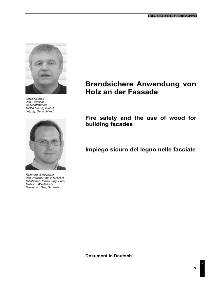 10. Internationales Holzbau-Forum 2004 Brandsichere Anwendung von Holz an der Fassade Ingolf Kotthoff Dipl. Physiker Geschäftsführer MFPA Leipzig GmbH Leipzig, Deutschland Fire safety and the use of wood for building facades Impiego sicuro del legno nelle facciate Reinhard Wiederkehr Dipl. Holzbau-Ing. HTL/SISH Mitinhaber Holzbau-Ing. Büro Makiol + Wiederkehr Beinwil am See, Schweiz Dokument in Deutsch 1 Brandsichere Anwendung von Holz an der Fassade 10. Internationales Holzbau-Forum 2004 2 Brandsichere Anwendung von Holz an der Fassade 10. Internationales Holzbau-Forum 2004 Brandsichere Anwendung von Holz an der Fassade Abbildung 1: Holz-Aussenwand an einem Altersheim in Glarus 1 Lignum/holz 21 Projekt „Brandsicherheit und Holzbau“ 1.1 Ausgangslage Das neuzeitliche Bauen mit Holz findet sowohl bei Planern wie auch bei Bauherren eine zunehmende Akzeptanz. Im In- und Ausland ausgeführte Bauwerke wirken beispielhaft und animieren Planer und Bauherren vermehrt Bauten in Holz zu realisieren. Allerdings können die zuständigen Behörden Bauten in Holz aufgrund der heute gültigen Normen -im Normalfall- nur bewilligen, wenn sie nicht mehr als zwei Vollgeschosse aufweisen. Vermehrte Holznachfrage Zwischen einer vermehrten Holznachfrage und einer optimalen Brandsicherheit von Holzbauten besteht ein direkter Zusammenhang: denn Holz ist gleichzeitig Bau- und Brennstoff. Moderne Holztragwerke sind jedoch sicher. Zwar kann Holz brennen, aber massgeblich ist, wie sich ein Baustoff im Brandfall verhält. Hier kennt Holz entscheidende Vorteile. Diese klaren Vorteile von Holz gilt es in Versuchen zu bestätigen und als technische Lösungen bereitzustellen. Die Sicherheit von Holzbauten ist somit ein Schlüsselfaktor, um eine markante Steigerung im Absatz von Holz und dessen Produkten zu erreichen. Dies gilt grundsätzlich für jegliche Holzanwendung, kommt aber insbesondere im wichtigen Zukunftsmarkt der mehrgeschossigen Bauten verstärkt zum Tragen. 3 Brandsichere Anwendung von Holz an der Fassade 10. Internationales Holzbau-Forum 2004 Günstigere Rahmenbedingungen Die VKF (Vereinigung Kantonaler Feuerversicherungen, Bern) hat dank intensiver Zusammenarbeit mit der Lignum in Aussicht gestellt, dass sie ab der nächsten Vorschriften-Revision ihre Brandschutzvorschriften dahingehend ändern wird, dass der mehrgeschossige Holzbau auf der Stufe der Standardanforderungen zugelassen wird. Neue Märkte – Neue Anwendungen Dank den in Aussicht gestellten Änderungen ergeben sich völlig neue Anwendungsgebiete und Märkte für das Holz. Dies bedeutet aber, dass hinsichtlich Konstruktion und Ausführung teilweise Neuland beschritten wird. Entwicklung und Forschung – Sicherheit gewährleisten Umfangreiche Entwicklungs- und Forschungsarbeiten sind nötig, um das bis anhin hohe Sicherheitsniveau in der Schweiz beizubehalten. Der Grundsatz des Brandschutzes – ein einwandfreier Personen- und Sachwertschutz – darf nicht beeinträchtigt werden. Gesamtkonzept Die Wald- und Holzwirtschaft ist sich ihrer Verantwortung bewusst. Sie hat deshalb unter der Leitung von LIGNUM, Holzwirtschaft Schweiz in den Jahren 1999 bis 2001 ein Gesamtkonzept "Brandsicherheit und Holzbau" erstellt. International Normung international Zusammenarbeit Koordination Forschung/Entwicklung G Information Kommunikation Vertrauensbildende Aktionen, Information & Beratung von Behörden, Planern, Entscheidungsträgern & Öffentliche Bauherren F Organisation, Grundlagen, Gesetzgebung Normen & Richtlinien Umsetzung Vorschriften Grundlagen A Brandsicherheit und Holzbau Flankierende Massnahmen Schadensstatistiken Löschwasserschäden Prämiengestaltung Politische Vorstösse E Ausbildung Qualitätssicherung Umsetzung des aktuellen Fachwissens / BS-Vorschriften Sicherung der verlangten Qualität C Technischer Brandschutz Konzeption Alternative Maßnahmen Brandmeldeanlagen & Sprinklervollschutz D Abbildung 2: Gesamtkonzept „Brandsicherheit und Holzbau“ 4 Forschung & Entwicklung Entwickeln von brandschutz& holzbautechnisch optimalen Gebäuden B Brandsichere Anwendung von Holz an der Fassade 10. Internationales Holzbau-Forum 2004 Brandschutzgesetzgebung Technische Lösungen Bauherrschaften gewinnen • In den Normen und Vorschriften sind zielkonforme Kriterien für den Baustoff Holz enthalten. • Entwicklung und For- • Marktgewinnung schung von branddank vertrauensund holzbautechbildenden Aktionen nisch optimalen Bauund Bauen mit Vorteilen und Gebäuden. bildcharakter. Umgang mit Risiken • Risiken und Gefahren erkennen. • Abbau von Vorurteilen wie „Holz brennt“. • Rückschläge auffan• Holz wird gegenüber gen. Konkurrenzprodukten aufgewertet. • Professioneller Umgang mit Brandfällen. • Mobiliar- und Gebäudeversicherungsprä- • Brandschutz wäh• Die Sicherheit wird • Lignum/SIA Dok 83 mien für Holz- und rend der Bauzeit; dank wissenschaftliist aktuell und gilt als Massivbau sind Kampagne innerhalb cher Entwicklung und Dokument mit „Stand gleich. der eigenen Reihen. Forschung ausgeder Bautechnik“. • Positive Einstellung • Die Branche kennt wiesen. • Ausbildung und von Behörden und die Grenzen und Ri• Einheitliche RegeSchulung haben Öffentlichkeit zum siken. lung in der ganzen einen grossen Holzbau. Schweiz. Stellenwert. • Gutes Bauen mit Holz überzeugt so• Anpassung an inter- • Sicherheit und Qualinationale Regelwertät werden auf allen wohl Behörde als ke, insbesondere EUStufen gewährleistet. auch Öffentlichkeit. Normen. • Materialtechnische • Lignum/SIA Dok 83 Bedingungen sind in "Brandschutz und „Papieren zum Stand Holzbau“ gibt Anleider Bautechnik“ getung zum sicheren regelt. Bauen mit Holz. Abbildung 3: Ziele 1.2 Projektgliederung Das Gesamtprojekt „Brandsicherheit und Holzbau“ ist in folgende sieben Projektsegmente gegliedert (siehe Abbildung 2): A B C D E F G Führung, Organisation, Grundlagen Forschung und Entwicklung Ausbildung und Qualitätssicherung Technischer Brands