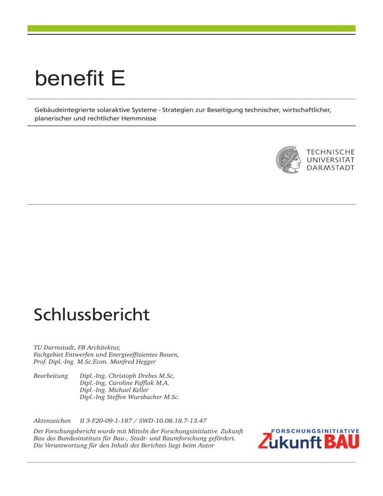 benefit E Gebäudeintegrierte solaraktive Systeme - Strategien zur Beseitigung technischer, wirtschaftlicher, planerischer und rechtlicher Hemmnisse Schlussbericht TU Darmstadt, FB Architektur, Fachgebiet Entwerfen und Energieeffizientes Bauen, Prof. Dipl.-Ing. M.Sc.Econ. Manfred Hegger Bearbeitung Dipl.-Ing. Christoph Drebes M.Sc. Dipl.-Ing. Caroline Fafflok M.A. Dipl.-Ing. Michael Keller Dipl.-Ing Steffen Wurzbacher M.Sc. Aktenzeichen II 3-F20-09-1-187 / SWD-10.08.18.7-13.47 Der Forschungsbericht wurde mit Mitteln der Forschungsinitiative Zukunft Bau des Bundesinstituts für Bau-, Stadt- und Raumforschung gefördert. Die Verantwortung für den Inhalt des Berichtes liegt beim Autor 002 003 benefit E - Schlußbericht in Ergänzung zum Schlußbericht folgende Unterlagen berücksichtigen benefit E - Anlage 1: Systemsteckbriefe benefit E - Anlage 2: Experteninterviews Zuwendungsempfänger TU Darmstadt, FB Architektur, Fachgebiet Entwerfen und Energieeffizientes Bauen Bearbeitung Autoren Prof. Dipl.-Ing. M.Sc.Econ. Manfred Hegger Dipl.-Ing. Christoph Drebes M.Sc. Dipl.-Ing. Caroline Fafflok M.A. Dipl.-Ing. Michael Keller Dipl.-Ing Steffen Wurzbacher M.Sc. Studentische Mitarbeiter Amelie Breitenbach, Katharina Herzog, Sandra Leipe, Leonie Peters, Christian Wagner Kontakt Fachbereich Architektur, Fachgebiet Entwerfen und Energieeffizientes Bauen Prof. Manfred Hegger El-Lissitzky-Straße 1 D-64287 Darmstadt tel +49 [0]6151 16-2048 fax +49 [0]6151 16-5171 [email protected] [email protected] www.architektur.tu-darmstadt.de/ee Aktenzeichen: II 3-F20-09-1-187 / SWD-10.08.18.7-13.47 Vorhabensbezeichnung: benefit E, Gebäudeintegrierte solaraktive Systeme - Strategien zur Beseitigung technischer, wirtschaftlicher, planerischer und rechtlicher Hemmnisse Laufzeit des Vorhabens: 15.12.2013 bis 31.10.2015 004 Abstract 005 Abstract Building-related integrations of solar active systems, as illustrated in the following paragraphs, depends on different partly project-specific conditions. What is the development potential of integrated models for the recently established solar industry in germany to reach new fields of action? The research project deals with this issue and identifies barriers which demonstrate the low acceptance of integrated systems and prevent an increased usage of building integrated systems. The self-evident in the usage of solar-active systems is becoming apparent as a major screw to increase the acceptance. In design terms, as well as in constructive issues different fields of activity are related. The involved groups in the design and construction process have to develop possibilities which increase the opportunities of a flexibel architectual handling to overcome the still precieved character of technical applications. In many realized pioneering efforts since the 1970s which combined architecture and active energy production often the aspects of energy production became the dominant character of the urbanistic and architectural impression. Other approaches try to translate the strategic use of solar active elements in buildings in an architectural design element. In needs to have a sensitive calibration between the building and the intent to gain building-related renewable energy. That means it has to be designed among it‘s property to produce energy as a readable but natural part of the overall building-concept. It’s becoming an architecture expressing design element. This principle of integration provides limited opportunities for e.g. large-scales usage or the embedding in urban context situations. This form of integration will primarily be applicable in individual objects and for representative buildings and is always going to have a clear readability in the building envelope. Larger areas and contextually founded usages in the visible range of urban structures on the other hand require a restrained appearance of the solaractive components. The formation of a homogeneous appearance of the present urban situation or facades of individual buildings is an essential condition for the architect to draw a use of energy-winning materials into consideration. Future systems should therefore provide the variance to be both an architectural design element as well as using the systems with project-specific colors, constructions and surface designs in order to achieve an integrated embedding in the surrounded situation. In extensive interviews with different groups of responsibles for builded architecture the following chapters show the various expactations being placed on future developments in connection with building related solaractive systems. 006 Inhaltsverzeichnis 1. Einleitung 1.1 Energiewende und Nutzung von Solarenergie .........................................008 1.1.1. Energiewende als Modell der Zukunft............................................009 1.1.2. Energiebedarf und Energiebereitstellung in Deutschland...............009 1.1.3. Nutzung von Solarenergien an Gebäuden und der Stadt ...............011 1.2 Entwicklung solaraktiver Systeme im Überblick ............................................012 1.2.1. Der Beginn aktiver Solarenergienutzung in Gebäuden .....................012 1.2.2. Ausbau und Entwicklung aktiver Systeme in Deutschland ................013 1.2.3. Ausbau und Entwicklung der Solarthermie .......................................019 1.3 Flächenpotenziale solaraktiver Nutzung in Deutschland ............................ 020 1.4 Rahmenbedingungen solarenergetischer Nutzung ..................................... 022 1.4.1. Solarstrahlung .................................................................................... 022 1.4.2. Einfluss auf das nutzbare Strahlungsangebot................................... 023 1.5 Solaraktive Systeme ...................................................................................... 030 1.5.1. Thermische Systeme .......................................................................... 030 1.5.2. Elektrische Systeme ....