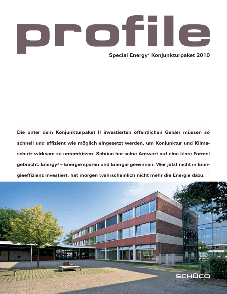 Special Energy2 Konjunkturpaket 2010 Die unter dem Konjunkturpaket II investierten öffentlichen Gelder müssen so schnell und effizient wie möglich eingesetzt werden, um Konjunktur und Klimaschutz wirksam zu unterstützen. Schüco hat seine Antwort auf eine klare Formel gebracht: Energy2 – Energie sparen und Energie gewinnen. Wer jetzt nicht in Energieeffizienz investiert, hat morgen wahrscheinlich nicht mehr die Energie dazu. prolog 04 Energetische Sanierung mit Schüco und dem Konjunkturpaket II 06 Konjunkturpaket II – Kosten und Zeit als entscheidende Faktoren projects portrait 10 Referenzprojekte Konjunkturpaket II 24 Interview mit Franz Josef Balmert, Baureferat Landeshauptstadt München 26 Interview mit Hans-Christof Starz, Starz Metallbau, Aalen 28 Interview mit Professor Paul Kahlfeldt, Kahlfeldt Architekten, Berlin Herausgeber Schüco International KG Marketing projects 34 Referenzprojekte Energetische Sanierung Tanja Brinks Redaktion DETAILtransfer Institut für internationale Architektur-Dokumentation, München Copyright Schüco International KG Karolinenstraße 1–15 33609 Bielefeld Tel. +49 521 783-0 Fax +49 521 783-451 www.schueco.com products 42 Schüco Passivhausfassade – ein ausgezeichnetes Konzept 43 Interview mit Prof. Dr. Wolfgang Feist, Passivhaus Institut, Darmstadt 44 Schüco Produkte – klare und nachhaltige Lösungen 48 Service und Beratung rund um das Energy2 Konjunkturpaket 50 Übersicht zu öffentlichen Fördermitteln Dirk U. Hindrichs Geschäftsführender und persönlich haftender Gesellschafter der Schüco International KG Sehr geehrte Leser, mit dem Konjunkturpaket II hat die deutsche genen Weg fortsetzen – auch im Sinne einer Bundesregierung ein Programm aufgelegt, funktionalen und gestalterischen Verbesse- das durch die energetische Sanierung öffent- rung der Altbausubstanz. Schließlich zählen licher Gebäude Konjunktur und Klimaschutz energetische Sanierungen zu den wichtigsten fördern soll. Um Architekten, Verarbeiter Bauaufgaben der Zukunft, die immer auch und Bauämter auch in der Praxis mit innova- die Chance auf einen spannenden Dialog zwi- tiven Produktlösungen zu unterstützen, hat schen Alt und Neu bieten. Schüco das Energy² Konjunkturpaket entwick- Gemeinsam mit Ihnen wollen wir dafür sorgen, elt. Mit dem Unternehmensleitbild „Energy² – dass die öffentlichen Mittel sinnvoll eingesetzt Energie sparen und Energie gewinnen“ setzen werden. Um Sie hierfür auch in Zukunft op- wir ein Zeichen. Es bedeutet, durch optimal ge- timal unterstützen zu können, haben wir das dämmte Gebäudehüllen Energie zu sparen und Energy² Konjunkturpaket auch in 2010 verlän- Solarstrom sowie Solarwärme klimafreundlich gert. Bleiben Sie dran an der energetischen aus Sonnenenergie zu gewinnen – bei Sanie- Sanierung mit Schüco! rungen ebenso wie bei Neubauten. Damit ist es in verhältnismäßig kurzer Zeit gelungen, die Herzlichst, Ihr Energie- und CO2-Bilanzen von Schulen, Krankenhäusern und kommunalen Verwaltungsbauten nachhaltig zu verbessern. Ein Teil der Fördergelder wurde von den Städ- Dirk U. Hindrichs ten und Kommunen bereits in Anspruch genommen. Noch immer stehen jedoch rund 36 Prozent der staatlichen Mittel zur Verfügung. Und so heißt es: dranbleiben und den mithilfe des Konjunkturpakets II eingeschla- profile Special Energy2 Konjunkturpaket 3 Energetische Sanierung mit Schüco und dem Konjunkturpaket II Manche Experten und Wirtschaftsforschungsinstitute geben sich bereits optimistisch, andere sehen das Ende der Wirtschaftskrise noch in weiter Ferne. So oder so dürfte die Krise auch in nächster Zeit großen Einfluss auf die Auftragslage von Unternehmen vor allem der Baubranche nehmen. Mit dem Energy² Konjunkturpaket fördert Schüco Konjunktur und Klimaschutz. Mithilfe des staatlichen Konjunkturpakets und munalen Baubehörden und anderen Partnern dem Energy² Konjunkturpaket von Schüco wollen wir der Konjunktur einen weiteren konnten bereits zahlreiche energetische Sa- wichtigen Impuls verleihen. Schüco bietet hier- nierungen von Schulen, Lehrstätten, medizi- für eng aufeinander abgestimmte Komplettlö- nischen Einrichtungen sowie Verwaltungsge- sungen aus einer Hand, damit öffentliche Gel- bäuden nachhaltig und effizient ausgeführt der tatsächlich effizient eingesetzt und direkt werden. Eine Entwicklung, die sich auch in sichtbare wie auch spürbare Ergebnisse erzielt diesem Jahr mit unverminderter Geschwin- werden können. digkeit fortsetzt. Allerdings werden Investitionen 2011 nur noch dann gefördert, wenn sie Nachholbedarf im Bildungswesen für Vorhaben bestimmt sind, die vor dem 31. Entsprechend der vom Bund geplanten Vertei- Dezember 2010 begonnen wurden. Die wich- lung der Mittel hat sich auch im Rahmen der tigste Botschaft lautet deshalb: Verschenken Auswertung der von Schüco begleiteten Pro- Sie keine Zeit. jekte gezeigt, dass der stärkste Sanierungsbedarf im Bereich der Bildungsinfrastruktur Finanzmittel in Höhe von insgesamt zehn Mil- besteht. Dass der Anteil gerade dieser Pro- liarden Euro stellte die deutsche Bundesregie- jekte so hoch ist, hat nicht nur damit zu tun, rung mit dem im Februar 2009 beschlossenen dass sich rund 90 Prozent der Bildungsein- Die wichtigste Botschaft für 2010 Konjunkturpaket II (KP II) zur Verfügung, um richtungen in kommunaler Hand befinden. lautet: Verschenken Sie keine Zeit. zusätzliche kommunale Investitionen anzustoßen – ein Betrag, der auf Länderebene noch um einen Eigenanteil von 3,3 Millionen Euro aufgestockt wird. Dabei gibt es insbesondere zwei Schwerpunkte: 36 Prozent der Mittel sind für Infrastrukturprojekte und Krankenhäuser bestimmt, während die restlichen 65 Prozent in die Verbesserung und energetische Sanierung vor allem der Bildungsinfrastruktur – Kindergärten, Schulen, Universitäten sowie Forschungs- oder Weiterbildungseinrichtungen – investiert werden sollen. Schüco Energy² Konjunkturpaket Mit dem in 2010 verlängerten Energy² Kon