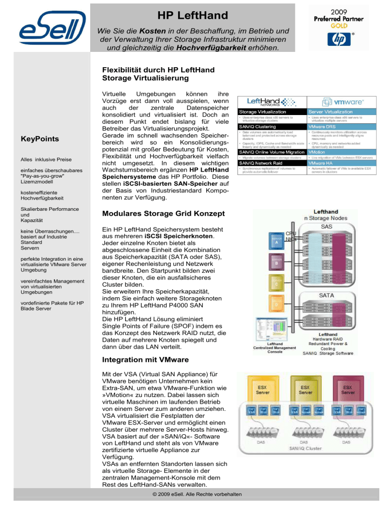 HP LeftHand Wie Sie die Kosten in der Beschaffung, im Betrieb und der Verwaltung Ihrer Storage Infrastruktur minimieren und gleichzeitig die Hochverfügbarkeit erhöhen. Flexibilität durch HP LeftHand Storage Virtualisierung KeyPoints Alles inklusive Preise einfaches überschaubares "Pay-as-you-grow" Lizemzmodell kosteneffiziente Hochverfügbarkeit Skalierbare Performance und Kapazität keine Überraschungen.... basiert auf Industrie Standard Servern perfekte Integration in eine virtualisierte VMware Server Umgebung vereinfachtes Management von virtualisierten Umgebungen vordefinierte Pakete für HP Blade Server Virtuelle Umgebungen können ihre Vorzüge erst dann voll ausspielen, wenn auch der zentrale Datenspeicher konsolidiert und virtualisiert ist. Doch an diesem Punkt endet bislang für viele Betreiber das Virtualisierungsprojekt. Gerade im schnell wachsenden Speicherbereich wird so ein Konsolidierungspotenzial mit großer Bedeutung für Kosten, Flexibilität und Hochverfügbarkeit vielfach nicht umgesetzt. In diesem wichtigen Wachstumsbereich ergänzen HP LeftHand Speichersysteme das HP Portfolio. Diese stellen iSCSI-basierten SAN-Speicher auf der Basis von Industriestandard Komponenten zur Verfügung. Modulares Storage Grid Konzept Ein HP LeftHand Speichersystem besteht aus mehreren iSCSI Speicherknoten. Jeder einzelne Knoten bietet als abgeschlossene Einheit die Kombination aus Speicherkapazität (SATA oder SAS), eigener Rechenleistung und Netzwerk bandbreite. Den Startpunkt bilden zwei dieser Knoten, die ein ausfallsicheres Cluster bilden. Sie erweitern Ihre Speicherkapazität, indem Sie einfach weitere Storageknoten zu Ihrem HP LeftHand P4000 SAN hinzufügen. Die HP LeftHand Lösung eliminiert Single Points of Failure (SPOF) indem es das Konzept des Netzwerk RAID nutzt, die Daten auf mehrere Knoten spiegelt und dann über das LAN verteilt. Integration mit VMware Mit der VSA (Virtual SAN Appliance) für VMware benötigen Unternehmen kein Extra-SAN, um etwa VMware-Funktion wie »VMotion« zu nutzen. Dabei lassen sich virtuelle Maschinen im laufenden Betrieb von einem Server zum anderen umziehen. VSA virtualisiert die Festplatten der VMware ESX-Server und ermöglicht einen Cluster über mehrere Server-Hosts hinweg. VSA basiert auf der »SAN/iQ«- Software von LeftHand und steht als von VMware zertifizierte virtuelle Appliance zur Verfügung. VSAs an entfernten Standorten lassen sich als virtuelle Storage- Elemente in der zentralen Management-Konsole mit dem Rest des LeftHand-SANs verwalten. © 2009 eSell. Alle Rechte vorbehalten HP LeftHand Wie Sie die Kosten in der Beschaffung, im Betrieb und der Verwaltung Ihrer Storage Infrastruktur minimieren und gleichzeitig die Hochverfügbarkeit erhöhen. Funktionsübersicht Das „All-inclusive“-Lizenzmodell bietet höchste Funktionalitäten bei transparenten Kosten. Im Grundpreis bereits enthalten sind Snapshot, Clones, Replikation, Failback- und Hochverfügbarkeitsmöglichkeiten. • Storage Clustering: Ermöglicht es mehrere Storage Knoten zu einem großen Storage Pool zusammenzufassen. Je nach Anforderungen kann sich dadurch die Kapazität und Performance erhöhen. • Netzwerk RAID: Verteilt und spiegelt die Daten innerhalb des Clusters auf die StorageKnoten und eliminiert damit Single Points of Failure (SPOF) auch wenn ein ganzer Knoten ausfällt. • Virtualisierung: Die Virtual SAN Appliance (VSA) ermöglicht Ihnen die Funktionalität der physischen Appliance unter VMware ESX abzubilden und miteinander zu kombinieren. • Thin Provisioning: Mithilfe des Thin Provisioning werden nur Blöcke allokiert, die auch beschrieben werden. Somit können Sie Ihren Servern im Netzwerk mehr Platz zuweisen, als tatsächlich vorhanden ist. • Snapshots: Snapshots ermöglichen Ihnen bei minimalen Platzbedarf eine Point-In-Time Kopie Ihres Volumes anzulegen. Somit können Sie bequem einzelne Dateien oder das ganze Volume vom entsprechenden Zeitpunkt wiederherstellen. Produktportefolio HP LeftHand P4300 4.8 TB SAS Starter SAN HP LeftHand P4300 12 TB SATA Starter SAN 2 Knoten 2 Knoten Kapazität: 4,8 TB Kapazität: 12 TB beginnend beginnend = 16 Disks (SAS) = 16 Disks (SATA) HP LeftHand P4500 10.8 TB SAS Virtualisation SAN HP LeftHand P4500 21.6 TB SAS Multi-Site SAN 2 Knoten Kapazität: 10,8 TB beginnend = 24 Disks (SAS) 4 Knoten Kapazität: 21,6 TB beginnend = 48 Disks (SAS) beinhaltet Remote beinhaltet Remote Office Office Solution Pack Solution Pack zum Anbinden zum Anbinden entfernter Standorte inkl. 10 entfernter Standorte VSA Lizenzen inkl. 10 VSA Lizenzen Kontakt Zentrale eSell GmbH Saarbrücken Halbergstrasse 46 66121 Saarbrücken E-Mail: [email protected] Tel.: 0681 / 88 393 – 0 Fax: 0681 / 88 393 – 11 www.eSell.de shop.eSell.de Süd eSell Dienstleistungen im Bereich Virtualisierungstechnologie eSell München Schweppermannstr. 8 81671 München Tel.: 089 / 970 52 98 – 0 Fax: 089 / 970 52 98 – 11 Unterstützung bei Speicher- und Serverkonsolidierung Design Virtueller Infrastrukturen Migrationen © 2009 eSell. Alle Rechte vorbehalten