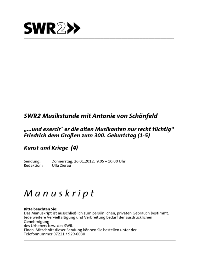 ____________________________________________________________________________________________________ 2 Musikstunde mit Antonie v. Schönfeld SWR2 Donnerstag, 26. Januar 2012, 9.05-10.00 „...und exercir´ er die alten Musikanten nur recht tüchtig“ Friedrich dem Großen zum 300. Geburtstag (1-5) IV. Kunst und Kriege Erlaß zum Regierungswechsel am 1. Juni 1740: „Unsere größte Sorge wird dahin gerichtet seyn, das Wohl des Landes zu befördern, und einen jeden unserer Unterthanen vergnügt und glücklich zu machen.“ Es muss ein bisschen so gewesen sein wie bei der Amtsübernahme von Barack Obama in den USA. Als Friedrich II. König wurde, seinem unpopulären Vater Friedrich Wilhelm I. auf den Thron folgte, war die Hoffnung auf Veränderung groß, im Land herrschte Aufbruchstimmung, die Menschen waren geradezu enthusiastisch. Dieser König war ein Kind der Aufklärung und tatsächlich hagelte es neue Erlässe: Verfügung Friedrichs vom 3. Juni 1740: „Seine Königliche Majestät haben resolviret, in Dero Landen bei denen Inquisitionen die Tortur gänzlich abzuschaffen, außer bei dem „crimen laesae majestatis“ und Landesverräterei, auch denen großer Mordtaten, wo viele Menschen ums Leben gebracht.“ 3 Und schließlich am 22. Juni 1740: „Die Religionen müssen alle Tolleriret werden und Mus der fiscal das auge darauf haben, das Keine der andern abruch tuhe, den hier mus ein jeder nach seiner Faßon selich werden.“ Friedrich ließ die Kornspeicher öffnen und das Getreide gegen geringe Abgaben an das Volk verteilen, Friedrich lockerte die Zensur, sodass im Land bald kontrovers politisch debattiert werden konnte und neue Zeitungen gegründet wurden, und was die Kulturpolitik betraf, so leitete Friedrich mit seinem Amtsantritt eine grundsätzliche Wende ein: ________________________________________________________ Musik 1 Nicola Porpora 3´24 <1> Tu che d´ardir m´accendi aus: Siface Philippe Jaroussky, Countertenor Le Concert d´Astrée Ltg. Emmanuelle Haim Virgin 0094639524228, LC 7873 ________________________________________________________ 4 Friedrich II. war ein intellektueller Kopf: er hat sich mit Philosophie und Literatur auseinandergesetzt, er war gebildet und liebte Musik: Der aufwendige Bau der Königlichen Oper in Berlin entsprach also durchaus seinen Vorlieben, war ihm wichtig. - Philippe Jaroussky, begleitet vom Concert d´Astrée unter Emmanuelle Haim, sang gerade eine Arie aus der Oper Siface von Nicola Porpora. Im 18. Jahrhundert aber hatte die Hofmusik eines Fürsten immer auch eine Repräsentationsfunktion, und so war mit der neuen Oper in Berlin auch eine politische Aussage verbunden: Der junge König wollte den preußischen Hof glänzen lassen wie die ersten Höfe Europas - und im Vergleich zu Dresden, Wien, Paris war viel aufzuholen! Der Bau der Oper war die erste Großtat in dieser Richtung, Friedrich ließ mit den Bauarbeiten beginnen noch während des Ersten Schlesischen Krieges: (Im Dezember 1740 hatte Friedrich die Habsburger-Provinz Schlesien angegriffen und besetzt, - damit hatte niemand gerechnet. Er nutzte die Umbruch-Situation nach dem Tod Kaiser Karl VI., um Österreichs reichste Provinz - eben Schlesien - zu annektieren und Preußen mehr Macht zu verschaffen.) Auch in den folgenden Schlesischen Kriegen – der dritte ging als der Siebenjährige Krieg in die Geschichte ein – ging es darum, die Provinz Schlesien für Preußen dauerhaft zu sichern,- das Ziel: Preußen sollte Großmacht werden und bleiben. 5 Im Rückblick läßt sich - in Bezug auf alle schlesischen Kriege - eine Art „Tätigkeits-Muster“ erkennen: Immer wenn sich das Ende eines Krieges abzeichnete und ein Friedensschluss greifbar wurde, hat sich der König neuen Projekten zuhause zugewandt: Das konnten neue Bauten sein, Umbau-Ideen oder es betraf seine Hofmusik, die Einstellung neuer Musiker, die Einführung von BallettTänzern für die Oper, - immer waren es große Vorhaben, so, als ob Friedrich, der im Krieg zerstörte, das kompensieren wollte, in dem er in der Kunst Neues aufbaute. ________________________________________________________ Musik 2 Johann Adolf Hasse 1´40 CD 2 <19> Sinfonia di stromenti militari aus: Cleofide Capella Coloniensis Ltg. William Christie capriccio 10193-6, LC 8748 ________________________________________________________ 6 (Sinfonia di stromenti militari – aus der Oper Cleofide von Johann Adolf Hasse) Nach dem Ende des Ersten Schlesischen Krieges also die Oper. Nach dem Ende des Zweiten Schlesischen Krieges (1744/45) verlagerte Friedrich die Regierungsgeschäfte von Berlin nach Potsdam und trieb den Umbau des Potsdamer Stadtschlosses voran, in dem ein neues Theater und ein Konzertsaal entstanden. - Und Schloss Sanssouci wurde gebaut, das Sommerschloss, des Königs Refugium: hierhin wollte er sich zurückziehen können, hier sollte er später Voltaire ein Zimmer zuweisen und hier ließ er ein Musikzimmer einrichten mit opulenten Tapisserien und Wandverkleidungen - Schnörkel à la Rokoko. Nach dem Siebenjährigen Krieg schließlich ordnete der König im Friedensjahr 1763 den Bau des Neuen Palais an, ein großes neues Schloss, das in seinen repräsentativen Ausmaßen so gar nicht in die Nachkriegszeit zu passen schien. Auch hier wurde ein aufwendiger Konzertsaal errichtet, und dazu das reich ausgestattete Theater, das die beiden oberen Stockwerke des Süd-Flügels einnimmt, golden verzierte Säulen, roter Samt – hier kann man heute noch Aufführungen besuchen. 7 Die italienische opera seria und - später auch die opera buffa, die komische Oper, die vor allem im Potsdamer Stadtschloss aufgeführt wurde - waren Friedrich während seiner mehr als 40 Regierungsjahre durchgehend ein wichtiges Anliegen. Während der Monate und Jahre, die er auf Feldzügen war, mussten sie ruhen: Friedrichs Tätigkeit in der Rolle des Musenfürst Apoll war den Friedenszeiten vorbehalten. Dann aber konnte er Oper in vollen Zügen genießen und eine Ouvertüre von 