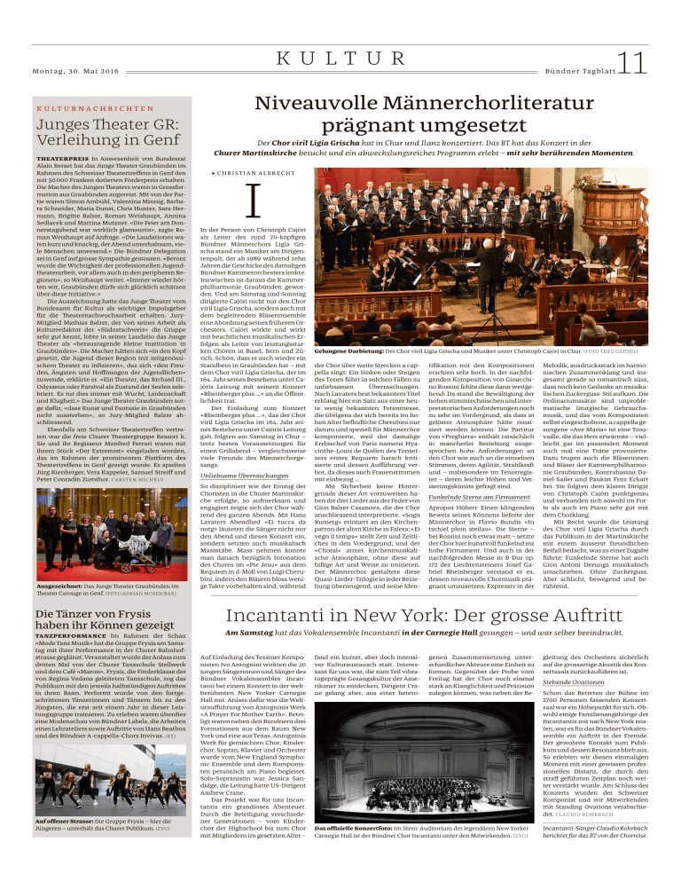 KULTUR M o n t a g , 3 0. M a i 2 0 1 6 K U LT U R NAC H R I C H T E N Junges Theater GR: Verleihung in Genf THEATERPREIS In Anwesenheit von Bundesrat Alain Berset hat das Junge Theater Graubünden im Rahmen des Schweizer Theatertreffens in Genf den mit 50 000 Franken dotierten Förderpreis erhalten. Die Macher des Jungen Theaters waren in Grossformation aus Graubünden angereist. Mit von der Partie waren Simon Ambühl, Valentina Minnig, Barbara Schneider, Maria Dunst, Chris Hunter, Sara Hermann, Brigitte Balzer, Roman Weishaupt, Annina Sedlacek und Martina Mutzner. «Die Feier am Donnerstagabend war wirklich glamourös», sagte Roman Weishaupt auf Anfrage. «Die Laudationes waren kurz und knackig, der Abend unterhaltsam, viele Menschen anwesend.» Die Bündner Delegation sei in Genf auf grosse Sympathie gestossen. «Betont wurde die Wichtigkeit der professionellen Jugendtheaterarbeit, vor allem auch in den peripheren Regionen», so Weishaupt weiter. «Immer wieder hörten wir, Graubünden dürfe sich glücklich schätzen über diese Initiative.» Die Auszeichnung hatte das Junge Theater vom Bundesamt für Kultur als wichtiger Impulsgeber für die Theaternachwuchsarbeit erhalten. JuryMitglied Mathias Balzer, der von seiner Arbeit als Kulturredaktor der «Südostschweiz» die Gruppe sehr gut kennt, lobte in seiner Laudatio das Junge Theater als «herausragende kleine Institution in Graubünden». Die Macher hätten sich «in den Kopf gesetzt, die Jugend dieser Region mit zeitgenössischem Theater zu infizieren», das sich «den Freuden, Ängsten und Hoffnungen der Jugendlichen» zuwende, erklärte er. «Ein Theater, das Richard III., Odysseus oder Parzival als Zustand der Seelen zelebriert. Es tut dies immer mit Wucht, Leidenschaft und Klugheit.» Das Junge Theater Graubünden sorge dafür, «dass Kunst und Fantasie in Graubünden nicht aussterben», so Jury-Mitglied Balzer abschliessend. Ebenfalls am Schweizer Theatertreffen vertreten war die freie Churer Theatergruppe Ressort k. Sie und ihr Regisseur Manfred Ferrari waren mit ihrem Stück «Der Extremist» eingeladen worden, das im Rahmen der prominenten Plattform des Theatertreffens in Genf gezeigt wurde. Es spielten Jürg Kienberger, Vera Kappeler, Samuel Streiff und Peter Conradin Zumthor. CARSTEN MICHELS Ausgezeichnet: Das Junge Theater Graubünden im Theater Carouge in Genf. (FOTO ADRIAN MOSER/BAK) Die Tänzer von Frysis haben ihr Können gezeigt TANZPERFORMANCE Im Rahmen der Schau «Mode Tanz Musik» hat die Gruppe Frysis am Samstag mit ihrer Performance in der Churer Bahnhofstrasse geglänzt. Veranstaltet wurde der Anlass zum dritten Mal von der Churer Tanzschule Stellwerk und dem Café «Maron». Frysis, die Förderklasse der von Regina Vedana geleiteten Tanzschule, zog das Publikum mit den jeweils halbstündigen Auftritten in ihren Bann. Performt wurde von den fortgeschrittenen Tänzerinnen und Tänzern bis zu den Jüngsten, die erst seit einem Jahr in dieser Leistungsgruppe trainieren. Zu erleben waren überdies eine Modenschau von Bündner Labels, die Arbeiten eines Lehrateliers sowie Auftritte von Hans Beatbox und des Bündner A-cappella-Chors Invivas. (BT) Auf offener Strasse: Die Gruppe Frysis – hier die Jüngeren – unterhält das Churer Publikum. (ZVG) B ü n d n e r Ta g b l a tt 11 Niveauvolle Männerchorliteratur prägnant umgesetzt Der Chor viril Ligia Grischa hat in Chur und Ilanz konzertiert. Das BT hat das Konzert in der Churer Martinskirche besucht und ein abwechslungsreiches Programm erlebt – mit sehr berührenden Momenten. I ▸ CHRISTIAN ALBRECHT In der Person von Christoph Cajöri als Leiter des rund 70-köpfigen Bündner Männerchors Ligia Grischa stand ein Musiker am Dirigentenpult, der ab 1989 während zehn Jahren die Geschicke des damaligen Bündner Kammerorchesters lenkte. Inzwischen ist daraus die Kammerphilharmonie Graubünden geworden. Und am Samstag und Sonntag dirigierte Cajöri nicht nur den Chor viril Ligia Grischa, sondern auch mit dem begleitenden Bläserensemble eine Abordnung seines früheren Orchesters. Cajöri wirkte und wirkt mit beachtlichen musikalischen Erfolgen als Leiter von leistungsstarken Chören in Basel, Bern und Zürich. Schön, dass er auch wieder ein Standbein in Graubünden hat – mit dem Chor viril Ligia Grischa, der im 164. Jahr seines Bestehens unter Cajöris Leitung mit seinem Konzert «Rheinberger plus …» an die Öffentlichkeit trat. Der Einladung zum Konzert «Rheinberger plus …», das der Chor viril Ligia Grischa im 164. Jahr seines Bestehens unter Cajöris Leitung gab, folgten am Samstag in Chur – trotz besten Voraussetzungen für einen Grillabend – vergleichsweise viele Freunde des Männerchorgesangs. Unliebsame Überraschungen So diszipliniert wie der Einzug der Choristen in die Churer Martinskirche erfolgte, so aufmerksam und engagiert zeigte sich der Chor während des ganzen Abends. Mit Hans Lavaters Abendlied «Ei tucca da notg» läuteten die Sänger nicht nur den Abend und dieses Konzert ein, sondern setzten auch musikalisch Massstäbe. Mass nehmen konnte man danach bezüglich Intonation des Chores im «Pie Jesu» aus dem Requiem in d-Moll von Luigi Cherubini, indem den Bläsern bloss wenige Takte vorbehalten sind, während Gelungene Darbietung: Der Chor viril Ligia Grischa und Musiker unter Christoph Cajöri in Chur. (FOTO THEO GSTÖHL) der Chor über weite Strecken a cappella singt: Ein Sinken oder Steigen des Tones führt in solchen Fällen zu unliebsamen Überraschungen. Nach Lavaters best bekanntem Titel erklang hier ein Satz aus einer heute wenig bekannten Totenmesse, die übrigens der sich bereits im hohen Alter befindliche Cherubini nur darum und speziell für Männerchor komponierte, weil der damalige Erzbischof von Paris namens Hyacinthe-Louis de Quélen des Tonsetzers erstes Requiem harsch kritisierte und dessen Aufführung verbot, da dieses auch Frauenstimmen mit einbezog ... Mit Sicherheit keine Hintergründe dieser Art vorzuweisen ha
