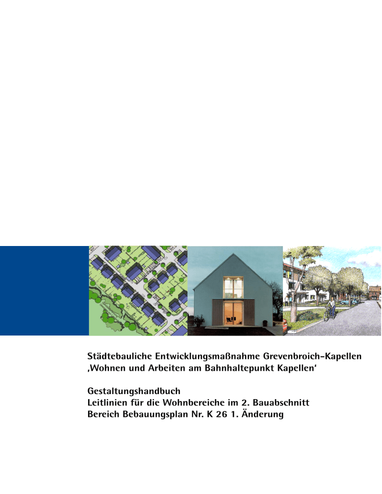 Städtebauliche Entwicklungsmaßnahme Grevenbroich-Kapellen ‚Wohnen und Arbeiten am Bahnhaltepunkt Kapellen‘ Gestaltungshandbuch Leitlinien für die Wohnbereiche im 2. Bauabschnitt Bereich Bebauungsplan Nr. K 26 1. Änderung Stadt Grevenbroich Der Bürgermeister Dezernat IV – Fachbereich Planung / Bauordnung Ostwall 6, 41513 Grevenbroich Telefon 02181 608-0, Telefax 02181 608-479 DSK Deutsche Stadt- und Grundstücksentwicklungsgesellschaft mbH & Co. KG Regionalbüro Düsseldorf Wiesenstraße 21, 40549 Düsseldorf Telefon 0211 56002-0, Telefax 0211 56002-20 Entwickler und Treuhänder der Stadt Grevenbroich Prof. Dipl. Ing. Wolfgang Pohl Dipl. Ing. Bernd Strey Dipl. Ing. Martin Rogge Architekten und Stadtplaner Düsselstraße 11, 40219 Düsseldorf Telefon 0211 393055, Telefax 0211 393056 Planungsstand: September 2009 Inhalt 1. Einführung in das Gestaltungshandbuch 2 2. Städtebauliches Konzept 4 3. Entwicklung in Bauabschnitten, Bebauungspläne 6 4. Aufteilung in Gestaltungsbereiche 7 5. Gestaltungszonen — Wohnbereich 8 6. Die Gestaltung der Gebäude 9 6.1 Gebäudekubatur, Trauf– und Firsthöhen 9 7. 8. 6.2 Dachausbildung 13 6.3 Dachmaterial und Dachfarbe 17 6.4 Fassadenmaterial und Farbe 17 6.5 Fassadengliederung und Fassadenelemente 19 6.6 Unselbständige Gebäudeteile 20 Die Gestaltung der privaten Freiflächen 22 7.1 Einfriedungen 22 7.2 Bepflanzungen 24 Die Gestaltung der Stellplätze, Carports, Garagen und der Nebenanlagen 26 8.1 Stellplätze, Carports und Garagen 26 8.2 Nebenanlagen 29 8.3 Müllsammelanlagen 30 1. Einführung in das Gestaltungshandbuch Im Rahmen der Städtebaulichen Entwicklungsmaßnahme 'Grevenbroich-Kapellen' entsteht auf einer Fläche von 34 ha ein attraktiver Wohn- und Arbeitsstandort mit großzügigen Grünund Freiflächen im direkten Einzugsbereich des Bahnhaltepunktes Kapellen-Wevelinghoven. Insgesamt werden in zwei Abschnitten Baugrundstücke für etwa 700 Wohneinheiten sowie 2,9 ha Gewerbefläche realisiert. Die Umsetzung der Maßnahme deckt insbesondere den erhöhten Bedarf an Wohnbauflächen und sichert eine geordnete städtebauliche Entwicklung des Ortsteils Kapellen. Dabei trägt die Erscheinungsform der Gebäude und des öffentlichen Raumes erheblich zur Integration des Gebietes mit dem bestehenden Ortsteil bei. Architektur ist damit nicht nur Privatangelegenheit, sondern hat auch eine öffentliche Seite. Viele Neubaugebiete aber leiden trotz guter städtebaulicher Konzepte an einer nicht aufeinander abgestimmten Vielfalt von Materialien, Formen und Farben auf engstem Raum. Um die Attraktivität des Baugebietes auch langfristig sicherzustellen, sind Leitlinien für das Bauen sinnvoll, die die bauliche Vielfalt ordnen. Auf der Grundlage der städtebaulichen Planung wurde daher ein Gestaltungskonzept für das Baugebiet entwickelt, das in dem vorliegenden GestalAbb. 1: Luftbild mit Abgrenzung des Plangebietes tungshandbuch zusammengefasst wird. Das Gestaltungshandbuch soll dabei ein Mindestmaß an baulicher Qualität mit einer ablesbaren Identität für das Gebiet sicherstellen, gleichzeitig soll über die Verwendung von für den Ort typischen Materialien eine Verbindung und gestalterische Verknüpfung mit dem bestehenden Ortsteil von Alt-Kapellen hergestellt werden. Das Gestaltungshandbuch • schafft den Rahmen für die räumliche und bauliche Ausgestaltung des Baugebietes • verdeutlicht und dokumentiert die verbindlichen Gestaltungsregelungen • zeigt alternative Gestaltungsmöglichkeiten auf • lässt Gestaltungsspielraum für Bauherren und Architekten. 2 Das Ziel, ein attraktives Baugebiet entstehen zu lassen, das sich in die vorhandenen Strukturen einfügt, wird dabei auf verschiedenen Ebenen umgesetzt: Bebauungsplan Ziel: Sicherung einer räumlichen und baulichen Qualität des neuen Gebietes mit einer ablesbaren Gestalt und einer eigenen Identität Gestaltungsleitlinie Gestaltungsempfehlung Abb. 2: Ebenen der Qualitätssicherung Im Vordergrund steht das Bemühen, das städtebauliche Konzept durch eher wenige, dafür aber eindeutige und nachvollziehbare Gestaltungsregeln umzusetzen. Eine Konkretisierung der Gestaltungsinhalte erfolgt zunächst durch Festsetzungen im Bebauungsplan. Diese Festsetzungen werden dann durch Regelungen des Gestaltungshandbuchs ergänzt und vertieft. Hierdurch entsteht folgende Regelungsfolge: 1. Festsetzungen des Bebauungsplans als öffentlich rechtliche Vorgaben 2. Gestaltungsleitlinien des Gestaltungshandbuches als privatrechtliche Regelungen, die verpflichtender Bestandteil der Kaufverträge werden und damit ebenso bindend wie die öffentlich rechtlichen Vorgaben sind 3. Gestaltungsempfehlungen des Gestaltungshandbuches, die Hilfestellungen für Entscheidungen der Bauherren und Architekten geben sollen. Die Gestaltungsregeln betreffen jedes einzelne Bauvorhaben (= Gebäude und Außenanlagen) als einen Teil innerhalb des Gesamtgefüges. Sie werden durch Texte und Skizzen erläutert. 3 2. Städtebauliches Konzept Für den Bereich der Städtebaulichen Entwicklungsmaßnahme 'Grevenbroich-Kapellen' entsteht ein modellhaftes familien- und wohngruppenfreundliches Baugebiet. Ergänzt um nicht störende, gewerbliche Nutzungen sowie gemischt genutzte Bereiche wird unter dem Planungsansatz 'Wohnen und Arbeiten am Bahnhaltepunkt Kapellen' ein Baugebiet entwickelt, in dem ökologische und stadtbildgestaltende Aspekte der Stadtplanung umfassend berücksichtigt werden. Abb. 3: Städtebaulicher Rahmenplan (Stand Nov. 2002) Das städtebauliche Konzept basiert auf der Ausweisung von Baufeldern innerhalb eines rechtwinkligen Ordnungsmusters, das die vorhandene bauliche Struktur ergänzt und sich dabei selbstverständlich in die großräumige Struktur einfügt. Die Ausgestaltung der Baufelder und Anordnung der Bebauung erfolgt entsprechend ihrer Nutzung als Gewerbeflächen, gemischt genutzte Baufelder oder Wohnbauflächen. Die Baufelder der Wohnnutzun- 4 gen mit einer überwiegenden Bebauung als Reihenhäuser, Doppelhäuser 