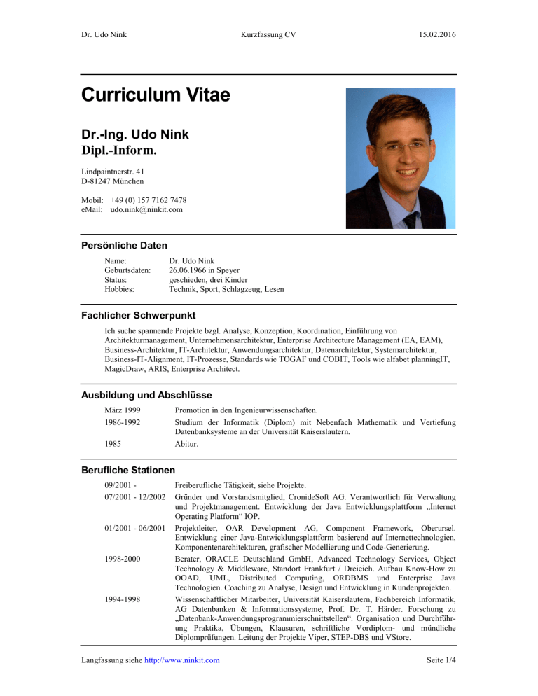 Dr. Udo Nink Kurzfassung CV 15.02.2016 Curriculum Vitae Dr.-Ing. Udo Nink Dipl.-Inform. Lindpaintnerstr. 41 D-81247 München Mobil: +49 (0) 157 7162 7478 eMail: [email protected] Persönliche Daten Name: Geburtsdaten: Status: Hobbies: Dr. Udo Nink 26.06.1966 in Speyer geschieden, drei Kinder Technik, Sport, Schlagzeug, Lesen Fachlicher Schwerpunkt Ich suche spannende Projekte bzgl. Analyse, Konzeption, Koordination, Einführung von Architekturmanagement, Unternehmensarchitektur, Enterprise Architecture Management (EA, EAM), Business-Architektur, IT-Architektur, Anwendungsarchitektur, Datenarchitektur, Systemarchitektur, Business-IT-Alignment, IT-Prozesse, Standards wie TOGAF und COBIT, Tools wie alfabet planningIT, MagicDraw, ARIS, Enterprise Architect. Ausbildung und Abschlüsse März 1999 1986-1992 1985 Promotion in den Ingenieurwissenschaften. Studium der Informatik (Diplom) mit Nebenfach Mathematik und Vertiefung Datenbanksysteme an der Universität Kaiserslautern. Abitur. Berufliche Stationen 09/2001 07/2001 - 12/2002 01/2001 - 06/2001 1998-2000 1994-1998 Freiberufliche Tätigkeit, siehe Projekte. Gründer und Vorstandsmitglied, CronideSoft AG. Verantwortlich für Verwaltung und Projektmanagement. Entwicklung der Java Entwicklungsplattform „Internet Operating Platform“ IOP. Projektleiter, OAR Development AG, Component Framework, Oberursel. Entwicklung einer Java-Entwicklungsplattform basierend auf Internettechnologien, Komponentenarchitekturen, grafischer Modellierung und Code-Generierung. Berater, ORACLE Deutschland GmbH, Advanced Technology Services, Object Technology & Middleware, Standort Frankfurt / Dreieich. Aufbau Know-How zu OOAD, UML, Distributed Computing, ORDBMS und Enterprise Java Technologien. Coaching zu Analyse, Design und Entwicklung in Kundenprojekten. Wissenschaftlicher Mitarbeiter, Universität Kaiserslautern, Fachbereich Informatik, AG Datenbanken & Informationssysteme, Prof. Dr. T. Härder. Forschung zu „Datenbank-Anwendungsprogrammierschnittstellen“. Organisation und Durchführung Praktika, Übungen, Klausuren, schriftliche Vordiplom- und mündliche Diplomprüfungen. Leitung der Projekte Viper, STEP-DBS und VStore. Langfassung siehe http://www.ninkit.com Seite 1/4 Dr. Udo Nink 1992-1994 1986-1992 1985-1986 Kurzfassung CV 15.02.2016 Wissenschaftlicher Mitarbeiter, DFG Sonderforschungsbereich 314 „VLSI-Entwurfsmethoden und Parallelität“, Universität Kaiserslautern. Forschungsthema „Datenbankunterstützung für CAD Frameworks“. Software-Entwicklung für Bitburger Brauerei (Statistiken), Firma Bran und Luebbe in Heidelberg (Automatisierung LKW-Abfertigung Chemieproduktion), Universität Kaiserslautern (Anbindung von Programmiersprachen an Datenbanksprachen). Wehrdienst. Besuchte Schulungen / Konferenzen (Auszug) 03/2012 02/2012 11/2011 05/2011 11/2010 11/2009 09/2009 11/2008 09/2008 08/2008 11/2007 04/2007 01/2007 TOGAF 9 Level 2 Zertifizierung (The Open Group Architecture Framework) TOGAF 9 Level 1 Zertifizierung (The Open Group Architecture Framework) planningIT eXchange 2011, Berlin, 2 Tage (Workshops EA-Einführung & TOGAF) planningIT eXpand (Konfiguration EAM-Tool) & User Group, Berlin, 3 Tage planningIT eXchange 2010, Berlin, 1,5 Tage (Workshop Business IT Alignment) planningIT eXchange 2009, Berlin, 1,5 Tage (Workshop IT Finance Mgmt.) talend Workshop (Open Source Datenintegration), Frankfurt, 0,5 Tage planningIT eXchange 2008, Berlin, 1 Tag Seminar SOA oder nicht SOA, Frankfurt, 1 Tag Workshop Polarion Application Lifecycle Management, Frankfurt, 0,5 Tage planningIT eXchange 2007, Berlin, 1 Tag Erweiterung von und Anfragen in alfabet planningIT (EAM-Tool), Berlin, 2 Tage Konfiguration von alfabet planningIT (EAM-Tool), Berlin, 2 Tage Schlüsselqualifikationen (Auszug) Fremdsprachen Deutsch: Englisch: Französisch: Muttersprache sehr gut in Wort und Schrift, Schulungen / Veröffentlichungen / Vorträge Grundkenntnisse Automotive Finanzen Telekommunikation Projekterfahrung Projekterfahrung Projekterfahrung Sales & Marketing Leasing & Kredit Online-Produkte RUP, OMT Oracle PJM + CDM Weitere Experte Projekterfahrung Projekterfahrung seit 1999, siehe eigene Schulungen 1998 – 2002 kundenseitige Entw.prozesse (auf Nachfrage) z.B. BMW ITPM, BMW META Branchenkenntnisse Methoden (Projektmanagement und Entwicklung) Standards Schwerpunkt Weitere TOGAF, UML, CobiT, J2EE, XML BPEL / BPMN, HTML, JDBC, JMS, JNDI, JSP, Servlets, LDAP, RM/ODP, SQL, STEP, WPDL, XML DTD, XMLSchema, XPath, XPDL, XSLT Werkzeuge (mit Projekterfahrung) Architecture Management: Architecture Documentation: Communication Management: Requirement Management: Configuration Management: Project Management: Langfassung siehe http://www.ninkit.com alfabet planningIT (EAM-Tool, seit 2006, Experte), Visualize IT ARIS, BOC Adonis, IBM Rational Rose, Microsoft Visio, NoMagic MagicDraw (Experte), Sparx Systems Enterprise Architect Microsoft Sharepoint & Outlook, Lotus Notes, Wiki / Confluence HP ALM ant, CVS, Merant PVCS, Rational ClearCase, Subversion CoP.Track, Microsoft Project, Oracle Project Workbench Seite 2/4 Dr. Udo Nink Kurzfassung CV 15.02.2016 Projekterfahrung Architect (Gesamtarchitekt & IT-Architekt), BMW RSPplus, Januar 2015 - heute. Gesamtarchitektur Sales & Marketing Tools für Retail & Direct Sales in Deutschland. - Themenübergreifende Clearing-Stelle für IT-Architektur - Dokumentation der Plan-Architektur - Dokumentation der IST-Architektur - Alignment mit IT-Bebauung / IT Blueprints / Technische Architektur - Architekturentscheidungen (z.B. Integration of salesforce products) - Architekturprämissen (z.B. Einschränkung ändernder Systeme) Systemarchitektur CRM-System (salesforce.com) - Alignment mit Gesamtarchitektur - Variantenmanagement für Märkte - Baukasten für Geschäftsprozessmanagement & Fachkonzepte Optimierung der Entwicklungsmethodik - Tailoring des Entwicklungsprozesses bzgl. Salesforce - Tooling: Plugin für MagicDraw & Schnittstelle zu HP ALM - Dokumentat