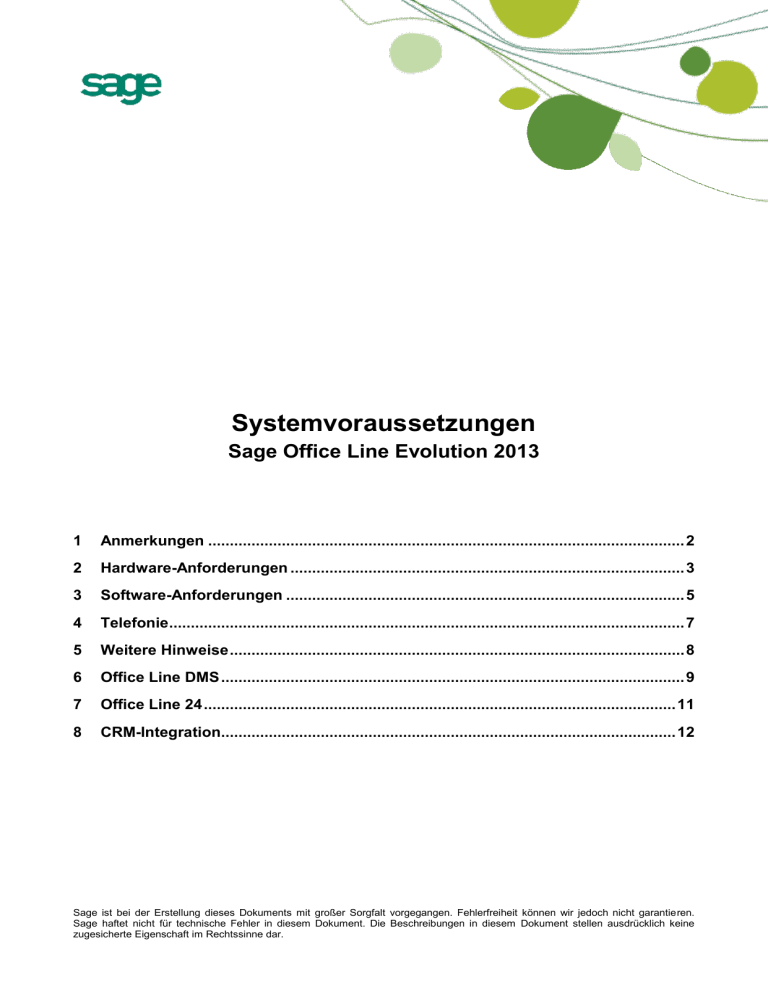 Systemvoraussetzungen Sage Office Line Evolution 2013 1 Anmerkungen .............................................................................................................. 2 2 Hardware-Anforderungen ........................................................................................... 3 3 Software-Anforderungen ............................................................................................ 5 4 Telefonie....................................................................................................................... 7 5 Weitere Hinweise ......................................................................................................... 8 6 Office Line DMS ........................................................................................................... 9 7 Office Line 24 ............................................................................................................. 11 8 CRM-Integration......................................................................................................... 12 Sage ist bei der Erstellung dieses Dokuments mit großer Sorgfalt vorgegangen. Fehlerfreiheit können wir jedoch nicht garantieren. Sage haftet nicht für technische Fehler in diesem Dokument. Die Beschreibungen in diesem Dokument stellen ausdrücklich keine zugesicherte Eigenschaft im Rechtssinne dar. 1 Anmerkungen Die Sage Office Line Evolution 2013 verwendet als Basis die 32bit-Version von Microsoft Access 2010 und setzt daher die Ressourcen voraus, die in diesem Umfeld auch von Microsoft empfohlen werden. Aus der Praxis hat sich gezeigt, dass die in diesem Dokument genannten Voraussetzungen mindestens gegeben sein müssen. Bitte beachten Sie, dass die hier genannten Voraussetzungen nur für die Office Line Evolution 2013 gelten. Die Voraussetzungen für andere Sage-Produkte finden Sie jeweils auf den entsprechenden anderen Installationsdatenträgern oder auf der Homepage in den entsprechenden anderen Bereichen. Ist in diesem Dokument von 64bit die Rede, so ist damit die Standard-Prozessorarchitektur (x64) gemeint. Intels Itanium-Prozessorarchitektur (i64) wird nicht unterstützt. © Sage Software GmbH 2 Stand: 11/2012 2 Hardware-Anforderungen Bitte beachten Sie bei den im Folgenden genannten Hardware-Anforderungen, dass: neuere Rechner viele Möglichkeiten bieten, Strom zu sparen. Diese Möglichkeiten können unter Anderem beinhalten, die Leistung diverser Hardware-Komponenten zu beschränken (z.B. den Prozessortakt begrenzen). Sollten solche Stromsparfunktionen eingesetzt werden, so entspricht solch ein Rechner unter Umständen in der Realität nicht den hier genannten Voraussetzungen, selbst wenn er dies in der Theorie (also auf dem Papier) eigentlich tut. sich die hier genannten Werte auf Rechner beziehen, auf denen nur die für den Betrieb der entsprechenden Software (z.B. SQL-Server oder Applikationsserver) notwendigen Programme laufen (im Falle eines Einplatzrechners oder Clients also im Wesentlichen das Betriebssystem, Microsoft Access (Runtime) und die Office Line selbst; im Falle des SQL-Servers nur der SQL-Server). Sollten die Rechner auch für andere Zwecke verwendet werden, so sind die Werte entsprechend zu erhöhen. die hier genannten Werte nur für den „üblichen“ Betrieb der Sage Office Line Evolution 2013 gelten (maximal ein gestartetes Rechnungswesen und eine gestartete Warenwirtschaft pro Sitzung). Wenn also z.B. der Mehrfachstart der Office-Line-Applikationen regelmäßig genutzt werden soll, so sind die Werte ebenfalls entsprechend zu erhöhen. 2.1 SQL-Server mindestens Pentium-Prozessor (oder vergleichbare Leistungsdaten) mit einer Taktfrequenz von 2,33 GHz Dual Core (empfohlen Quad Core oder besser) 4 GB Arbeitsspeicher (empfohlen 8 GB Arbeitsspeicher), bei 64bit-Hard- und Software verdoppeln sich diese Werte 50 GB freier Festplattenplatz (Dateisystem NTFS oder neuer) Windows-kompatibles TCP/IP-Netzwerk auf Basis einer Microsoft-Domänenstruktur (empfohlen) oder eines Peer-To-Peer-Netzes mit mindestens 100 Mbit/s (empfohlen 1.000 Mbit/s) 2.2 Terminalserver mindestens Pentium-Prozessor (oder vergleichbare Leistungsdaten) mit einer Taktfrequenz von 2,33 GHz Dual Core (empfohlen Quad Core oder besser) für den freien Festplattenplatz gelten die entsprechenden Angaben für Einplatzrechner oder Netzwerk-Client (siehe Punkt 2.4) 2 GB Arbeitsspeicher; pro Sitzung weitere 256 MB (empfohlen 4 GB, pro Sitzung weitere 384 MB), bei 64bit-Hard- und Software verdoppeln sich diese Werte Windows-kompatibles TCP-IP-Netzwerk auf Basis einer Microsoft-Domänenstruktur (empfohlen) oder eines Peer-To-Peer-Netzes mit mindestens 100 Mbit/s (empfohlen 1.000 Mbit/s) © Sage Software GmbH 3 Stand: 11/2012 2.3 Applikationsserver mindestens Pentium-Prozessor (oder vergleichbare Leistungsdaten) mit einer Taktfrequenz von 2,33 GHz Dual Core (bis max 10 Benutzer; Quad Core bis max. 50 Benutzer; darüber hinaus erhöhen sich die Anforderungen entsprechend) für den freien Festplattenplatz gelten die entsprechenden Angaben für Einplatzrechner oder Netzwerk-Client (siehe Punkt 2.4) mindestens 4 GB Arbeitsspeicher (bis max. 25 Benutzer; darüber hinaus je 25 zusätzliche Benutzer 1 GB zusätzlicher Arbeitsspeicher) Windows-kompatibles TCP-IP-Netzwerk auf Basis einer Microsoft-Domänenstruktur (empfohlen) oder eines Peer-To-Peer-Netzes mit mindestens 100 Mbit/s (empfohlen 1.000 Mbit/s) 2.4 Einplatzrechner/Netzwerk-Client Grafikauflösung mindestens 1.024x768 bei Schriftgröße 100% und Punktdichte 96dpi (einzelne Teile können auch höhere Auflösungen erfordern); bei von 100% abweichenden Schriftgrößen und/oder höherer Punktdichte sind ebenfalls entsprechend höhere Auflösungen erforderlich (empfohlen 1.280x1024, 96 dpi) aufgrund von Beschränkungen in Microsoft Access darf die maximale Breite oder Höhe des Access-Fensters (und damit des Anwendungsfensters der Sage Office Line Evolution 2013) einen Wert von 22,75* Zoll nicht überschreiten. We