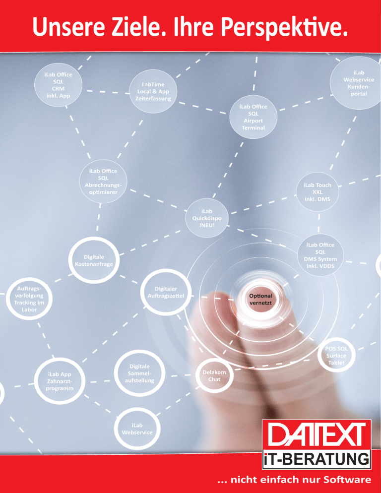 Unsere Ziele. Ihre Perspektive. iLab Office SQL CRM inkl. App iLab Webservice Kundenportal LabTime Local & App Zeiterfassung iLab Office SQL Airport Terminal iLab Office SQL Abrechnungsoptimierer iLab Touch XXL inkl. DMS iLab Quickdispo !NEU! iLab Office SQL DMS System inkl. VDDS Digitale Kostenanfrage Auftragsverfolgung Tracking im Labor Digitaler Auftragszettel iLab App Zahnarztprogramm Digitale Sammelaufstellung Optional vernetzt POS SQL Surface Tablet Delakom Chat iLab Webservice iT-BERATUNG ... nicht einfach nur Software Unsere Ziele - Ihre Perspektive Die Flut digitaler Daten in Labor und Praxis wird immer mehr und unübersichtlich. Schnittstellenstandards, die bestehende Produkte miteinander verbinden, sind nicht in Sicht. Die DATEXT iLab Software ist der zentrale Baustein für Labore, der alle bestehenden Insellösungen ablöst und in einer einfachen Applikation zusammenfasst. Situation heute: Viele Programme. Wilde Strukturen. Zahlreiche Medienbrüche. Doppelprozesse und Mehrfacherfassung. Normal in vielen Dentallabors: Kunden Prozesse Datenaustausch Praxis Angebote, Rechnungen etc. per Mail, Sticks, SD-Karten Datenaustausch Chats (z.B. WhatsApp, Skype, Dropbox) Auftragserfassung konservativ auf Papier oder über Internetseiten Datenaustausch Smartphones (FB Messenger, SMS etc.) Kundenportallösungen (Nimbudent, Portallösungen von Depots, Industrie) Portale für Mundscanaufträge, Funktionsdiagnostik, Implantologie (Portallösungen von Depots, Industrie) Auftragsverfolgung (Tracking, wie DHL, DPD u.a.) Patientenrecall Labor Prozesse CRM Systeme, wie z.B. Act, Excel usw. Handyapps, Messenger, WhatsApp etc. Auftragserfassung konservativ analog oder Auftragserfassungssoftware Auftragssteuerung, konservativ mit Steckkarten, Auftragsbüchern oder eigene Entwicklungen DMS Systeme, wie DATEV, Elo u.a. Verschiedene Verwaltungssysteme für „digitale“ Dentaldaten in CADCAM Programmen, Funktionsdiagnostik etc. Rechnungslegung und Verwaltung Übermittlung von Rechnungsdaten per Mail, Sticks, SD-Karten Produktivitätsbewertung, Prämienlohnermittlung mit Stechuhren oder Papierdokumentation von Mitarbeiterarbeitszeiten Endlich: Ein System für alles! Mit unserem starken Entwicklerteam und unserem in 40 Jahren gewachsenen, dentalen Netzwerk ist es uns gelungen, als erster Anbieter ein Gesamtpaket zu entwickeln, das alle Markteilnehmer durch verbindliche Schnittstellen erreicht. Eine führende Rolle nehmen dabei unsere Praxis-Kommunikationslösungen ein. Diese verfügen über Schnittstellen zu den führenden Praxisverwaltungsprogrammen. Moderne Informations- und Kommunikationstechnologien haben ein großes Potenzial zur Verbesserung der Qualität und Wirtschaftlichkeit der zahnmedizinischen und zahntechnischen Versorgung. Kaufmännische Workflows zwischen Praxen- und Labors digitalisieren Aus diesem Grund wurde erstmals ein lückenloser digitaler Workflow zwischen Praxen und Labors mit Schnittstellen zwischen den beiden marktführenden Dentalabrechnungsprogrammen der Compugroup Medical (Praxis) und DATEXT (Labor) entwickelt und in der Praxis getestet. Die neuen Schnittstellen ermöglichen signifikantes Einsparungspotential bei Zeit und Geld, sowohl in der Praxis als auch im Labor. CAD CAM und digitale Zahntechnik in der Praxis und im Labor perfekt managen Zudem wurden die wichtigsten Player „digitaler“ Zahntechnik mit in das iLab-Gesamtkonzept integriert. Egal, ob Ihnen Daten von Praxen oder Kooperationspartnern zugeliefert werden. Extraorale oder intraorale Kameraaufnahmen, Mundscans, Smartphone-Bilder, Funktionsdiagnostikdaten werden auftragsbezogen in iLab gespeichert und verwaltet. Ihre Daten integrieren Sie spielend einfach in Ihren Laborworkflow. Das neue iLab DMS System mit VDDS-Schnittstelle speichert und verwaltet sie. Über die iLab Touchsysteme bringen Sie diese Daten zu Ihren Technikern. Das Ganze wird unterstützt durch Transponder oder Barcodetechnologie, so dass ein spielend einfacher Ablauf realisiert wird. Ihre „digitale Zahntechnik“ realisieren Sie bequem aus Ihrer iLab Auftragssteuerung. So wissen Ihre Techniker aufgrund der digitalen ToDo-Listen in iLab Touch, was zu tun ist. Nichts wird mehr vergessen. Hat die Praxis digitale Daten geliefert, so können diese direkt aus dem Auftrag aufgerufen und bearbeitet werden. Müssen digitale Daten im Fertigungsprozess erzeugt werden (z.B. Scans), so können Sie auch dies direkt aus dem Auftrag heraus erledigen. Haben Ihre Techniker Fragen, so ermöglicht der DelaKom Chat einen direkten Austausch mit dem Abteilungsleiter, Chef oder (aber auch) mit der Praxis in Echtzeit. Rechtssicherheit beim Datentransfer Alle Kommunikationswege im Labor, aber auch zu Ihren Behandlern sind mit iLab rechtssicher. Alle Daten sind hochsicher verschlüsselt und werden über eine sichere Anbindung im https-Standard an Ihre Praxen übertragen. So begeben Sie sich und Ihre Kunden zum Thema Datenschutz nicht unnötig „aufs Glatteis“. Das gilt natürlich auch für Ihre Rechnungslegung. Workflow heute Praxis 1 Mundscanner Röntgen Portallösung Hersteller E-Mail USB-Stick DVD Praxis 2 KostenvorKostenanschläge anfragen Rechnungen Aufträge per per Telefax Telefon Brief Telefax USB an das an die Labor Praxis Praxis 3 Praxis 4 Praxis 5 Freecorder Intraoralkamera Handyfotos E-Mail Chip x-Schnittstellen Labor E-Mail USB-Stick DVD PC 1 Hersteller Mundscanner PC 2 Röntgen & Funktionsdiagnostik WhatsApp Messenger Skype Sonstige Rechner Abrechnungs-PC Post Brief FactoringGesellschaft LaborHandy Zahntechniker vor Ort beim Kunden WhatsApp E-Mail / SMS Keine Konnektivität Chef unterwegs oder im Urlaub Optimierter Workflow mit iLab Mundscanner, Röntgen digital Freecorder IntraoralKamera Handy-Fotos iLab App Praxis Praxis 1 Praxis 2 Praxis 3 Praxis 4 Kostenanfragen, Aufträge, Rechnungen iLab Kundenportal Schnittstelle Labor Factoring Gesellschaft Portalschnittstelle Geschäftsführer Zugriff von unterwegs über iLab Surface iLab office Labormanagement 