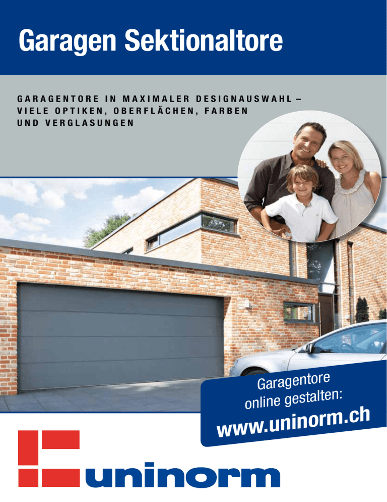 Garagen Sektionaltore GARAGENTORE IN MAXIMALER DESIGNAUSWAHL – VIELE OPTIKEN, OBERFLÄCHEN, FARBEN UND VERGLASUNGEN Garagentore ten: l a t s e g e n i l on h c . m r o n www.uni Sektionaltore in Markenqualität • KOMFORTABEL • SICHER • INDIVIDUELL Attraktive Design- und Farbauswahl Platzsparende Technik Wärmegedämmt, sicher, stabil Geräuscharmer Torlauf Komfortables Antriebssystem Einfache Montage Ideal für die Renovierung Uninorm Garagen Sektionaltore setzen in vielerlei Hinsicht neue Massstäbe. Angefangen bei den vielfältigen Torvarianten und Oberflächen-Designs über herausragende Sicherheitslösungen, wie den patentierten Fingerklemmschutz, bis hin zu perfektionierter Beschlagstechnik und intelligenten Antriebssystemen. Erstklassiges Material, präzise Verarbeitung, patentierte technische Details und die ständigen Qualitätsprüfungen im Rahmen der DIN ISO 9001 garantieren höchste Sicherheit, Zuverlässigkeit und lange Lebensdauer. Das macht unsere Tore für jeden Bauherren und Renovierer zu einer lohnenden Investition. 2 2 Platzsparende Konstruktion Viel Platz vor und in der Garage Bei einem Sektionaltor zieht sich das Torblatt senkrecht nach oben unter die Garagendecke zurück. So gewinnen Sie mehr Platz im Vergleich zum herkömmlichen Schwingtor. Das Parken direkt vor dem Tor ist kein Problem und auch der Garagen-Innenraum wird durch die 90°-Umlenkung optimal genutzt. GSW 40-L: Torbreite bis 5,50 Meter möglich. Da hat auch der Zweitwagen Platz. minimaler Sturzbedarf: ab 115 mm alternativ: höher geführte Variante mit 240 mm Sturz Speziell im Renovierungsfall hat die Garage oft keinen oder einen sehr geringen Sturz. Eine horizontale Sturzblende gleicht den Sturzbedarf aus und ermöglicht auch die Montage bei fehlendem Sturz. 3 Entspanntes Rein- und Rausfahren durch grösseren Seitenabstand. Im Gegensatz zu Schwingtoren gibt es bei einem Sektionaltor keine Einschränkungen. Vielfältige Oberflächen •PASSEND ZU JEDEM HAUSSTIL Farben für jeden Geschmack Jetzt in hteter c i h c s e b d n e Oberfläche Repräsentative Optiken Die Oberflächenoptik kann leicht auf den eigenen Hausstil abgestimmt werden. Zur Auswahl stehen fast alle RAL- und NCS-Farben. Alle Oberflächen sind endbeschichtet. Sicke Mittelsicke ohne Sicke* Kassette Trendfarben zum Vorzugspreis RAL 3000 Feuerrot RAL 5010 Enzianblau RAL 6005 Moosgrün RAL 6009 Tannengrün Attraktive Oberflächen Das moderne Stahltor in klassischer Holzoptik (S. 9) RAL 7016 Anthrazitgrau RAL 7035 Lichtgrau woodgrain RAL 7040 Fenstergrau Golden Oak* RAL 8014 Sepiabraun microprofiliert* Mahagoni* RAL 9001 Cremeweiss RAL 9006 Weissaluminium stucco Dunkle Eiche* RAL 9007 Graualuminium TT 703 TT 703 – Der besondere metallische Effekt: Eisenglimmerfarbe Grauton mit Eisenglimmerpartikeln, nicht hochglänzend. glatt* *Steht nur bei der Torvariante GSW 40-L zur Auswahl. 4 Mit Verglasung gestalten Typ Edelstahl-Rundverglasung (auch in Kunststoff) Typ Rechteck 1 Typ Rechteck 2 Typ Rechteck 3* Typ Kreuzsprosse Typ Mehrfachsprosse Formschöne Verglasungselemente können die Attraktivität Ihres Tores noch steigern. Abgestimmt auf Nebentür, Fenster oder Eingangstür erhält die Gesamtarchitektur Ihres Hauses eine besonders prägende Optik. Dank einfallendem Tageslicht lässt sich die Garage z.B. noch besser als Werkstatt oder Hobbyraum nutzen. Die Glaselemente stehen in vielen Varianten, von der Rundverglasung bis zum Sprossenfenster, zur Verfügung. Typ Rautensprosse Typ Quadrat 1* Typ Quadrat 2* Typ Alu-Lichtband Rundverglasung* Wählen Sie aus drei extrem kratzfesten Ausführungen: „Klarglas“ „Kristallstruktur“ Rechteck 1 Alu-Lichtband 5 „Satiniertes Glas“ Typ GSW 40-L 40 mm •DOPPELWANDIG •40 MM DICKE STAHLSEKTIONEN und l i b a t s h c ho end m m ä d e m wär Sektionaltore nach Mass Das GSW 40-L ermöglicht extreme Torbreiten von bis zu 5,50 m. Attraktive, moderne Optiken 4 Prägungen für interessante Gestaltungsvarianten: Sicke, Mittelsicke, ohne Sicke, Kassette Formschöne Verglasungen Bringen Licht in Ihre Garage und unterstreichen Ihre Individualität. Elegante Oberflächen 4 stilvolle und elegante Strukturen: woodgrain, stucco, microprofiliert und glatt Nebentüren und Schlupftüren Passend zu allen Optiken (S.12) Große Farbauswahl Viele Trendfarben zum Vorzugspreis, alle RALFarben sowie verschiedene Holzdekore. Die Sektionaltore GSW 40-L werden standardmässig aussen in Verkehrsweiss (in Anlehnung an RAL 9016) und innen in Grauweiss (RAL 9002) geliefert. 6 Umfassendes Sicherheitspaket Optimaler Rundumschutz durch TÜV-geprüften Einbruchschutz, elektronische Lichtschranke, patentierten Fingerklemmschutz, doppelte Zugfedertechnik. Maximale Gestaltungsvielfalt Optik „Sicke“ Bei der beliebten Sickenoptik stehen vier repräsentative Oberflächenstrukturen zur Auswahl: „woodgrain“, „stucco“, „microprofiliert“ und als ästhetische, minimalistische Designvariante die Oberfläche „glatt“. Optik „Mittelsicke“ Die Optik Mittelsicke als interessante Gestaltungsalternative zur Standard-Sicke. Minimiert auf eine Sicke pro Sektion erhält die Toranlage eine grosszügige, raumgreifende Anmutung. Wählen Sie aus den Oberflächen „woodgrain“, „stucco“, „microprofiliert“ und „glatt“. 7 Typ GSW 40-L Optik „ohne Sicke“ Sektionaltore ohne Sicken überzeugen durch puristisches Design. Die grossflächigen Elemente haben ihre eigenständige Ästhetik und geben der Architektur einen hochmodernen Charakter. Das Torblatt ist in den Oberflächen „woodgrain“, „stucco“, „microprofiliert“ und „glatt“ erhältlich. Optik „Kassette“ Die edle Oberfläche mit den grosszügigen Kassettenelementen vermittelt dem Tor eine hochwertige Ausstrahlung. Der harmonische Eindruck der Tore wird durch die gleichmässige Anordnung der Kassetten erreicht. Hier steht die Oberflächenstruktur „woodgrain“ zur Verfügung. 8 Wohnlicher Holzcharakter Holzdekor Stahltore mit Holzdekorfolien ve