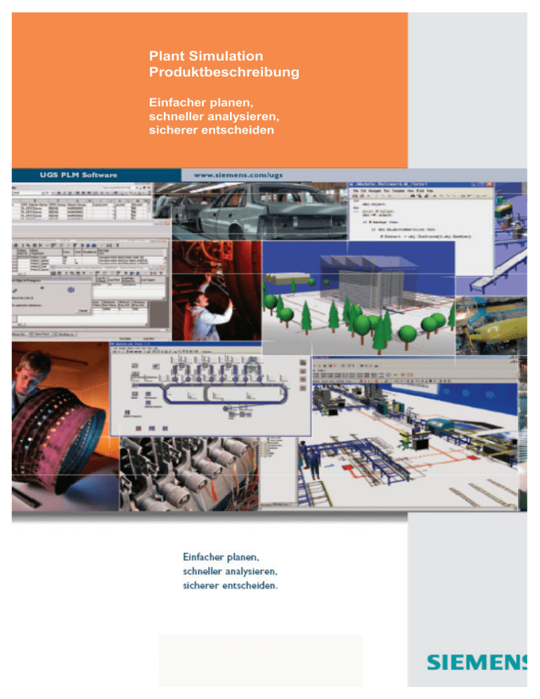 Plant Simulation Produktbeschreibung Einfacher planen, schneller analysieren, sicherer entscheiden Seite 2 Plant Simulation Produktbeschreibung Tecnomatix Plant Simulation ist die Standardsoftware zur grafischen Modellierung, Visualisierung, Simulation und Optimierung von Produktion, Logistik und Geschäftsprozessen Tecnomatix Plant Simulation Copyright Siemens Product Lifecycle Management Software (II) GmbH; Alle Rechte vorbehalten. Dieses Dokument ist Eigentum der Siemens Automation & Drives, Siemens Product Lifecycle Management Software (II) GmbH. Es darf weder als Ganzes noch in Teilen ohne schriftliche Genehmigung veröffentlicht werden. Das Werk ist urheberrechtlich geschützt. Die dadurch begründeten Rechte, insbesondere die der Übersetzung, des Nachdrucks, der Bildentnahme, der Funksendung, der Wiedergabe auf fotomechanischem Wege, Speicherung oder Auswertung in Datenverarbeitungsanlagen bleiben, auch bei Verwertung von Teilen des Werkes, dem Urheber vorbehalten. Die in diesem Handbuch erwähnten Software- und Hardware-Bezeichnungen sind in den meisten Fällen auch als eingetragene Warenzeichen geschützt und unterliegen als solche den gesetzlichen Bestimmungen. . Tecnomatix Plant Simulation Produktbeschreibung 1 Einführung und Zusammenfassung................................................................................................... 5 2 Das Produkt Tecnomatix Plant Simulation .................................................................................... 8 2.1 Philosophie..................................................................................................................................... 8 2.2 Besondere Merkmale ..................................................................................................................... 9 2.2.1 Grafische und benutzerfreundliche Arbeitsumgebung..................................................................... 11 2.2.2 Hierarchie ................................................................................................................................. 12 2.2.3 Vererbung ................................................................................................................................. 13 2.2.4 Bausteinkonzept ........................................................................................................................ 14 2.2.5 Programmgesteuerte Modellgenerierung....................................................................................... 16 2.2.6 Änderung und Wartung von Modellen ......................................................................................... 16 2.2.7 Kommunikations- und Integrationsfähigkeit .................................................................................. 17 2.2.8 Dialogmasken............................................................................................................................ 19 2.2.9 Mehrsprachigkeit ....................................................................................................................... 20 2.2.10 HTML Interface .................................................................................................................... 21 2.2.11 Plant Simulation 3D-Visualisierung .......................................................................................... 22 2.3 Beschreibung der Software........................................................................................................... 23 2.4 Spezifikationen ............................................................................................................................. 32 2.4.1 Plant Simulation Optimierung...................................................................................................... 35 2.4.2 Verteilte Simulation .................................................................................................................... 36 2.4.3 Neuronales Netz ....................................................................................................................... 37 2.4.4 Kürzeste Wegefindung für Fahrzeuge und Mitarbeiter .................................................................. 38 2.4.5 Plant Simulation DDE................................................................................................................. 39 2.5 In Plant Simulation frei verfügbare Bibliotheken............................................................................ 40 2.6 Optionale Produkte...................................................................................................................... 40 2.6.1 Plant Simulation Optionen .......................................................................................................... 41 2.6.2 Plant Simulation Interface Paket.................................................................................................. 42 2.6.3 Plant Simulation Gantt ............................................................................................................... 45 2.6.4 Plant Simulation SDX - Layoutbasierte Simulation mit der Factory CAD – Plant Simulation Integration46 2.6.5 Plant Simulation Process Designer Integration und automatische Modellgenerierung: Auslegung neuer Planungskonzepte in Produktion und Logistik ............................................................................................. 47 2.6.6 Bausteinkästen .......................................................................................................................... 48 3 Einsatzgebiete und Praxisbeispiele von Plant Simulation........................................................... 57 3.1 Achsmontage in der Automobilindustrie ...................................................................................... 58 3.2 Supply Chain Management Modell mit Aris-Bausteinen................................................................. 59 3.3 Maschinenbau Förderanlagen und Transfersysteme ..............................