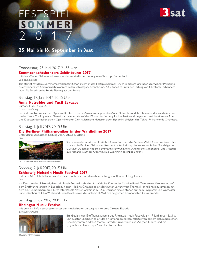 FESTSPI EL 2 0 1 7 25. Mai bis 16. September in 3sat Donnerstag, 25. Mai 2017, 21.55 Uhr Sommernachtskonzert Schönbrunn 2017 mit den Wiener Philharmonikern unter der musikalischen Leitung von Christoph Eschenbach Live zeitversetzt 3sat startet mit dem „Sommernachtskonzert Schönbrunn“ in den Festspielsommer. Auch in diesem Jahr laden die Wiener Philharmoniker wieder zum Sommernachtskonzert in den Schlosspark Schönbrunn. 2017 findet es unter der Leitung von Christoph Eschenbach statt. Als Solistin steht Renée Fleming auf der Bühne. Samstag, 17. Juni 2017, 20.15 Uhr Anna Netrebko und Yusif Eyvazov Suntory Hall, Tokyo, 2016 Erstausstrahlung Sie sind das Traumpaar der Opernwelt: Die russische Ausnahmesopranistin Anna Netrebko und ihr Ehemann, der aserbaidschanische Tenor Yusif Eyvazov. Gemeinsam stehen sie auf der Bühne der Suntory Hall in Tokio und begeistern mit berühmten Arien und Duetten der italienischen Opernliteratur. Der italienische Maestro Jader Bignamini dirigiert das Tokyo Philharmonic Orchestra. Samstag, 1. Juli 2017, 20.15 Uhr Die Berliner Philharmoniker in der Waldbühne 2017 unter der musikalischen Leitung von Gustavo Dudamel Live Sie ist eine der schönsten Freilichtbühnen Europas: die Berliner Waldbühne. In diesem Jahr spielen die Berliner Philharmoniker dort unter Leitung des venezolanischen Topdirigenten Gustavo Dudamel Robert Schumanns schwungvolle „Rheinische Symphonie“ und Auszüge aus Richard Wagners Opernzyklus „Der Ring des Nibelungen“. © ZDF und rbb/Bolk/Berliner Philharmoniker Sonntag, 2. Juli 2017, 20.15 Uhr Schleswig-Holstein Musik Festival 2017 mit dem NDR Elbphilharmonie-Orchester unter der musikalischen Leitung von Thomas Hengelbrock Live Im Zentrum des Schleswig-Holstein Musik Festival steht der französische Komponist Maurice Ravel. Zwei seiner Werke sind auf dem Eröffnungskonzert in Lübeck zu hören: Hélène Grimaud spielt dort unter Leitung von Thomas Hengelbrock zusammen mit dem NDR Elbphilharmonie-Orchester Ravels Klavierkonzert in D-Dur. Darüber hinaus stehen auf dem Programm die OrchesterSuite „Daphnis et Chloé“, ebenfalls von Ravel, sowie die Sinfonie d-Moll des belgischen Komponisten César Franck. Samstag, 8. Juli 2017, 20.15 Uhr Rheingau Musik Festival mit dem hr-Sinfonieorchester unter der musikalischen Leitung von Andrés Orozco-Estrada Erstausstrahlung Bei diesjährigen Eröffnungskonzert des Rheingau Musik Festivals am 17. Juni in der Basilika von Kloster Eberbach spielt das hr-Sinfonieorchester, geleitet von seinem kolumbianischen Chefdirigenten Andrés Orozco-Estrada, Ouvertüren aus Wagner-Opern und die „Symphonie fantastique“ von Hector Berlioz. © Ansgar Klostermann 1 FESTSPI EL 2 0 1 7 Samstag, 8. Juli 2017, 21.55 Uhr Verbier Festival 2016: András Schiff Der ungarische Pianist András Schiff gehört zu den Größen der heutigen Musikwelt. Seine Gesamtaufnahmen von Bach, Schumann, Schubert und Beethoven sind Denkmale der Klavierliteratur. In Verbier spielen Schiff und das Verbier Festival Chamber Orchestra Bach, Haydn, Beethoven und Mozart. Samstag, 15. Juli 2017, 20.15 Uhr Klassik am Odeonsplatz 2017 mit dem Symphonieorchester des Bayerischen Rundfunks unter der musikalischen Leitung von Manfred Honeck Live Bei „Klassik am Odeonsplatz“ spielt Weltstar Lang Lang auf Münchens schönster Open-­ Air-Bühne zusammen mit dem Symphonieorchester des Bayerischen Rundfunks unter Leitung des österreichischen Dirigenten Manfred Honeck. Geboten werden Werke von Rachmaninow, Dvořák und Schostakowitsch. © Felix Broede Samstag, 15. Juli 2017, 21.55 Uhr Verbier Festival 2016: Eröffnungskonzert Charles Dutoit und Kyung Wha Chung spielen Brahms und Berlioz Charles Dutoit, seit 2009 Leiter des Verbier Festival Orchesters, und die Violinistin Kyung Wha Chung eröffnen das „Verbier Fest­ ival 2016“ im Zeichen der Romantik mit Brahms und Berlioz. Zum Auftakt des Eröffnungskonzerts interpretiert die südkoreanische Geigerin, begleitet vom Verbier Festival Orchestra, Brahms‘ Konzert für Violine und Orchester in D-Dur op. 77. Es folgt die berühmte „Symphonie fantastique“ von Hector Berlioz. Sonntag, 16. Juli 2017, 11.15 Uhr styriarte 2017 La Margarita - Ein barockes Rossballett Eingebettet in ein buntes Musiktheater lässt die styriarte 2017 mit „La Margarita“ die Reitkunst des Barock in Form eines „Rossballetts“ vor der Kulisse des Schlosses Schielleiten in der Steiermark aufleben. Die Geschichte um den Helden Herkules und die Goldenen Äpfel der Hesperiden orientiert sich an der historischen Aufführung, die Kaiser Leopold I. im Jahr 1667 zu seiner Hochzeit mit der spanischen Infantin Margarita Teresa in Wien ausrichten ließ. Mittwoch, 19. Juli 2017, 10.15 Uhr Eröffnung Bregenzer Festspiele 2017 Live Die Eröffnung der Bregenzer Festspiele überträgt 3sat live aus dem Großen Saal des Festspielhauses. In diesem Jahr starten die Festspiele mit Georges Bizets Oper „Carmen“ auf der Bregenzer Seebühne in ihre 72. Saison. Im Festspielhaus kommt „Moses in Ägypten“ von Gioachino Rossini zur Aufführung. Samstag, 22. Juli 2017, 20.15 Uhr Petite Messe solennelle Ballett am Rhein tanzt Rossini Erstausstrahlung „In Bewegung bleiben, Stillstand vermeiden“: Mit diesem Credo bringt Choreograf Martin Schläpfer mit jeder Premiere frischen Wind in die Tanzlandschaft. Sein Ballett am Rhein zählt derzeit zu den gefragtesten Ensembles weltweit. Am 2. Juni 2017 stellt Martin Schläpfer im Opernhaus Düsseldorf sein neues abendfüllendes Stück vor – als Premiere und gleichzeitige Uraufführung: In „Petite Messe solennelle“ setzt er sich intensiv mit der gleichnamigen vielschichtigen Komposition von Gioachino Rossini auseinander. 1864 schrieb der italienische Opernkomponist dieses Alterswerk und stellte ihm mit gehörigem Understatement das Attribut „klein“ voran. 2 FESTSPI EL 2 0 1 7 Samstag, 22. Juli 2017, 21.50 Uhr Sommernachtsgala Grafenegg 2017 unter der musikalischen Leitung von Yu