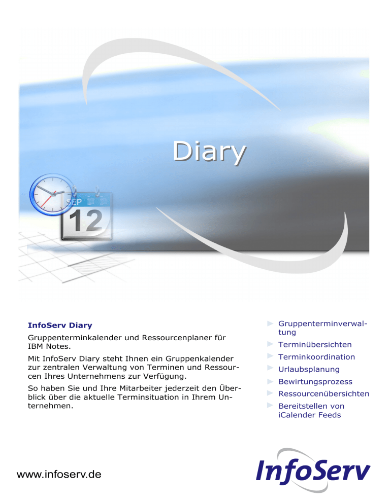 InfoServ Diary Gruppenterminkalender und Ressourcenplaner für IBM Notes. Mit InfoServ Diary steht Ihnen ein Gruppenkalender zur zentralen Verwaltung von Terminen und Ressourcen Ihres Unternehmens zur Verfügung. So haben Sie und Ihre Mitarbeiter jederzeit den Überblick über die aktuelle Terminsituation in Ihrem Unternehmen. www.infoserv.de Gruppenterminverwaltung Terminübersichten Terminkoordination Urlaubsplanung Bewirtungsprozess Ressourcenübersichten Bereitstellen von iCalender Feeds InfoServ Diary InfoServ Diary—Gruppenterminkalender und Ressourcenplaner Zentrale Koordination von Terminen, Ressourcen und Aufgaben InfoServ Diary sammelt die Termine und Aufgaben von Mitarbeitern aus deren Maildatenbanken und stellt diese übersichtlich in einem zentralen System dar. Durch Übersichten erhalten Sie schnellen Zugang zu den Terminen und Fragen wie „wann hat welcher Mitarbeiter in der Abteilung Urlaub“ oder „wie ist die der Raum belegt“ sind schnell und einfach zu beantworten. Bewirtungsprozess inklusive. Direkt bei der Raumreservierung Durch eine Erweiterung in der IBM Domino Mailschablone kann bei der Terminerstellung direkt mit der Raumreservierung die Bewirtungsanforderung mit eingegeben werden. In InfoServ Diary werden Bewirtungsmitarbeiter über die Räume mit Bewirtungsanforderungen des aktuellen Tages informiert. Zuordnung von Abteilungen, Gruppen oder Projekten In der Konfiguration kann jeder Mitarbeiter zu Abteilungen, Gruppen oder Projekten zugeordnet werden. Durch die Zuordnung integriert sich InfoServ Diary in Ihre Unternehmensprozesse und Sie haben einen einfachen Überblick über die Termine Ihrer Abteilung oder über aktuell laufende Projekte. Standortübergreifende Terminkoordination inklusive Die Termine und Aufgaben werden sowohl Server- als auch Standortübergreifend gesammelt. Damit haben auch verteilte Organisationen einen zentralen Überblick über Ihre Termine und Aufgaben. Integration in Ihre Unternehmens-IT Damit InfoServ Diary optimal zu Ihnen passt, lässt es sich anhand Ihrer Unternehmensprozesse erweitern. Mit unserer Produktpalette rund um CRM integrieren wir das CRM mit Ihrem ERP System. So bietet die InfoServ Pump z.B. Connectoren zu SAP, DB2, Oracle oder MS SQL. Für Auswertungen und Reporting steht Ihnen mit dem InfoServ Analyzer ein Werkzeug mit der bewährten InfoZoom Technologie zur Verfügung. www.infoserv.de InfoServ Produkte rund um CRM InfoServ Customer Information Center InfoServ Diary InfoServ Pump InfoServ Analyzer InfoServ WebContent InfoServ Portal Server InfoServ Signature Die wichtigsten Funktionen im Überblick Übersichtliche Darstellung von Terminen und Aufgaben von Personen und Gruppen Schneller Überblick über Termine von Abteilungen, Gruppen oder Personen auf Tages-, Wochen– oder Monatsebene Einfacher und Intuitiver Bewirtungsprozess direkt bei der Raumreservierung Zuordnung von Mitarbeitern zu frei definierbaren Gruppen Individuelle Zugriffsvergabe auf Termin- und Gruppenebene Freie Definition von Farben für Terminarten Bereitstellen von Terminen als iCalendar Feed Automatisches Sammeln von Terminen über Server und Standorte hinweg Komfortable Protokollmechanismen mit automatischer Benachrichtigung im Problemfall www.infoserv.de InfoServ AG - Ihr CRM Partner Die InfoServ AG unterstützt Unternehmen bei der Optimierung der CRM Prozesse. Das InfoServ Customer Information Center und ergänzende Bausteine der InfoServ AG garantieren einen langfristigen Erfolg in CRM Projekten. Mit unseren Produkten und Dienstleistungen sind wir Zulieferer für Technologie und Know-how. Unsere Technologien können als fertige Module in die Produktpalette unserer Kunden integriert werden. Als IBM Business Partner bieten wir seit 1993 Produkte, AddOns und Dienstleistungen rund um IBM Notes/Domino, WEB Content Management und Portalsysteme an. Mehr als 22 Jahre Projekterfahrung und zahlreiche langjährige Referenzkunden sprechen für sich. Kontakt InfoServ AG Telefon: +49-7422-9549-0 Gewerbepark H.A.U. 8 Fax: 78713 Schramberg Internet: http://www.infoserv.de Deutschland E-Mail: +49-7422-9549-90 [email protected] Vorstand: Michael Huber Kai Petri Alle genannten Marken sind Eigentum der jeweiligen Besitzer.