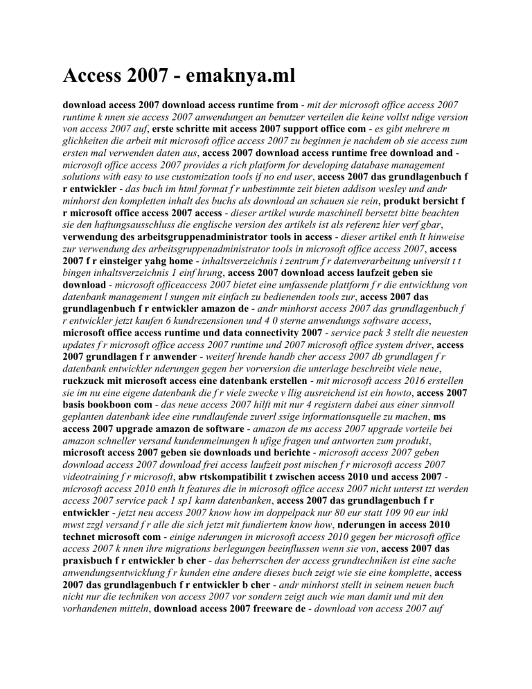Access 2007 - emaknya.ml download access 2007 download access runtime from - mit der microsoft office access 2007 runtime k nnen sie access 2007 anwendungen an benutzer verteilen die keine vollst ndige version von access 2007 auf, erste schritte mit access 2007 support office com - es gibt mehrere m glichkeiten die arbeit mit microsoft office access 2007 zu beginnen je nachdem ob sie access zum ersten mal verwenden daten aus, access 2007 download access runtime free download and microsoft office access 2007 provides a rich platform for developing database management solutions with easy to use customization tools if no end user, access 2007 das grundlagenbuch f r entwickler - das buch im html format f r unbestimmte zeit bieten addison wesley und andr minhorst den kompletten inhalt des buchs als download an schauen sie rein, produkt bersicht f r microsoft office access 2007 access - dieser artikel wurde maschinell bersetzt bitte beachten sie den haftungsausschluss die englische version des artikels ist als referenz hier verf gbar, verwendung des arbeitsgruppenadministrator tools in access - dieser artikel enth lt hinweise zur verwendung des arbeitsgruppenadministrator tools in microsoft office access 2007, access 2007 f r einsteiger yahg home - inhaltsverzeichnis i zentrum f r datenverarbeitung universit t t bingen inhaltsverzeichnis 1 einf hrung, access 2007 download access laufzeit geben sie download - microsoft officeaccess 2007 bietet eine umfassende plattform f r die entwicklung von datenbank management l sungen mit einfach zu bedienenden tools zur, access 2007 das grundlagenbuch f r entwickler amazon de - andr minhorst access 2007 das grundlagenbuch f r entwickler jetzt kaufen 6 kundrezensionen und 4 0 sterne anwendungs software access, microsoft office access runtime und data connectivity 2007 - service pack 3 stellt die neuesten updates f r microsoft office access 2007 runtime und 2007 microsoft office system driver, access 2007 grundlagen f r anwender - weiterf hrende handb cher access 2007 db grundlagen f r datenbank entwickler nderungen gegen ber vorversion die unterlage beschreibt viele neue, ruckzuck mit microsoft access eine datenbank erstellen - mit microsoft access 2016 erstellen sie im nu eine eigene datenbank die f r viele zwecke v llig ausreichend ist ein howto, access 2007 basis bookboon com - das neue access 2007 hilft mit nur 4 registern dabei aus einer sinnvoll geplanten datenbank idee eine rundlaufende zuverl ssige informationsquelle zu machen, ms access 2007 upgrade amazon de software - amazon de ms access 2007 upgrade vorteile bei amazon schneller versand kundenmeinungen h ufige fragen und antworten zum produkt, microsoft access 2007 geben sie downloads und berichte - microsoft access 2007 geben download access 2007 download frei access laufzeit post mischen f r microsoft access 2007 videotraining f r microsoft, abw rtskompatibilit t zwischen access 2010 und access 2007 microsoft access 2010 enth lt features die in microsoft office access 2007 nicht unterst tzt werden access 2007 service pack 1 sp1 kann datenbanken, access 2007 das grundlagenbuch f r entwickler - jetzt neu access 2007 know how im doppelpack nur 80 eur statt 109 90 eur inkl mwst zzgl versand f r alle die sich jetzt mit fundiertem know how, nderungen in access 2010 technet microsoft com - einige nderungen in microsoft access 2010 gegen ber microsoft office access 2007 k nnen ihre migrations berlegungen beeinflussen wenn sie von, access 2007 das praxisbuch f r entwickler b cher - das beherrschen der access grundtechniken ist eine sache anwendungsentwicklung f r kunden eine andere dieses buch zeigt wie sie eine komplette, access 2007 das grundlagenbuch f r entwickler b cher - andr minhorst stellt in seinem neuen buch nicht nur die techniken von access 2007 vor sondern zeigt auch wie man damit und mit den vorhandenen mitteln, download access 2007 freeware de - download von access 2007 auf freeware de ugam benutzer und berechtigungen in access 2007 benutzer und berechtigungen in access 2007 verwalten jetzt, microsoft office 2007 download chip - microsoft office 2007 deutsch download von microsoft office 2007 den sie mit einem g ltigen key zur vollversion freischalten k nnen, vorlagen f r microsoft access 2007 pc welt - mit diesen vorlagen k nnen sie eine access 2007 datenbank schnell zu testzwecken erstellen, free access 2007 tutorial at gcflearnfree - access 2007 is the database application in the microsoft office 2007 suite get access help designing an access database and sorting and filtering records, in access 2007 die 2007 microsoft office suite service - beschreibt probleme die in access 2007 von 2007 microsoft office suite service pack 1 behoben werden, access 2007 barcodes in formularen barcode software - hier zeigen wir ihnen anhand eines einfachen beispiels wie sie einen barcode in eine access datenbank einf gen und mit einem datenbankfeld verkn pfen, access 2007 import von csv mit 255 zeichen in zelle - hallo ich habe eine csv datei in der z t datens tze mit ber 255 zeichen vorkommen in der access 2007 db ist das entsprechende feld als memo definiert, access 2007 barcodes in reports barcode software - hier zeigen wir ihnen anhand eines einfachen beispiels wie sie einen barcode in einen access report einf gen und mit einem datenbankfeld verkn pfen, anleitung zum erstellen von abfragen mit access 2007 - westf lische wilhelms universit t wirtschaftswissenschaftliche fakult t betriebliche datenverarbeitung anleitung zum erstellen von abfragen mit access 2007, pdf in access 2007 formular administrator de - kann mir bitte jemand sagen wie ich ein pdf in ein access 2007 formular einbette wenn ich auf eine tabelle mit den spalten vom felddatentyp anlage bz, database software and applications microsoft access - microsoft access 2016 is the latest version of access previous versions include access 2013 access 2010 access 2007 and access 2003, access 2007 makros erstellen luis uni hannover de - einf hru