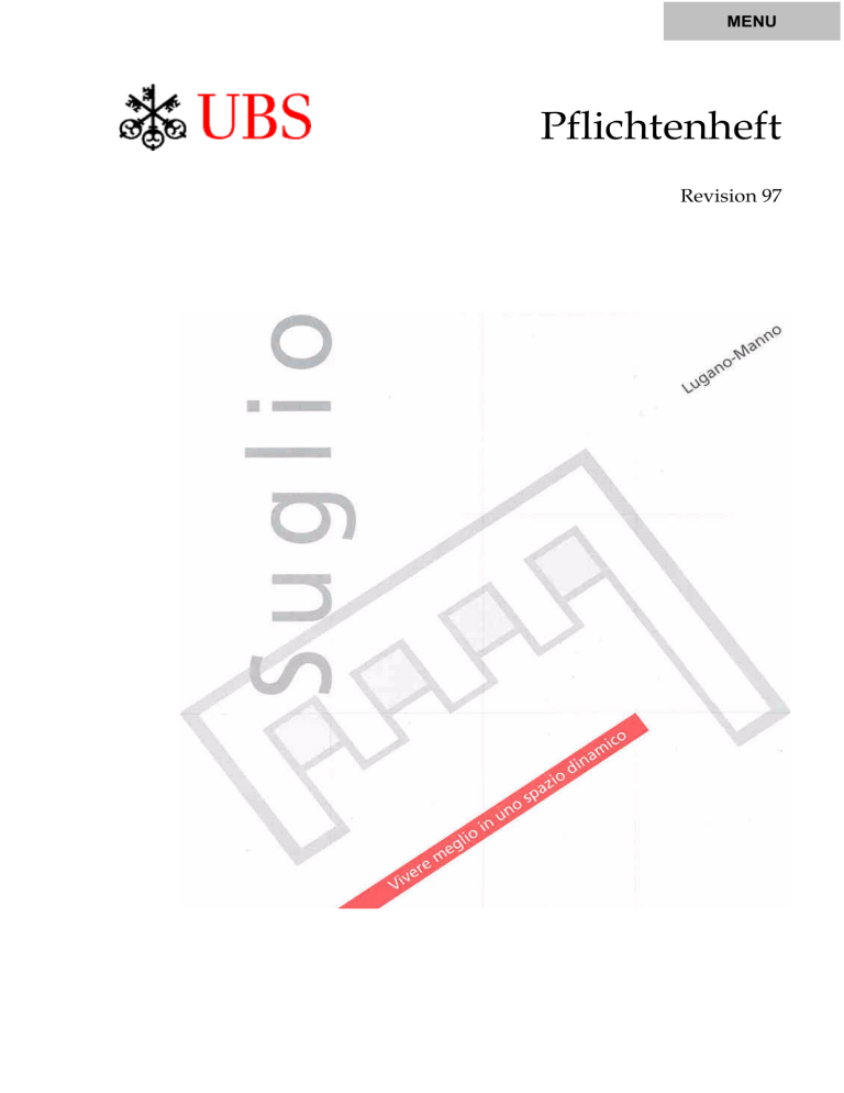 MENU Pflichtenheft Revision 97 Verteiler: 1 1 1 10 1 1 1 1 1 1 1 1 1 1 10 1 1 1 1 1 2 1 1 1 1 1 1 46 Dr. P. Lampert J. Schäublin A. Cantieni M. Bänninger K.H. Becker B. Briotti F. Ochsner M. Pauli W. Spörri V. Bonert F. Müller P. Morandi M. Casellini U. Suckow R. Herrmann J.-M. Chuard Prof. Dr. H.R. Schalcher R. Stulz Dr. D. Aiulfi W. Kläusli S. Menz W. Kreuter G. Kükenbrink S. Rusconi W. Kälin B. Braune Dr. H. Gugerli UBS Zürich UBS Zürich UBS Zürich UBS Zürich UBS Zürich UBS Zürich UBS Zürich UBS Zürich UBS-Zürich UBS Zürich UBS Lugano UBS-Lugano UBS-Lugano UBS Lugano UBS Lugano Enerconom AG pom+ Intep AG Sorane SA Karl Steiner GU AG S/A/R Architekten AG Amstein + Walthert AG SEC Ing. Rusconi Kälin/Neoterma Bauphysiker Intep AG LIEG LIBA LIBA LIGE LIGE LIHA LIHA LIHA EDBE CUPT RELE LOGI DLZ3 LOMS LOLI Hochfeldstrasse 32, PF Technoparkstrasse 1 Lindenstrasse 38/PF Rte. du Châtelard Hagenholzstrasse 60 Hardturmstrasse 175 Leutschenbachstrasse 45 Zürcherstrasse 46 Via Ceresio 15 Hirzengasse 9 Hausacherstrasse 42 Lindenstrasse 38/PF Auszüge mit Hinweise auf die Referenzquelle sind erlaubt. 3000 Bern 9 8005 Zürich 8034 Zürich 1018 Lausanne 8050 Zürich 8021 Zürich 8050 Zürich 8401 Winterthur 6977 Ruvigliana 6430 Schwyz 8122 Binz 8034 Zürich UBS Pflichtenheft für das Pilotprojekt SUGLIO INHALTSVERZEICHNIS Seite I Seite 0 REVISION 97 ................................................................................................................................................................ 1 1 PRÄAMBEL.................................................................................................................................................................. 2 1.1 ENERGIE-MUSTERHAUS DER UBS ................................................................................................................................ 2 1.2 LEITGEDANKEN ZUM PFLICHTENHEFT ........................................................................................................................... 2 1.3 GRUNDSÄTZE FÜR DAS PILOTPROJEKT .......................................................................................................................... 3 2 ABSICHT DER SCHWEIZERISCHEN BANKGESELLSCHAFT......................................................................... 4 2.1 PROJEKTGRUNDLAGEN .................................................................................................................................................. 4 2.2 PRIORITÄTEN DER SCHWEIZERISCHEN BANKGESELLSCHAFT ......................................................................................... 4 2.3 QS-SCHWERPUNKTE UBS............................................................................................................................................. 5 2.4 INBETRIEBNAHME, ABNAHME UND OPTIMIERUNG DES BETRIEBES ............................................................................... 5 3 ALLGEMEIN GÜLTIGE VORGABEN..................................................................................................................... 6 3.1 INTEGRALE PLANUNG ................................................................................................................................................... 6 3.2 VORGABEN DER UBS.................................................................................................................................................... 6 3.3 ENERGIEKONZEPT, MESSKONZEPT, ANLAGENDOKUMENTATION .................................................................................. 6 3.4 KOSTENVORANSCHLAG ................................................................................................................................................. 7 3.5 TERMINPLANUNG .......................................................................................................................................................... 7 3.6 QUALITÄTSSICHERUNG ................................................................................................................................................. 7 3.7 EINBEZUG DES ÖKOLOGIEBEREICHES ............................................................................................................................ 7 3.8 ENERGIE- UND ÖKOBILANZEN....................................................................................................................................... 8 3.9 INBETRIEBNAHME, ABNAHME....................................................................................................................................... 8 3.10 NACHWEIS / OPTIMIERUNG ......................................................................................................................................... 8 3.11 MANNO A + E............................................................................................................................................................. 9 4 PFLICHTENHEFT ARCHITEKTUR...................................................................................................................... 10 4.1 ARCHITEKTUR ............................................................................................................................................................. 10 4.2 VERKEHRSKONZEPT .................................................................................................................................................... 11 4.3 BAUKONSTRUKTION .................................................................................................................................................... 12 4.4 GLAS- UND VERGLASTE BAUTEILE .............................................................................................................................. 13 4.5 BAUPHYSIK ................................................................................................................................................................. 13 5 PFLICHTENHEFT HAUSTECHNIK ........................