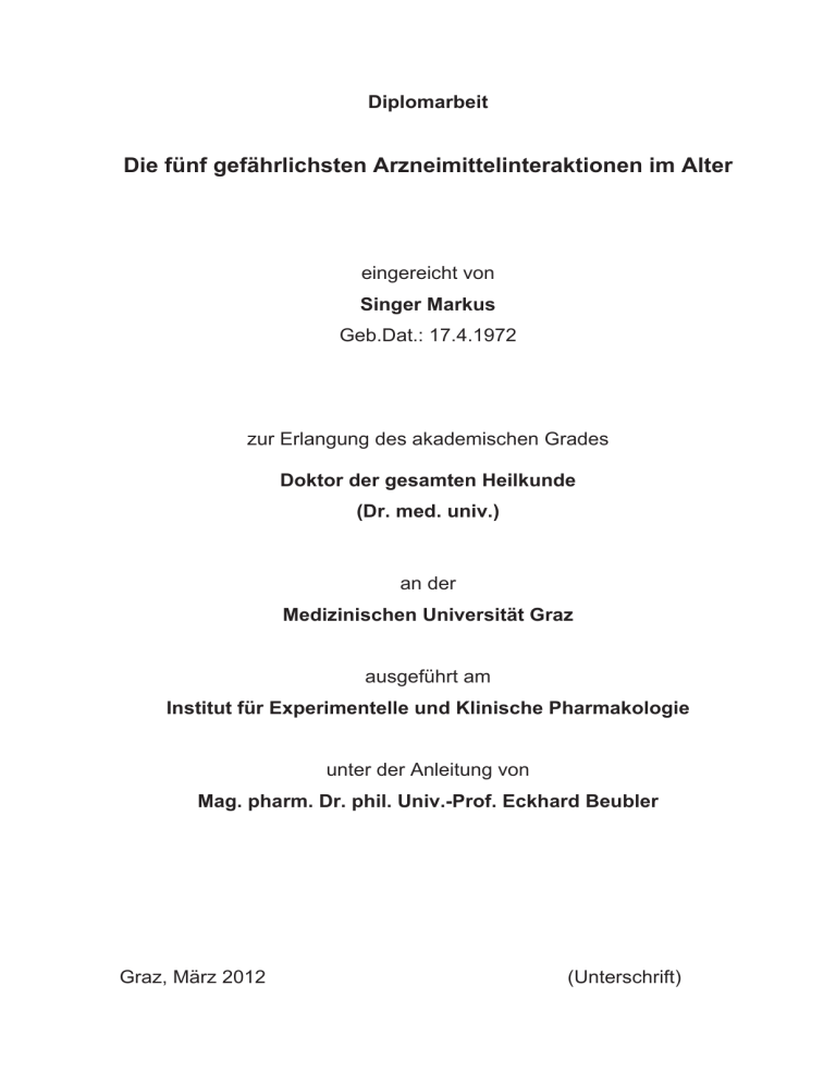 Diplomarbeit Die fünf gefährlichsten Arzneimittelinteraktionen im Alter eingereicht von Singer Markus Geb.Dat.: 17.4.1972 zur Erlangung des akademischen Grades Doktor der gesamten Heilkunde (Dr. med. univ.) an der Medizinischen Universität Graz ausgeführt am Institut für Experimentelle und Klinische Pharmakologie unter der Anleitung von Mag. pharm. Dr. phil. Univ.-Prof. Eckhard Beubler Graz, März 2012 (Unterschrift) Der freie Mensch ist der ohne Zwang wollende. Er glaubt an die Wirklichkeit; das heisst: er glaubt an die reale Verbundenheit der realen Zweiheit Ich und Du. Er glaubt an die Bestimmung und daran, dass sie seiner bedarf: sie gängelt ihn nicht, sie erwartet ihn, er muss auf sie zugehen, und weiss doch nicht, wo sie steht; er muss mit dem ganzen Wesen ausgehen, das weiss er. Es wird nicht so kommen, wie sein Entschluss es meint; aber was kommen will, wird nur kommen, wenn er sich zu dem entschliesst, was er wollen kann. Er muss seinen kleinen Willen, den unfreien, von Dingen und Trieben regierten, seinem grossen opfern, der vom Bestimmtsein weg und auf die Bestimmung zu geht. Da greift er nicht mehr ein, und er lässt doch auch nicht bloss geschehen. Er lauscht dem aus sich Werdenden, dem Weg des Wesens in der Welt; nicht, um von ihm getragen zu werden: um es selber so zu verwirklichen, wie es von ihm, dessen es bedarf, verwirklicht werden will, mit Menschengeist und Menschentat, mit Menschenleben und Menschentod. Er glaubt, sagte ich; damit ist aber gesagt: er begegnet. Martin Buber Eidesstattliche Erklärung Ich erkläre ehrenwörtlich, dass ich die vorliegende Arbeit selbstständig und ohne fremde Hilfe verfasst habe, andere als die angegebenen Quellen nicht verwendet habe und die den benutzten Quellen wörtlich oder inhaltlich entnommenen Stellen als solche kenntlich gemacht habe. Graz, am …… Unterschrift Gleichheitsgrundsatz: Um die Lesbarkeit der vorliegenden Arbeit zu erleichtern, habe ich mich dazu entschlossen, das generische Maskulinum zu verwenden. Jedoch möchte ich ausdrücklich festhalten, dass sowohl männliche als auch weibliche Personen eingeschlossen sind. i Danksagungen Ich danke Herrn Mag. pharm. Dr. phil. Univ.-Prof. Eckhard Beubler, einem Pharmakologen mit Herz, der den leidenden Menschen, dem die Pharmakologie dienlich sein möchte, nie aus den Augen verloren hat und sich darin einen kritischen Blick auf die Ärzteschaft und ihren Umgang mit Arzneimitteln bewahren konnte. Ich danke meiner Familie: Herrn Dir.i.R. Maximilian Blümel Frau Theresia Blümel Herrn Horst Singer Frau Renate Singer So vieles geht auf sie zurück. ii Zusammenfassung Die Polypragmasie, der man im Rahmen der medikamentösen Betreuung des älteren Menschen heute überall begegnet, ist in vielen Fällen kaum vermeidbar, weil die Bedarfsmedikationen für Schmerzen, Depression oder Thrombose aufgrund der häufigeren Erkrankungen im Alter auf ein eingeführtes Therapieschema treffen, mit dem es dann in weiterer Folge zu oft gefährlichen Wechselwirkungen kommt. Die Pharmakokinetik zeigt mit den CYP-Enzymen die wichtigsten Aspekte für Wechselwirkungen: bei gleichzeitiger Kombination eines Wirkstoffes mit anderen Arzneimitteln, aber auch mit Nahrungsmitteln wie z.B. Grapefruitsaft muss an die Möglichkeit der Enzyminduktion oder der Hemmung gedacht werden. NSAR: Ihre vielseitige Einsetzbarkeit als „Schmerzmittel“ macht sie zu einer wichtigen Bedarfsmedikation, auf deren Interaktionsmöglichkeiten geachtet werden muss: es kommt zu vermehrten gastrointestinalen Blutungen, vor allem in Verbindung mit anderen Analgetika und Antidepressiva und die Retention von Natrium und Wasser in der Niere kann eine antihypertensive Therapie erschweren. ASS: Je nach Dosierung zeigt der Wirkstoff eine reine thrombozytenaggregationshemmende Wirkung oder zusätzliche analgetische und antiphlogistische Komponenten. Der antithrombotische Effekt kann durch Wechselwirkungen mit anderen NSAR reduziert oder in Kombination mit Antibiotika auch verstärkt werden. ACE-Hemmer: Im Rahmen einer antihypertensiven Therapie hat neben den Änderungen der Lebensführung, die vom Patienten konsequent verfolgt werden müssen, die Beeinflussung des Renin-Angiotensin-Aldosteronsystems einen hohen Stellenwert. ACE-Hemmer dürfen nicht unkritisch mit Substanzen kombiniert werden, die zu einer Kaliumerhöhung beitragen können. Statine: Dem metabolischen Syndrom kann nur in der Gemeinsamkeit von Änderung der Lebensgewohnheiten und pharmakologischer Therapie begegnet werden, wobei der therapeutischen Beziehung eine wichtige Bedeutung zukommt. iii Die pharmakokinetischen Wechselwirkungen der Statine müssen vor allem in Hinblick auf eine mögliche Rhabdomyolyse beobachtet werden. SSRI: Die medikamentöse Therapie der Depression ist äussert erfolgreich und trägt deutlich zu einem positiven Therapieergebnis bei. SSRI sind die am häufigsten verwendeten Arzneimittel und haben sich bei sorgfältiger Beobachtung eventuell auftretender suizidaler Tendenzen als therapeutisch wertvolle Medikamente erwiesen. Interaktionen betreffen vor allem die Möglichkeit von Blutungen, die durch die Wirkung der SSRI als Thrombozytenaggregationshemmer hervorgerufenen werden, insbesondere bei gleichzeitiger Einnahme mit einem NSAR, aber auch alle serotonergen Wirkstoffe, die in Kombination mit den SSRI ein Serotonin-Syndrom auslösen können. iv Abstract Therpeutic intervention consisting of multiple drugs is very often in itself inevitable, especially in the treatment of the elderly patient, who is in need of long term care and, inbetween, may need extra medication for pain, depression or risk of thrombosis. This situation results in various possibilities for the applied drugs to interact with one another, very often with dangerous results for the patient. Pharmakokinetics constitute the centre of attention in this matter: the CYPenzymes and their influcene on the metabolism via induction or inhibition must be thought of when administering a