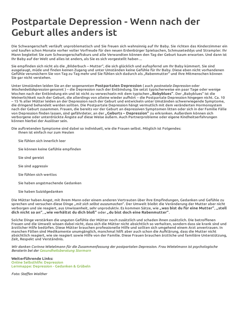 Postpartale Depression - Wenn nach der Geburt alles anders ist Die Schwangerschaft verläuft unproblematisch und Sie freuen sich wahnsinnig auf Ihr Baby. Sie richten das Kinderzimmer ein und kaufen schon Monate vorher voller Vorfreude für den neuen Erdenbürger Spielsachen, Schmuseteddys und Strampler. Ihr Mann begleitet Sie zum Schwangerschaftskurs und alle Verwandten können den Tag der Geburt kaum erwarten. Und dann ist Ihr Baby auf der Welt und alles ist anders, als Sie es sich vorgestellt haben ... Sie empfinden sich nicht als die „Bilderbuch – Mutter“, die sich glücklich und aufopfernd um Ihr Baby kümmert. Sie sind ausgelaugt, müde und finden keinen Zugang und unter Umständen keine Gefühle für Ihr Baby. Diese eben nicht vorhandenen Gefühle verunsichern Sie von Tag zu Tag mehr und Sie fühlen sich dadurch als „Rabenmutter“ und Ihre Mitmenschen können Sie gar nicht verstehen. Unter Umständen leiden Sie an der sogenannten Postpartalen Depression ( auch postnatale Depression oder Wochenbettdepression genannt ) – die Depression nach der Entbindung. Sie setzt typischerweise ein paar Tage oder wenige Wochen nach der Entbindung ein und ist nicht zu verwechseln mit dem typischen „Babyblues“ . Der „Babyblues“ ist die Weinerlichkeit nach der Geburt, die allerdings von alleine wieder aufhört – die Postpartale Depression hingegen nicht. Ca. 10 – 15 % aller Mütter leiden an der Depression nach der Geburt und entwickeln unter Umständen schwerwiegende Symptome, die dringend behandelt werden sollten. Die Postpartale Depression hängt vermutlich mit dem veränderten Hormonsystem nach der Geburt zusammen. Frauen, die bereits vor der Geburt an depressiven Symptomen litten oder sich in der Familie Fälle von Depression finden lassen, sind gefährdeter, an der „Geburts – Depression“ zu erkranken. Außerdem können sich verborgene oder unterdrückte Ängste auf diese Weise äußern. Auch Partnerprobleme oder eigene Kindheitserfahrungen können hierbei der Auslöser sein. Die auftretenden Symptome sind dabei so individuell, wie die Frauen selbst. Möglich ist Folgendes: Ihnen ist einfach nur zum Heulen Sie fühlen sich innerlich leer Sie können keine Gefühle empfinden Sie sind gereizt Sie sind aggressiv Sie fühlen sich wertlos Sie haben angstmachende Gedanken Sie haben Suizidgedanken Die Mütter haben Angst, mit ihrem Mann oder einem anderen Vertrauten über ihre Empfindungen, Gedanken und Gefühle zu sprechen und versuchen diese Dinge „mit sich selbst auszumachen“. Der Umwelt bleibt die Veränderung der Mutter aber nicht verborgen und sie reagiert, aus Unwissenheit, sehr unproduktiv. Es kommen Sätze, wie „was bist du für eine Mutter“ , „stell dich nicht so an“ , „wie verhältst du dich bloß“ oder „du bist doch eine Rabenmutter“ . Solche Dinge verstärken die unguten Gefühle der Mütter noch zusätzlich und schaden ihnen zusätzlich. Die betroffenen Frauen und die Umwelt wissen dabei nicht, dass sich die Mütter nicht absichtlich so verhalten, sondern dass sie krank sind und ärztlicher Hilfe bedürfen. Diese Mütter brauchen professionelle Hilfe und sollten sich umgehend einem Arzt anvertrauen. In manchen Fällen sind Medikamente unumgänglich, manchmal hilft aber auch schon die Aufklärung, dass die Mutter nicht absichtlich reagiert, wie sie reagiert sowie Hilfe von der Familie. Diese Frauen brauchen ärztliche und familiäre Unterstützung, Zeit, Respekt und Verständnis. Wir danken Corinna Wietelmann für die Zusammenfassung der postpartalen Depression. Frau Wietelmann ist psychologische Beraterin bei der Gesundheitsberatung Stormarn Weiterführende Links: Online Selbsthilfe: Depression Lernmappe: Depression - Gedanken & Grübeln Foto: Steffen Walther