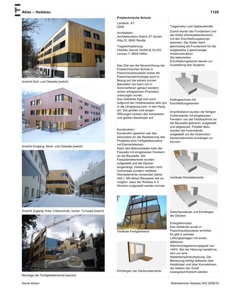 Atlas – Holzbau 1125 Polytechnische Schule Landeck, AT 2008 Architekten: Architekturbüro Walch ZT GmbH Kög 22, 6600 Reutte Tragwerksplanung: Holzbau Saurer GmbH & Co.KG Lechau 7, 6604 Höfen Ansicht Süd- und Ostseite [walch] Ansicht Eingang; Nord- und Ostseite [walch] Das Ziel war die Neuerrichtung der Polytechnischen Schule in Passivhausbauweise wobei die Passivhaustechnologie auch in Bezug auf die extrem kurzen Bauzeiten (es kann nur in Sommerferien gebaut werden) einem erfolgreichen Praxistest unterzogen wurde. Das Gebäude fügt sich auch aufgrund der Holzbauweise sehr gut in die Umgebung bzw. in den Hang ein. Die großen und langen Öffnungen lockern den kompakten und großen Baukörper auf. Konstruktion: Konstruktiv gesehen war das besondere an der Realisierung des Projektes eine Fertigteilbauweise mit Elementdecken. Nach den Betonarbeiten kam die Fassade mit eingebauten Fenstern an die Baustelle. Die Fassadenelemente wurden aufgestellt und die Decken eingehängt. Hierbei wurden nicht horizontale sondern vertikale Wandelemente verwendet (siehe Abb.). Mit dieser Bauweise war es möglich, dass der Rohbau in 5 Wochen aufgestellt werden konnte. Ansicht Zugang; links: Volksschule; rechts: Turnsaal [walch] Tragstruktur und Gebäudehülle: Zuerst wurde das Fundament und der Keller (Werkstättenbereich) mit den Erschließungskernen betoniert. Der Keller dient gleichzeitig als Fundament für die aufgesetzte 3 geschossige Holzkonstruktion. Die betonierten Erschließungskerne dienen zur Aussteifung des Systems. Kellergeschoss mit Erschließungskernen Anschließend wurden die fertigen Außenwände mit eingebauten Fenstern von der Holzbaufirma an die Baustelle gebracht, aufgestellt und abgestützt. Parallel dazu wurden die Innenwände aufgestellt um die Holzmodul Deckenelemente einhängen zu können. Vertikale Wandelemente Zwischenwände und Einhängen der Decken. Vertikale Fertigteilwand Einhängen der Deckenelemente Energiekonzept: Das Gebäude wurde in Passivhausbauweise errichtet. Es gibt 4 zentrale Lüftungsanlagen mit einem effektiven Wärmerückgewinnungsgrad von >84%. Bei der Heizung handelt es sich um eine Niedertemperaturheizung. Die Beheizung erfolgt teilweise über Heizkörper und über Konvektoren, die seitens der Zuluft zwangsdurchströmt werden. Montage der Fertigteilelemente [saurer] David Allram Wahlseminar Holzbau WS 2009/10 Institut für Architekturwissenschaften: Tragwerksplanung und Ingenieurholzbau 1. 1125 ARCHITEKTUR - Randbedingungen - Strategie - Objektbeschreibung 1.1 Randbedingungen conditions Planungskontext Das gesamte Projekt bestand aus der Neuerrichtung der Polytechnischen Schule und des Turnsaales bzw. der Sanierung der bestehenden Volksschule. Dieser Bericht umfasst ausschließlich die Neuerrichtung der Polytechnischen Schule. Die bestehende Polytechnische Schule wurde abgerissen und Ziel war der Neubau der Schule in Passivhausbauweise. Die Energieversorgung wurde auf erneuerbare Energien umgestellt. Der durch die Passivhausbauweise zusätzlich verursachte Stromverbrauch (Klassenzimmerlüftung) wird durch eine Fotovoltaik CO2-neutral abgedeckt. [walch] Städtebauliche Situation Das Areal der Polytechnischen Schule und der Volksschule Landeck liegt im unteren Bereich der Prandtauersiedlung. Erreichbar ist das Grundstück über die Hauptstraße Richtung Stanz und den Leitenweg oder über die Bruggenfeldstraße – Brücke über die Sanna und den Prandtauerweg. (steile, sehr enge Straße). [walch] Abb. 101: Draufsicht Schulen und Umgebung; [google earth 2010] Anforderungen Anforderung bzw. das Ziel war die Neuerrichtung der Polytechnischen Schule in Passivhausbauweise wobei die Passivhaustechnologie auch in Bezug auf die extrem kurzen Bauzeiten (es kann nur in Sommerferien gebaut werden) einem erfolgreichen Praxistest unterzogen wurde. [walch] Ökologische und Innovative Kriterien Die Stadtgemeinde Landeck hat sich entschlossen die Schule nach dem klima:aktiv haus Standard zertifizieren zu lassen. Das bedeutet im Rahmen des Projektes wurde in Zusammenarbeit mit der Programmlinie klima:aktiv die Tauglichkeit des Kriterienkatalogs auf 1 ArchitektuR die Anwendbarkeit auf Schulen getestet. Besonders wichtig waren hier auch die ökologischen Vorgaben zur Vermeidung von Innenraumbelastungen, gerade für Schulen ein sehr wichtiges Thema. [walch] Weiters wurde die Polytechnische Schule von Energie Tirol mit dem EQ – Qualitätssiegel zertifiziert. Abb. 102: Verleihung EQ-Zertifizierung; [walch] Abb. 103: Verleihung klima:aktiv Zertifizierung; [walch] Durch die Neuerrichtung der Polytechnischen Schule inklusive externem Turnsaal in Passivhausbauweise und Sanierung der Volksschule auf sehr gutes Niedrigenergiehausniveau konnte der Energieverbrauch auf geplante 11300 Liter Heizöl abgesenkt werden und das bei einer flächenmäßigen Erweiterung um ca. 1200m². Da der gesamte Schulkomplex auch auf erneuerbare Energie in Form einer modernen Pelletsheizanlage umgestellt wurde ist die neue Energieversorgung aller drei Gebäude völlig CO2-neutral. [walch] 1.2 Strategie strategy Gestaltungsintention Das Gebäude fügt sich auch aufgrund der Holzbauweise sehr gut in die Umgebung bzw. in den Hang ein. Die großen und langen Öffnungen lockern den kompakten und großen Baukörper auf. Abb. 104: Ansicht Süd [walch] Entwurf Dadurch, dass an diesem Standort schon zuvor eine Schule war, wurde die Kubatur des Neubaus in gewisser Weise vorgegeben. 2 ArchitektuR Jedoch wurde der Baukörper nach Westen und Norden vergrößert, weil genug Platz vorhanden war. Im Norden und Süden befinden sich die Klassen, welche durch einen Mittelgang erschlossen sind. Der Mittelgang wird durch zwei Öffnungen von oben bis unten unterbrochen und belichtet. Das Gebäude ist im Norden eingegraben, dass bedeutet, dass man vom Norden ins Erdgeschoss und vom Süden ins Kellergeschoss gelangt. Realisierungsprozess Das besondere an der Realisierung des Projektes war eine Fertigteilbauweise mit Elementdecken