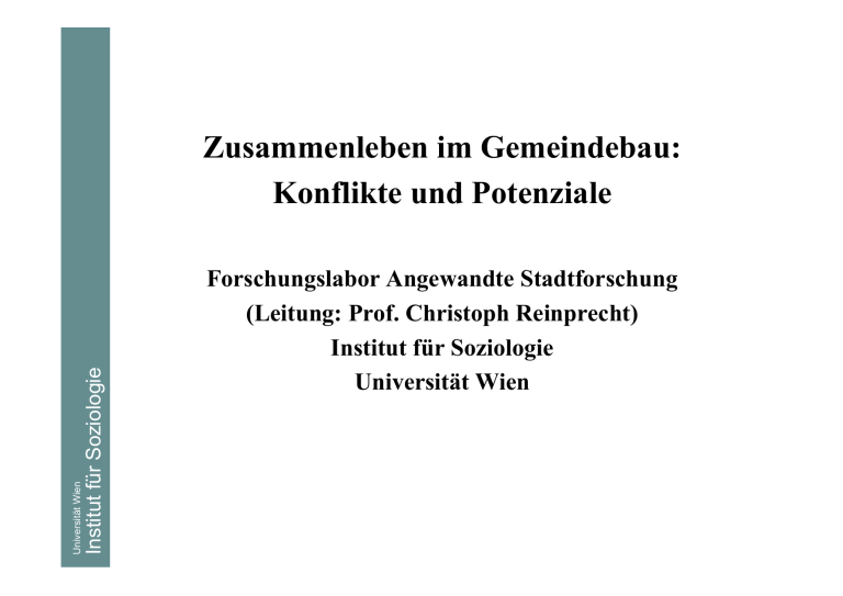 Institut für Soziologie Universität Wien Zusammenleben im Gemeindebau: Konflikte und Potenziale Forschungslabor Angewandte Stadtforschung (Leitung: Prof. Christoph Reinprecht) Institut für Soziologie Universität Wien Institut für Soziologie Universität Wien Inhalt 1. 2. 3. 4. 5. 6. Untersuchungsdesign und Fragestellungen Zusammenleben und Konflikte Konfliktverhalten Potenziale Ansatzpunkte Resümee 1. Untersuchungsdesign • BewohnerInnenbefragung April und Mai 2006 • N= 216; 28% der Befragten haben einen Migrationshintergrund • Standardisierter Fragebogen, persönliche Interviews Institut für Soziologie Universität Wien • Drei ausgewählte Gemeindebauten: Karl-Seitz-Hof Siemensstraße Mitterhofergasse Forschungsleitende Fragestellungen • Welche Konflikte werden im Zusammenleben wahrgenommen? Institut für Soziologie Universität Wien • Welche Themen sind konfliktreich? Für welche Gruppen? • Welche Potenziale bietet das Zusammenleben? Institut für Soziologie Universität Wien 2. Zusammenleben und Konflikte Ambivalente Bindungen Wie sehr stimmen Sie folgenden Aussagen zu? Institut für Soziologie Universität Wien stimme zu fühle mich wohl hier 55 bin zufrieden mit Wohnung 72 bin gerne hier 62 fühle mich verbunden mit Gegend 59 BewohnerInnen halten zusammen 19 Angaben in Prozent Wie bewerten Sie das Zusammenleben folgender Gruppe? Negative Bewertung Institut für Soziologie Universität Wien Gesamt Österreich Migrations hintergrund Erwerbstätige/ Pensionisten 6 6 7 Jugendliche/ Erwachsene 21 22 17 BewohnerInnen mit Kindern/ BewohnerInnen ohne Kinder 30 26 39 Alteingesessene/ Neue 34 34 34 Einheimische/ Leute ausländischer Herkunft 57 64 39 Angaben in Prozent Wie stark fühlen Sie sich gestört durch...? 5,00 4,00 3,00 Institut für Soziologie Universität Wien 2,00 1,00 spielende Kinder 1= gar nicht gestört 5= stark gestört Gruppen von Jugendlichen Heimwerken/ Waschmaschine d. Nachbarn laute Musik S treit bei den Nachbarn Betrunkene im Hof Mittelwerte Unter 20 Jahre 21-55 Jahre 56 Jahre und älter Institut für Soziologie Universität Wien Nachbarschaftskontakte: Positive und negative Aspekte im letzten Jahr oft vorgekommen Verschmutzung/ Zerstörung v. Gemeinschaftseinrichtungen 52 Klatsch u. Gerüchte 44 Rücksichtslosigkeit von Kindern/ Jugendlichen 38 Nichteinhalten von Mittags- und Ruhezeiten 36 Post/ Blumen gießen 24 Einladungen zum Kaffee 23 mit Lebensmitteln ausgeholfen 21 Hilfe bei Einkäufen u. Reparaturen 20 Streit unter NachbarnInnen 19 Aufsicht von Kindern 15 Hilfe bei Krankheitsfall 13 Waschküche Termine tauschen 13 Hilfsbereitschaft von Kindern/ Jugendlichen 9 Angaben in Prozent Institut für Soziologie Universität Wien 3. Konfliktverhalten Institut für Soziologie Universität Wien Wie verhalten Sie sich bei Konflikten? Was trifft zu? bespreche alles in Ruhe versuche durch Argumente überzeugen versuche Kompromiss einzugehen ziehe mich zurück und mache nichts beschwere mich sofort bei zuständiger Stelle reagiere genauso wie mein gegenüber hole Verstärkung werde handgreiflich, wenn es sein muss wische NachbarInnen eins aus trifft zu 72 62 61 23 14 12 10 9 3 Angaben in Prozent Passives Verhalten Institut für Soziologie Universität Wien Ich ziehe mich zurück und mache gar nichts. Österreich Migrationshintergrund trifft zu 20 32 teils teils 16 23 trifft nicht zu 64 45 Angaben in Prozent Institut für Soziologie Universität Wien 4. Potenziale Wenn Bewohner ausländischer Herkunft einziehen, was kann sich hier verändern? Institut für Soziologie Universität Wien Österreich Migrationshintergrund Möglichkeit neuer Bekanntschaften Verständigungsschwierigkeiten 92 Ablehnung und fehlenden Respekt 86 Anpassungschwierigkeiten durch andere Mentalitäten 85 Konflikte durch unterschiedl. Lebensgewohnheiten 82 andere Kulturen kennenlernen 64 Menschen fühlen sich verunsichert 65 Ablehnung und fehlenden Respekt 63 andere Kulturen kennenlernen 49 Konflikte durch unterschiedl. Lebensgewohnheiten 59 Möglichkeit neuer Bekanntschaften 44 Menschen fühlen sich verunsichert 54 Mehrfachantworten 75 Verständigungsschwierigkeiten Anpassungschwierigkeiten durch andere Mentalitäten 73 68 Angaben in Prozent Wenn Bewohner ausländischer Herkunft einziehen, was kann man tun, um das Zusammenleben zu verbessern? Migrationshintergrund Institut für Soziologie Universität Wien Österreich Ansprechperson f. neue BewohnerInnen 70 im Stiegenhaus ansprechen 73 mehrsprachige Hausordnung 60 mehrsprachige Hausordnung 70 Hoffeste/ Veranstaltungen zum Kennenlernen 53 Ansprechperson f. neue BewohnerInnen 68 51 Hoffeste/ Veranstaltungen zum Kennenlernen 68 49 Veranstaltungen um Bräuche/ Gewohnheiten kennenzulernen 66 Veranstaltungen um Bräuche/ Gewohnheiten kennenzulernen im Stiegenhaus ansprechen Mehrfachantworten Angaben in Prozent Beteiligung an Veränderungen im Wohngebiet 7 26 18 Einsetzen und Mitmachen gut, wenn sich jemand einsetzt Institut für Soziologie Universität Wien nichts dagegen, aber kein Interesse 49 unnötig, habe kein Einfluss Angaben in Prozent Institut für Soziologie Universität Wien 5. Ansatzpunkte Institut für Soziologie Universität Wien Positiv und negativ besetzte Orte Beispiel Mitterhofergasse positiv besetzte Orte negativ besetzte Orte 6. Resümee • Bedenken bezüglich Veränderungen im Wohngebiet • Befragte mit österr. Hintergrund beurteilen das Zusammenleben von Einheimischen und Leuten ausländischer Herkunft negativer Institut für Soziologie Universität Wien • Aber: auch gemeinsame Problemwahrnehmungen Sprachprobleme u. Verständigungsschwierigkeiten, Regeln d. Zusammenlebens • Problemlösungen: Befragte mit österr. Hintergrund: institutionelle Lösungen Befragte mit Migrationshintergrund: persönlicher Kontakt • Potenziale: starke Bindung an das Wohngebiet hohe Bereitschaft und Toleranz für Beteiligungsprozesse