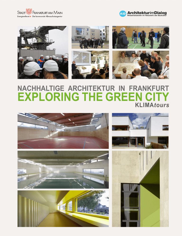 NACHHALTIGE ARCHITEKTUR IN FRANKFURT EXPLORING THE GREEN CITY KLIMAtours Seite 1/43 KLIMAtours Frankfurt am Main Kommen Sie mit! "Ich lade Sie herzlich zu unseren KLIMAtours ein. Kommen Sie mit und überzeugen Sie sich, wie schön nachhaltiges Bauen sein kann." Rosemarie Heilig (Dezernentin für Umwelt und Gesundheit) Frankfurt ist die Stadt der Energieeffizienz, denn hier gibt es die meisten Passivhaus-Wohnungen und die energieeffizientesten Bürogebäude Deutschlands. Mit unseren KLIMAtours haben Fachleute die Möglichkeit einen Blick „hinter die Kulissen“ der Frankfurter Klimaschützer zu werfen. Wir öffnen Ihnen Türen, Keller und Dächer und zeigen, wie ein Blockheizkraftwerk arbeitet, wie die Lüftung im Passivhaus funktioniert oder wie Büroräume energiesparend gekühlt werden. Sie haben Interesse an einem speziellen Thema? Gerne stellen wir eine KLIMAtour nach Ihren Wünschen zusammen. Nehmen Sie Kontakt mit uns auf. Auf den folgenden Seiten zeigen wir Ihnen eine Auswahl an energieeffizienten Wohnhäusern, Schulen und Bürogebäuden sowie neu geplanten Stadtteilen und umweltfreundlichen Kraftwerken. Weitere Projekte, die Sie besichtigen können, finden Sie unter www.klimaschutzstadtplan-frankfurt.de. KLIMAtours ist ein Projekt des Energiereferats der Stadt Frankfurt gemeinsam mit der Architekturplattform AiD. www.klimatours-frankfurt.de www.architekturimdialog.de www.frankfurt-greencity.de Seite 2/43 Inhalt Über KLIMAtours Seite 4 Beispiel einer KLIMAtour Seite 5 Nachhaltige Gebäude Frankfurt Rhein-Main: 1 Wohnen Wohngebäude Seite 7 2 Arbeiten Büro- und Verwaltungsbauten Seite 13 3 4 Bewahren und erneuern Bauen im Bestand, energetische Sanierung, Denkmalschutz Lernen und verwalten Einrichtungen für Bildung, Wissenschaft, Kultur und Soziales Seite 17 5 Erleben und informieren Seite 26 Bauten für Freizeit, Sport und Konsum, Veranstaltungsimmobilien, Messe 6 Gesund werden / gesund bleiben Krankenhäuser, Gesundheits-, Pflege- und Seniorenimmobilien Seite 27 7 Hoch hinaus Hochhäuser Seite 28 8 Im Viertel leben Stadtquartiere und Stadträume Seite 30 9 Ver- und entsorgen Bauten der Technik und der Energie Seite 32 10 Erholen Grünflächen, Plätze, Freiraumgestaltung und städt. Wohnräume Seite 37 11 Aus der Region Darmstadt, Offenbach etc. Seite 37 Geführte Stadtrundgänge, Tour 1 und Tour 2 Seite 38 Green Building Preis FrankfurtRheinMain / Masterplan 100% Seite 40 Impressum Seite 41 Anmeldeformular Seite 42 Seite 23 Seite 3/43 Über KLIMAtours Frankfurt am Main Das Energiereferat der Stadt Frankfurt und Architektur im Dialog (AiD) organisieren Fachführungen zu nachhaltigen Projekten der Stadt. Das innovative Planen und Bauen stellt gerade vor dem Hintergrund des Klimawandels und gesellschaftlicher Veränderungen eine besondere Herausforderung dar. Die Gebäude und Städte der Zukunft müssen nicht nur ökonomischen, sondern in zunehmendem Maße auch sozialen und ökologischen Anforderungen genügen. Frankfurt setzt hier als „Passivhaushauptstadt“ und mit dem Architekturpreis „Green Building“ für innovative Projekte entscheidende Akzente. Das übergreifende Ziel ist es eine vorbildliche „Green City“ zu werden. Dieses Engagement weckt Interesse bei Fachleuten aus aller Welt. Für sie organisieren wir die „KLIMAtours“: als Impulsgeber und im Sinne eines Know-how-Transfers. Die KLIMAtours wurden vom Energiereferat gemeinsam mit der Architektur- und Kommunikationsplattform Architektur im Dialog entwickelt. Um die Frankfurter Erfahrungen an ein Fachpublikum weiterzugeben, öffnen wir die Türen zu Wohnungen, Schulen, Bürogebäuden und Kraftwerken, einige davon noch im Bau. Der KLIMAtours-Katalog zeigt zukunftsweisende Projekte im Rhein-Main-Gebiet. Die meisten Gebäude werden in Führungen detailliert vorgestellt. Für die Organisation der Touren arbeiten wir neben den Architekten mit Gebäudeeigentümern, städtischen Einrichtungen, Betreibern von Gebäuden, Zulieferern der Veranstaltungsbranche, Referenten, Dolmetschern und einigen Medien zusammen. Stellen Sie sich Ihre eigene KLIMAtour zusammen. Gerne passen wir ihre Tour Ihren individuellen Themenwünschen an. Bitte denken Sie an die Umwelt bevor Sie das PDF ausdrucken! Seite 4/43 Beispiel einer KLIMAtour: Gruppe aus Barcelona 1,5-Tage-Programm für spanische Architekten Am Vormittag 09:00 Uhr: Passivhaus Scheffelhof mit Stefanie und Hans-Dieter Rook, Rook Architekten 10:30 Uhr: Baustelle Diakonissenareal mit Thomas Haimann, B&V Braun Volleth Architekten 12:00 Uhr: Baustelle Ziehenschule mit Harald Heußer, Hochbauamt und Marcus Schmitt, Architekt Seite 5/43 Am Nachmittag 15:00 Uhr: Verwaltungsgebäude Unfallkasse Hessen Manfred Theil, Gaspar-Theil-Ingenieure GmbH 16:15 Uhr: Sanierung Tevesstraße 36-54 Dr. Werner Neumann, Energiereferat Stadt Frankfurt am Main 17:15 Uhr: Sport- und Funktionsgebäude am Rebstock Harald Heußer, Hochbauamt und Architekt Rochus Gabriel 2.Tag, weitere Referenten: Baufrösche, AS&P GmbH, bb22 Architekten, Klaus Leber Architekten, GHP Architekten Seite 6/43 1Wohnen Foto: Stefan Heßling Scheffelhof Mit zehn Stadthäusern auf einem äußerst beengten Grundstück entstand eine gemeinschaftsorientierte Wohnhausgruppe mit hoher gestalterischer und funktionaler Qualität. Sie beweist das Potential von Nachverdichtungen in dicht bebauten urbanen Räumen. Das Objekt zeigt besonders deutlich, dass die konsequente Umsetzung der Passivhausanforderungen nicht zu minderwertiger Architektur führen muss. Architekt: Rook Architekten, Frankfurt Bauherr: private Bauherrengemeinschaft Auszeichnung: Green Building Frankfurt 2009 Foto: Stefan Heßling Minimum Impact House Das Projekt schafft aus einem innerstädtischen Fragment mit 29 m² Grundfläche einen fünffach größeren Nutzbereich. Bemerkenswert ist die hohe architektonische Qualität in Verbindung mit hoher Nutzungsflexibilität. Nachwachsende Rohstoffe, Solarthermie und Regenwassernutzung machen den Holzbau mit begrünter Dachter