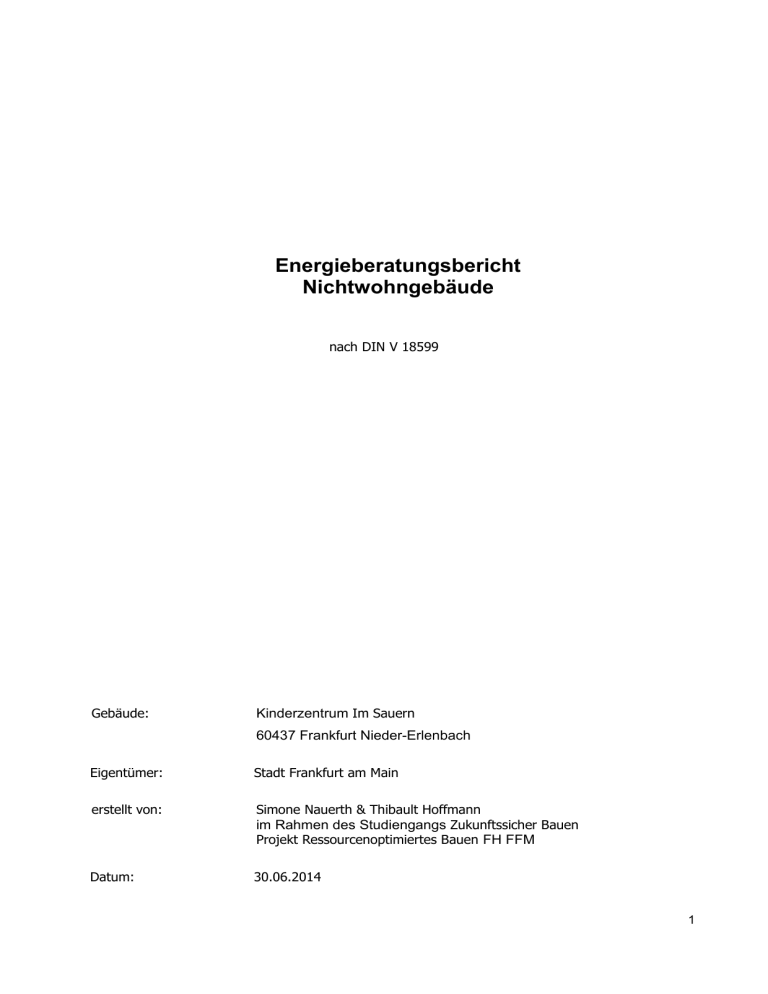 Energieberatungsbericht Nichtwohngebäude nach DIN V 18599 Gebäude: Kinderzentrum Im Sauern 60437 Frankfurt Nieder-Erlenbach Eigentümer: Stadt Frankfurt am Main erstellt von: Simone Nauerth & Thibault Hoffmann im Rahmen des Studiengangs Zukunftssicher Bauen Projekt Ressourcenoptimiertes Bauen FH FFM Datum: 30.06.2014 1 Hinweise Dieser Beratungsbericht wurde nach bestem Wissen auf Grundlage der verfügbaren Daten erstellt. Irrtümer sind vorbehalten. Die Durchführung und der Erfolg einzelner Maßnahmen bleiben in der Verantwortung des Gebäudeeigentümers. Um den Erfolg zu sichern und Bauschäden aufgrund der bauphysikalischen Problematik im Altbau zu vermeiden, sollten eine sorgfältige fachliche Planung vor Durchführung sowie Überwachung während der Durchführung von Sanierungsmaßnahmen erfolgen. Dieser Beratungsbericht beinhaltet keinerlei Planungsleistungen insbesondere im Bereich von energetischen Nachweisen oder Fördergeldanträgen, Kostenermittlung, Ausführungsplanung oder Bauphysik. Die Berechnungen des vorliegenden Berichts basieren auf den Geometriedaten des unsanierten Gebäudes. Für sämtliche energetischen Nachweise sind grundsätzlich die Geometriedaten der Sanierungsplanung zugrunde zu legen. Die angegebenen Investitionskosten sind grobe Schätzungen. Die genauen Baukosten sollten durch Vergleichsangebote ermittelt werden. Die Annahmen zu Baukonstruktion und Anlagentechnik sind bei Durchführung der Maßnahmen vor Ort zu prüfen. 2 Inhaltsverzeichnis Energieberatungsbericht Nichtwohngebäude........................................................................1 1 1 Zusammenfassung......................................................................................................4 1.1 Empfehlung zur Gesamtsanierung in einem Zug ..................................................................4 1.2 Übersicht aller Maßnahmen ..................................................................................................5 1.3 Berechnungsgrundlagen und Verbrauchsabgleich.................................................................5 1.4 Vorteile der energetischen Sanierung ...................................................................................6 1.5 Wirtschaftlichkeitsbetrachtung...............................................................................................6 1.5.1 Kosten/Nutzen-Verhältnis der Maßnahmen....................................................................6 1.5.2 Vergleich der jährlichen energetisch bedingten Gesamtkosten......................................7 1.6 Energie- und Schadstoffeinsparungen...................................................................................7 1.6.1 Reduktion der Transmissionswärmeverluste in kWh/a...................................................7 1.6.2 Reduktion des Endenergiebedarfs (Brennstoffbedarf) in kWh/a.....................................7 1.6.3 Reduktion des Primärenergiebedarfs (ökologische Bewertung) in kWh/a......................8 1.6.4 Reduktion der Schadstoffemissionen.............................................................................8 1.7 Gesetze und Normen.............................................................................................................8 1.7.1 Nachrüstverpflichtungen nach EnEV..............................................................................8 1.7.2 Energieausweise............................................................................................................ 8 2 2 Bestandsaufnahme......................................................................................................9 2.1 Gebäudedaten....................................................................................................................... 9 2.2 Ansichten............................................................................................................................... 9 2.3 Baulicher Zustand und Wärmedämmung der Gebäudehülle................................................10 2.4 Wärmetechnische Einstufung der Gebäudehülle ................................................................10 2.5 Heizungsanlage ..................................................................................................................11 2.6 Trinkwarmwasseranlage......................................................................................................12 2.7 Beleuchtung......................................................................................................................... 12 3 3 Gebäudeanalyse........................................................................................................12 3.1 Zonierung ............................................................................................................................ 12 3.2 Energiebilanz des Gebäudes...............................................................................................13 3.3 Gemessener Energieverbrauch...........................................................................................14 3.4 Energetische Einstufung des Gebäudes..............................................................................15 4 4 Energetisches Sanierungskonzept............................................................................16 4.1 Gesamtsanierung in einem Zug...........................................................................................16 4.1.1 Wärmedämmung der Außenwände und Dächer...........................................................17 4.1.2 Austausch der Fenster und Eingangstüren...................................................................18 4.1.3 Zentrale Lüftungsanlage..............................................................................................19 4.1.4 Austausch der Oberlichter...........................................................................................19 4.1.5 Entfernen des Kellers aus dem beheizten Volumen.........................