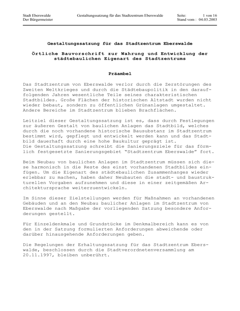 Stadt Eberswalde Der Bürgermeister Gestaltungssatzung für das Stadtzentrum Eberswalde Seite: 1 von 16 Stand vom : 04.03.2003 Gestaltungssatzung für das Stadtzentrum Eberswalde Örtliche Bauvorschrift zur Wahrung und Entwicklung der städtebaulichen Eigenart des Stadtzentrums Präambel Das Stadtzentrum von Eberswalde verlor durch die Zerstörungen des Zweiten Weltkrieges und durch die Städtebaupolitik in den darauffolgenden Jahren wesentliche Teile seines charakteristischen Stadtbildes. Große Flächen der historischen Altstadt wurden nicht wieder bebaut, sondern zu öffentlichen Grünanlagen umgestaltet. Andere Bereiche im Stadtzentrum blieben Brachflächen. Leitziel dieser Gestaltungssatzung ist es, dass durch Festlegungen zur äußeren Gestalt von baulichen Anlagen das Stadtbild, welches durch die noch vorhandene historische Bausubstanz im Stadtzentrum bestimmt wird, gepflegt und entwickelt werden kann und das Stadtbild dauerhaft durch eine hohe Baukultur geprägt ist. Die Gestaltungssatzung schreibt die Sanierungsziele für das förmlich festgesetzte Sanierungsgebiet “Stadtzentrum Eberswalde” fort. Beim Neubau von baulichen Anlagen im Stadtzentrum müssen sich diese harmonisch in die Reste des einst vorhandenen Stadtbildes einfügen. Um die Eigenart des städtebaulichen Zusammenhanges wieder erlebbar zu machen, haben daher Neubauten die stadt- und baustrukturellen Vorgaben aufzunehmen und diese in einer zeitgemäßen Architektursprache weiterzuentwickeln. Im Sinne dieser Zielstellungen werden für Maßnahmen an vorhandenen Gebäuden und an den Neubau baulicher Anlagen im Stadtzentrum von Eberswalde nach Maßgabe der vorliegenden Satzung besondere Anforderungen gestellt. Für Einzeldenkmale und Grundstücke im Denkmalbereich kann es von den in der Satzung formulierten Anforderungen abweichende oder darüber hinausgehende Anforderungen geben. Die Regelungen der Erhaltungssatzung für das Stadtzentrum Eberswalde, beschlossen durch die Stadtverordnetenversammlung am 20.11.1997, bleiben unberührt. Stadt Eberswalde Der Bürgermeister Gestaltungssatzung für das Stadtzentrum Eberswalde Seite: 2 von 16 Stand vom : 04.03.2003 Rechtsgrundlagen Rechtsgrundlagen dieser Satzung sind • die Gemeindeordnung für das Land Brandenburg (GO) in der derzeit gültigen Fassung, § 5 Abs. 1 • die Brandenburgische Bauordnung (BbgBO) in der derzeit gültigen Fassung, § 89 Abs. 1 und 2 Gestaltungssatzung für das Stadtzentrum Eberswalde Die Stadtverordnetenversammlung der Stadt Eberswalde hat auf ihrer Sitzung am 21.11.2002 mit Beschluss-Nr. 42-707/02 nachfolgende Gestaltungssatzung für das Stadtzentrum von Eberswalde (örtliche Bauvorschrift zur Wahrung und Entwicklung der städtebaulichen Eigenart des Stadtzentrums) beschlossen. Die Anlagen 1 und 2 sind Bestandteil der Gestaltungssatzung. INHALT § § § § § § § § § § § § § § 1 2 3 4 5 6 7 8 9 10 11 12 13 14 Räumlicher und sachlicher Geltungsbereich Städtebaulich-räumliche Gestaltung Gestaltung der Dächer Gestaltung der Dachaufbauten Gestaltung der Fassaden Fassadenmaterialien Sonnen- und Wetterschutzvorrichtungen Werbeanlagen und Warenautomaten Außenanlagen und Einfriedungen Abweichungen Zuständigkeit Ordnungswidrigkeiten Übergangsvorschriften Inkrafttreten Anlagen Karte des räumlichen Geltungsbereiches der Satzung Bereiche mit geringeren Tiefen der Abstandsflächen Seite 3 4 4 5 7 10 11 12 14 14 15 15 16 16 (Anlage 1) (Anlage 2) Stadt Eberswalde Der Bürgermeister Gestaltungssatzung für das Stadtzentrum Eberswalde Seite: 3 von 16 Stand vom : 04.03.2003 § 1 Räumlicher und sachlicher Geltungsbereich (!) Der Geltungsbereich der Satzung, der aufgrund differenzierter Gestaltungsabsichten in zwei Teilbereiche untergliedert ist, umfasst das Eberswalder Stadtzentrum. Der Geltungsbereich ist auf dem Übersichtsplan in der Anlage 1 dargestellt. Teilbereich Altstadt: Er umfasst den mittelalterlichen Kern einschließlich der ersten Stadterweiterung (Schicklervorstadt) und wird begrenzt von Schicklerstraße (beidseitig zwischen Weinberg- und Puschkinstraße), Goethestraße, Bollwerkstraße, Mauerstraße, Eichwerderstraße, Erich-Mühsam-Straße, Goethestraße, Pfeilstraße und Weinbergstraße. Teilbereich Bahnhofsvorstadt: Er umfasst das Stadterweiterungsgebiet des 19. Jahrhunderts entlang der Eisenbahnstraße und wird begrenzt von Weinbergstraße, Rudolf-BreitscheidStraße, Friedrich-Engels-Straße, Grabowstraße beidseitig, Bahnhofsvorstadt, Kantstraße, Wilhelmstraße, Bergerstraße, Finow-Kanalufer zwischen Bahnhofsvorstadt und Mauerstraße, Bollwerkstraße, Goethestraße, Schicklerstraße (ausgenommen zwischen Puschkin- und Weinbergstraße). Die Satzung gilt für beide Teilbereiche, soweit ein einzelner Teilbereich nicht benannt ist. (2) Diese örtliche Bauvorschrift über die äußere Gestaltung baulicher Anlagen sowie Werbeanlagen und Warenautomaten zur Verwirklichung baugestalterischer und städtebaulicher Absichten hinsichtlich der Gestaltung des Straßen- und Ortsbildes des Eberswalder Stadtzentrums gilt für die Änderung (Maßnahmen, die über eine übliche Instandhaltung hinausgehen) und die Errichtung baulicher Anlagen oder Teilen davon sowie von Werbeanlagen und Warenautomaten im Sinne der Brandenburgischen Bauordnung. Dabei kommt es auf eine bauordnungsrechtliche Genehmigungspflicht nicht an. (3) Diese örtliche Bauvorschrift gilt bei Gebäuden nur für die Vorderfassade (bei Eckgebäuden für beide Vorderfassaden), für die Giebel bzw. deren die benachbarte Bebauung überragenden Teile (mit allen am Giebel sichtbaren Bauteilen) und für die vordere Dachfläche mit Dachaufbauten (bei Eckgebäuden für beide vorderen Dachhälften) soweit diese Teile von Gebäuden von öffentlichen Verkehrsflächen sichtbar sind. Abweichend von der allgemeinen Regelung wird festgelegt, dass die Vorschrift generell für die den First überragenden Teile von Schornsteinen gilt. Für andere bauliche Anlagen, Werbeanlagen und Warenautomaten