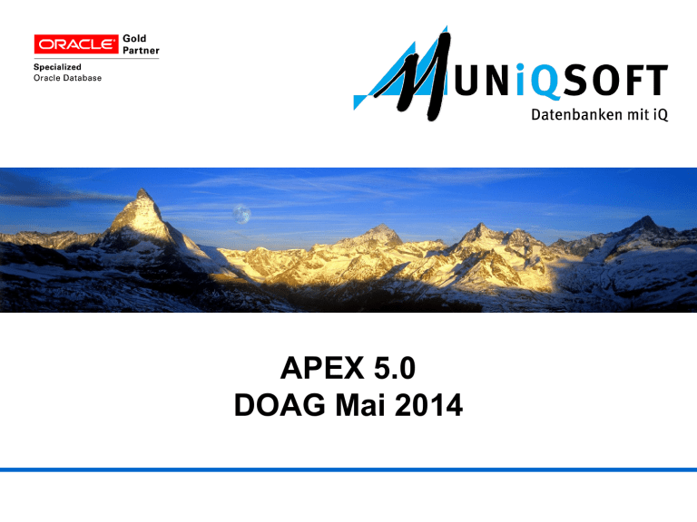 APEX 5.0 DOAG Mai 2014 APEX 5.0 16 Jahre MuniQSoft GmbH Tätigkeitsbereiche: Oracle Support Hotline: Mo-Fr 8.00 – 18.00 Uhr Erweiterung um Rufbereitschaft auch am Wochenende möglich Oracle IT-Consulting & Services, Schwerpunkt auch RAC Oracle Schulungen (SQL, PL/SQL, DBA, APEX, B&R, DB Tuning , DB Monitoring, Oracle XML, SQL Tuning, Oracle unter Linux… 51 verschiedene Schulungen, gerne auch Inhouse ) Software-Lösungen Oracle Lizenzen MuniQSoft GmbH Schulungszentrum Grünwalder Weg 13a 82008 Unterhaching Tel.: 089 / 679090 40 MuniQSoft GmbH MuniQSoft GmbH IT-Consulting, Support, & Software-Lösungen Witneystr. 1 82008 Unterhaching Tel.: 089 / 6228 6789 0 APEX 5.0 EA1 APEX 11-3 Hinweise Der Vortrag behandelt neue Funktionen der APEX Beta Version 5.0 EA1 vom 13.5.2014 Es besteht keine Garantie, dass diese Funktionen in der Produktionsversion verfügbar sein werden Das APEX Team wird zusätzlich eine zweite Beta Version herausbringen, die jedoch zum Zeitpunkt des Vortrags noch nicht verfügbar war MuniQSoft GmbH APEX 5.0 EA1 APEX 11-4 Anmeldung am Workspace Anforderung eines Workspaces wie in vorherigen Versionen Anmeldung am System mit dem (evtl. bereits vorhandenen) Oracle Account Es werden die Workspaces angezeigt, die dem Account zugeordnet sind Single Sing On (SSO) in den Applikationen funktioniert (noch) nicht. Das Passwort muss zurückgesetzt werden MuniQSoft GmbH APEX 5.0 EA1 APEX 11-5 Page Designer MuniQSoft GmbH APEX 5.0 EA1 APEX 11-6 Page Designer Ein Klick auf ein Element im mittleren Fenster, bietet die Möglichkeit, die Eigenschaften dieses Objekts im rechten Fenster zu editieren MuniQSoft GmbH APEX 5.0 EA1 APEX 11-7 Page Designer Duplizieren oder Löschen von Komponenten über rechte Maustaste Mehrere Änderungen an verschiedenen Elemente lassen sich mit Undo Rückgängig machen oder gemeinsam Speichern Ändern von mehreren Elementen gleichzeitig – Multi Edit Beim Starten einer Application wird diese in einem anderen Browserfenster geöffnet Code Completion und Syntax Highlighting für SQL, PL/SQL und JavaScript uvm. MuniQSoft GmbH APEX 5.0 EA1 APEX 11-8 Neue Entwickler Menue Leiste MuniQSoft GmbH APEX 5.0 EA1 APEX 11-9 Neue Entwicklerleiste Die Entwicklerleiste hat eine neue Farbe bekommen: Mit dem Zahnrad rechts kann die Position und Darstellung verändert werden MuniQSoft GmbH APEX 5.0 EA1 APEX 11-10 Neuerungen bei Shared Components Es gibt keine Unterscheidung zwischen Static Files, Images und CSS Files Es wird nur noch zwischen Application und Workspace Files unterschieden MuniQSoft GmbH APEX 5.0 EA1 APEX 11-11 Upload von gezippten Verzeichnissen MuniQSoft GmbH APEX 5.0 EA1 APEX 11-12 Neue Themes (Typ Tabs und List) MuniQSoft GmbH APEX 5.0 EA1 APEX 11-13 Vergleich von Applikations MuniQSoft GmbH APEX 5.0 EA1 APEX 11-14 Vergleich von Applikations Application Attributes: Build Status and Application Status: MuniQSoft GmbH APEX 5.0 EA1 APEX 11-15 Vergleich von Applikations Sie können nahezu alle Attribute von zwei Applikationen vergleichen: MuniQSoft GmbH APEX 5.0 EA1 APEX 11-16 Neue Export Einstellungen Original ID beim Export behalten Verbessertes Export Ausgabeformat MuniQSoft GmbH APEX 5.0 EA1 APEX 11-17 Neue Layouts für Seitendesigner MuniQSoft GmbH APEX 5.0 EA1 APEX 11-18 Neue Grafikeinstellungen Verschiedene Schraffierungen durch Einstellung Hatch Pattern MuniQSoft GmbH APEX 5.0 EA1 APEX 11-19 Neuerungen bei Reports Sie können bei der Reporterstellung bereits angeben, ob der Report als PDF ausgegen werden soll. MuniQSoft GmbH APEX 5.0 EA1 APEX 11-20 Pivot in interaktiven Reports MuniQSoft GmbH APEX 5.0 EA1 APEX 11-21 Neue Downloadformate in iReports XLS PDF RTF MuniQSoft GmbH APEX 5.0 EA1 APEX 11-22 Sub Gruppen Gruppen können anderen Gruppen zugeordnet werden: MuniQSoft GmbH APEX 5.0 EA1 APEX 11-23 Geänderte Items Datapicker: Neue Trim Space Funktion (z.B. bei Textbox Item) MuniQSoft GmbH APEX 5.0 EA1 APEX 11-24 Neuer Application Process Diese Prozess zündet automatisch nach der erstmaligen Anmeldung eines Benutzers. MuniQSoft GmbH APEX 5.0 EA1 APEX 11-25 Zentrale Verwaltung der iReport Settings Im Bereich Administration/Tasks(rechts) erreichen Sie einen neuen Punkt: Manage Interactive Report Settings MuniQSoft GmbH APEX 5.0 EA1 APEX 11-26 Zentrale Verwaltung der iReport Settings MuniQSoft GmbH APEX 5.0 EA1 APEX 11-27 Modale Fenster In den Seiten-Eigenschaften kann das Fenster auf Modal gesetzt werden Im Bereich Dialog können dann die Parameter für das modale Fenster verwendet werden MuniQSoft GmbH APEX 5.0 EA1 APEX 11-28 Autocompletition in Code Blöcken Innerhalb eines Code Blocks kann mit der Taste Ctrl-Space eine Codevervollständigung aktiviert werden: MuniQSoft GmbH APEX 5.0 EA1 APEX 11-29 Neue Navigations Menues Sie können nun ein neues Format für Pull Down Menues als Listenelemente verwenden (alter Name Pull Down Menue und Pull Down Menu with Image, neuer Name: Menuebar) MuniQSoft GmbH APEX 5.0 EA1 APEX 11-30 Neue Sicherheitsfunktion Im Bereich Edit Application Properties / Security sind zwei neue Optionen hinzugekommen: Damit können Bookmark URLs mit einer Prüfsumme versehen werden. MuniQSoft GmbH APEX 5.0 EA1 APEX 11-31 Statement of Direction (März 2014) APEX 5.1 Neuer Multi-Row Edit Region Typ – Region types mit modernem UI zum Ändern von mehreren Zeilen und der Möglichkeit mehrere dieser Regionen auf einer Seite darzustellen Master / Detail / Detail – Neues Wizard Interface für Master/Detail/Detail Regionen. Tablet User Interface - Verbesserte Themes und templates für Tablets. MuniQSoft GmbH APEX 5.0 EA1 APEX 11-32 Statement of Direction (März 2014) APEX 5.1 Web Services Support – In Kombination mit dem Oracle REST Data Services (bekannt auch als APEX Listener) erweitern die Web Services Integrationsmöglichkeiten. PDF Drucken– Verbesserte Printing Möglichkeiten unter Verwendung des Oracle REST Data Services FOP Supports. Packaged Applications - Verbessertes Framework und Erweiterungen für Packaged Applikationen. MuniQSo