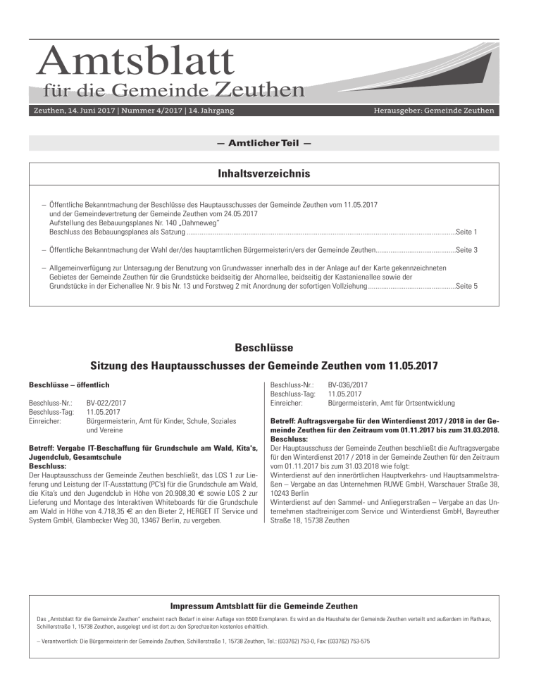 Impressum Amtsblatt für die Gemeinde Zeuthen