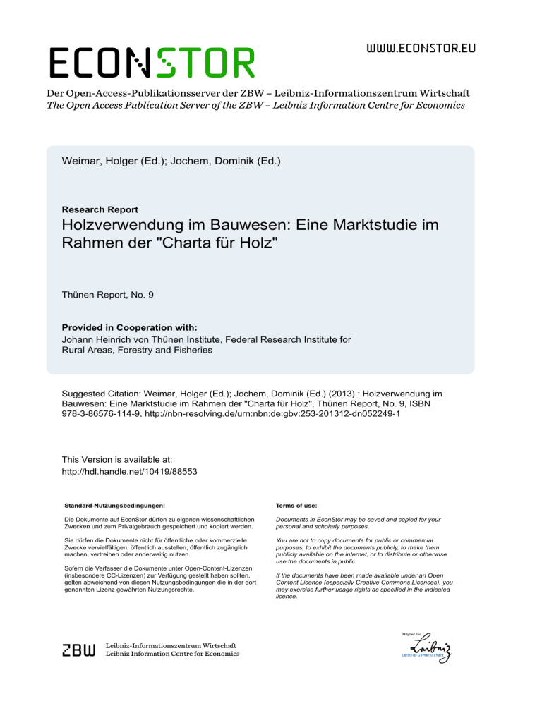 econstor www.econstor.eu Der Open-Access-Publikationsserver der ZBW – Leibniz-Informationszentrum Wirtschaft The Open Access Publication Server of the ZBW – Leibniz Information Centre for Economics Weimar, Holger (Ed.); Jochem, Dominik (Ed.) Research Report Holzverwendung im Bauwesen: Eine Marktstudie im Rahmen der "Charta für Holz" Thünen Report, No. 9 Provided in Cooperation with: Johann Heinrich von Thünen Institute, Federal Research Institute for Rural Areas, Forestry and Fisheries Suggested Citation: Weimar, Holger (Ed.); Jochem, Dominik (Ed.) (2013) : Holzverwendung im Bauwesen: Eine Marktstudie im Rahmen der "Charta für Holz", Thünen Report, No. 9, ISBN 978-3-86576-114-9, http://nbn-resolving.de/urn:nbn:de:gbv:253-201312-dn052249-1 This Version is available at: http://hdl.handle.net/10419/88553 Standard-Nutzungsbedingungen: Terms of use: Die Dokumente auf EconStor dürfen zu eigenen wissenschaftlichen Zwecken und zum Privatgebrauch gespeichert und kopiert werden. Documents in EconStor may be saved and copied for your personal and scholarly purposes. Sie dürfen die Dokumente nicht für öffentliche oder kommerzielle Zwecke vervielfältigen, öffentlich ausstellen, öffentlich zugänglich machen, vertreiben oder anderweitig nutzen. You are not to copy documents for public or commercial purposes, to exhibit the documents publicly, to make them publicly available on the internet, or to distribute or otherwise use the documents in public. Sofern die Verfasser die Dokumente unter Open-Content-Lizenzen (insbesondere CC-Lizenzen) zur Verfügung gestellt haben sollten, gelten abweichend von diesen Nutzungsbedingungen die in der dort genannten Lizenz gewährten Nutzungsrechte. zbw Leibniz-Informationszentrum Wirtschaft Leibniz Information Centre for Economics If the documents have been made available under an Open Content Licence (especially Creative Commons Licences), you may exercise further usage rights as specified in the indicated licence. Holzverwendung im Bauwesen Thünen Report 9 Herausgeber/Redaktionsanschrift Johann Heinrich von Thünen-Institut Bundesallee 50 38116 Braunschweig Germany www.ti.bund.de Thünen Report 9 – Holzverwendung im Bauwesen – Eine Marktstudie im Rahmen der „Charta für Holz“ – Eine Marktstudie im Rahmen der „Charta für Holz“ Holger Weimar und Dominik Jochem (Hrsg.) Thünen Report 9 Bibliografische Information: Die Deutsche Nationalbibliothek verzeichnet diese Publikationen in der Deutschen Nationalbibliografie; detaillierte bibliografische Daten sind im Internet unter www.dnb.de abrufbar. Bibliographic information: The Deutsche Nationalbibliothek (German National Library) lists this publication in the German National Bibliography; detailed bibliographic data is available on the Internet at www.dnb.de Zitationsvorschlag – Suggested source citation: Weimar H, Jochem D (eds) (2013) Holzverwendung im Bauwesen - Eine Marktstudie im Rahmen der „Charta für Holz“. Hamburg: Johann Heinrich von Thünen-Institut, 356 p, Thünen Rep 9 Thünen Report 9 Herausgeber/Redaktionsanschrift – Editor/address Johann Heinrich von Thünen-Institut Bundesallee 50 38116 Braunschweig Germany [email protected] www.ti.bund.de ISSN 2196-2324 ISBN 978-3-86576-114-9 DOI:10.3220/REP_9_2013 urn:nbn:de:gbv:253-201312-dn052249-1 Bereits in dieser Reihe erschienene Bände finden Sie im Internet unter www.ti.bund.de Volumes already published in this series are available on the Internet at www.ti.bund.de Die Verantwortung für die Inhalte liegt bei den jeweiligen Verfassern bzw. Verfasserinnen. The respective authors are responsible for the content of their publications. Holzverwendung im Bauwesen – Eine Marktstudie im Rahmen der „Charta für Holz“ Holger Weimar und Dominik Jochem (Hrsg.) Thünen Report 9 Dr. Holger Weimar (Hrsg.) Thünen-Institut für Internationale Waldwirtschaft und Forstökonomie Leuschnerstraße 91 21031 Hamburg Telefon: 040 73962-314 Fax: 040 73962-399 E-Mail: [email protected] Dominik Jochem (Hrsg.) Thünen-Institut für Internationale Waldwirtschaft und Forstökonomie Leuschnerstraße 91 21031 Hamburg Telefon: 040 73962 325 Fax: 040 73962 399 E-Mail: [email protected] Thünen Report 9 Hamburg/Germany, im Dezember 2013 Vorwort Holz spielt in vielen Bereichen unseres Lebens eine bedeutende Rolle. Durch den verstärkten Einsatz von nachhaltig erzeugten Holzprodukten können positive Beiträge für Klimaschutz, Ressourcenschonung und Beschäftigung erzielt werden. Das Prinzip der nachhaltigen Nutzung des Waldes und seiner Produkte wirkt weit über den Forst- und Holzsektor hinaus. Es ist zu einem weltweit anerkannten und angestrebten Grundprinzip der Politik und des allgemeinen Wirtschaftens geworden. Unter dem Dach dieses Nachhaltigkeitsprinzips setzt sich die Bundesregierung mit der „Holzcharta“ sowie der „Waldstrategie 2020“ für eine Steigerung der Verwendung dieses nachwachsenden Rohstoffs und seiner vorteilhaften Wirkungen für Klima, Umwelt und Gesellschaft ein. Nachhaltig erzeugtes Holz ist Teil des natürlichen CO2-Kreislaufs. Mit dem Wachstum der Bäume wird CO2 aufgenommen und in Form von Kohlenstoff im Holz gebunden. Während der gesamten Nutzungsdauer verbleibt der Kohlenstoff – zum Teil sehr langfristig – im Holz. Ähnlich wie der Wald wirken damit nachhaltig erzeugte Holzprodukte als CO2-Speicher und damit dem Klimawandel entgegen. Holz ist die Rohstoffbasis für viele unterschiedliche Gewerbe und Industrien. Insbesondere das Bauwesen hat für die Verwendung von Holz eine besondere Bedeutung. Etwa die Hälfte aller Holzprodukte wird hier eingesetzt. „Holz“ und „Bau“ sind zwei Begriffe, die seit jeher eine enge Symbiose bilden. Holz kann dank seiner Eigenschaften in nahezu allen Bereichen des Bauwesens eingesetzt werden. Gleichwohl gibt es noch Hemmnisse, die einem verstärkten Einsatz von Holz in der Bauwirtschaft entgegenstehen. Mit der hier vorliegenden Marktstudie zur Holzverwendung im Bauwesen werd