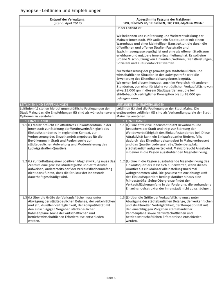 Synopse - Leitlinien und Empfehlungen Abgestimmte Fassung der Fraktionen Entwurf der Verwaltung (Stand: April 2012) SPD, BÜNDNIS 90/DIE GRÜNEN, FDP, CDU, ödp/Freie Wähler Unser Leitbild ist: Wir bekennen uns zur Stärkung und Weiterentwicklung der Mainzer Innenstadt. Wir wollen ein Stadtquartier mit einem Warenhaus und einer kleinteiligen Baustruktur, die durch die öffentlichen und offenen Straßen Fuststraße und Eppichmauergasse geprägt ist und eine als offenen Stadtraum erlebbare und nutzbare innere Erschließung hat. Es soll eine urbane Mischnutzung von Einkaufen, Wohnen, Dienstleistungen, Sozialem und Kultur entwickelt werden. Zur Verbesserung der gegenwärtigen städtebaulichen und wirtschaftlichen Situation in der Ludwigsstraße wird die Erweiterung des Einzelhandelsangebotes begrüßt. Wir gehen bei diesem Konzept, auch im Vergleich mit anderen Standorten, von einer für Mainz verträglichen Verkaufsfläche von etwa 25.000 qm in diesem Stadtquartier aus, die bei städtebaulich verträglicher Konzeption bis zu 28.000 qm betragen kann. LEITLINIEN UND EMPFEHLUNGEN Leitlinien (L) stellen hierbei unumstößliche Festlegungen der Stadt Mainz dar; die Empfehlungen (E) sind als wünschenswerte Optionen zu verstehen. 1 EINZELHANDEL 1.1 (L) Mainz braucht ein attraktives Einkaufszentrum in der Innenstadt zur Stärkung der Wettbewerbsfähigkeit des Einkaufsstandortes im regionalen Kontext, zur Verbesserung des Einzelhandelsangebotes für die Bevölkerung in Stadt und Region sowie zur städtebaulichen Aufwertung und Modernisierung des Ludwigsstraßen-Quartiers. LEITLINIEN UND EMPFEHLUNGEN Leitlinien (L) sind die Festlegungen der Stadt Mainz. Die ergänzenden Leitlinien (E) sind als Verhandlungsziele der Stadt Mainz zu verstehen. 1 EINZELHANDEL 1.1 (L) Eine attraktive Innenstadt nutzt Bewohnern und Besuchern der Stadt und trägt zur Stärkung der Wettbewerbsfähigkeit des Einkaufsstandortes bei. Diese Attraktivität kann ein Einkaufsquartier fördern, falls dadurch das Einzelhandelsangebot in Mainz verbessert und das Quartier Ludwigsstraße/Gutenbergplatz städtebaulich aufgewertet wird. Mainz braucht Angebote mit einer in die Region ausstrahlenden Magnetwirkung. 1.2 (L) Zur Entfaltung einer positiven Magnetwirkung muss das Zentrum eine gewisse Mindestgröße und Attraktivität aufweisen, andererseits darf der Verkaufsflächenumfang nicht dazu führen, dass die Struktur der Innenstadt dauerhaft geschädigt wird. 1.2 (L) Eine in die Region ausstrahlende Magnetwirkung des Einkaufsquartiers lässt sich nur erwarten, wenn dieses Quartier als ein Mainzer Alleinstellungsmerkmal wahrgenommen wird. Die gewünschte Anziehungskraft des Einkaufsquartiers bedingt darüber hinaus eine Mindestgröße. Seine Obergrenze findet der Verkaufsflächenumfang in der Forderung, die vorhandene Einzelhandelsstruktur der Innenstadt nicht zu schädigen. 1.3 (L) Über die Größe der Verkaufsfläche muss unter Abwägung der städtebaulichen Belange, der verkehrlichen und strukturellen Verträglichkeit, der Kompatibilität mit den einschlägigen Vorgaben städtebaulicher Rahmenpläne sowie der wirtschaftlichen und betriebswirtschaftlichen Erfordernisse entschieden werden. 1.3 (L) Über die Größe der Verkaufsfläche muss unter Abwägung der städtebaulichen Belange, der verkehrlichen und strukturellen Verträglichkeit, der Kompatibilität mit den einschlägigen Vorgaben städtebaulicher Rahmenpläne sowie der wirtschaftlichen und betriebswirtschaftlichen Erfordernisse entschieden werden. Seite 1 Synopse - Leitlinien und Empfehlungen Entwurf der Verwaltung (Stand: April 2012) Abgestimmte Fassung der Fraktionen SPD, BÜNDNIS 90/DIE GRÜNEN, FDP, CDU, ödp/Freie Wähler 1.4 (L) Den Orientierungsrahmen geben die von BulwienGesa sowie Junker und Kruse ermittelten Verkaufsflächenpotentiale und als sinnvoll empfohlenen Größenordnungen vor. Sie liegt zwischen dem Umfang der beiden anderen Pole des Tripols und demnach bei 25.000 qm bis 28.000 qm Einzelhandelsverkaufsfläche einschließlich des Flächenbedarfs für Karstadt aber ohne die Flächen für Dienstleistungen und Gastronomie. 1.4 (L) Den Orientierungsrahmen geben die von BulwienGesa sowie Junker und Kruse ermittelten Verkaufsflächenpotentiale und als sinnvoll empfohlenen Größenordnungen vor. Sie liegt zwischen dem Umfang der beiden anderen Pole des Tripols und demnach bei 25.000 qm bis 28.000 qm Einzelhandelsverkaufsfläche im Bereich des gesamten Stadtquartiers Ludwigsstraße; eine Erweiterung auf bis zu 28.000 qm Einzelhandelsverkaufsfläche ist denkbar im Hinblick auf eine Einbeziehung des Bereichs zwischen Weißliliengasse und Osteiner Hof; die Flächenangaben verstehen sich einschließlich des Flächenbedarfs für Karstadt aber ohne die Flächen für Dienstleistungen und Gastronomie. Die Realisierbarkeit von Verkaufsflächen dieser Größenordnung hängt von der städtebaulichen Verträglichkeit der dafür erforderlichen Baukörper ab. Die Verträglichkeit für den Mainzer Einzelhandel ist auch unter Berücksichtigung der Randlagen gutachterlich nachzuweisen. 1.5 (L) Zur Entfaltung größtmöglicher positiver Wechselwirkungen zwischen dem Einkaufszentrum und der City/den angrenzenden Einkaufslagen ist ein Höchstmaß an architektonischer Einfügung, Außenorientierung, Öffnung und Durchlässigkeit erforderlich. 1.5 (L) Zur Entfaltung größtmöglicher positiver Wechselwirkungen zwischen dem Einkaufsquartier und der City/den angrenzenden Einkaufslagen ist ein Höchstmaß an architektonischer Einfügung, Außenorientierung, Öffnung und Durchlässigkeit erforderlich. 1.6 (E) Zur gegenseitigen angebotsorientierten Stärkung von Einkaufszentrum und Innenstadt/City soll der Branchen-, Betriebsarten-, Betriebsgrößen- und Sortimentsmix auf eine Füllung von Angebotslücken zur Ergänzung des Innenstadtangebotes ausgerichtet werden. Insbesondere soll auf eine Arbeitsteilung zwischen den drei Polen des Tripols (Brand, Römerpassage, Ludwigsstraße) hingewirkt w