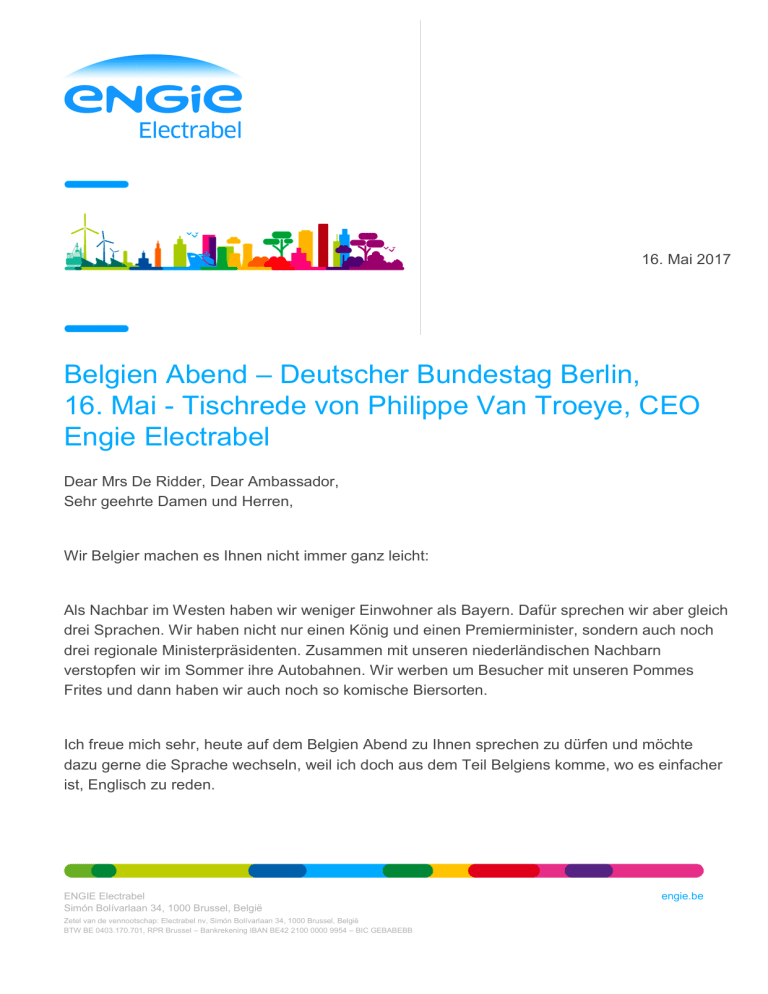 16. Mai 2017 Belgien Abend – Deutscher Bundestag Berlin, 16. Mai - Tischrede von Philippe Van Troeye, CEO Engie Electrabel Dear Mrs De Ridder, Dear Ambassador, Sehr geehrte Damen und Herren, Wir Belgier machen es Ihnen nicht immer ganz leicht: Als Nachbar im Westen haben wir weniger Einwohner als Bayern. Dafür sprechen wir aber gleich drei Sprachen. Wir haben nicht nur einen König und einen Premierminister, sondern auch noch drei regionale Ministerpräsidenten. Zusammen mit unseren niederländischen Nachbarn verstopfen wir im Sommer ihre Autobahnen. Wir werben um Besucher mit unseren Pommes Frites und dann haben wir auch noch so komische Biersorten. Ich freue mich sehr, heute auf dem Belgien Abend zu Ihnen sprechen zu dürfen und möchte dazu gerne die Sprache wechseln, weil ich doch aus dem Teil Belgiens komme, wo es einfacher ist, Englisch zu reden. ENGIE Electrabel Simón Bolívarlaan 34, 1000 Brussel, België Zetel van de vennootschap: Electrabel nv, Simón Bolívarlaan 34, 1000 Brussel, België BTW BE 0403.170.701, RPR Brussel – Bankrekening IBAN BE42 2100 0000 9954 – BIC GEBABEBB engie.be Gesprochen in Englisch: Wir alle fühlen uns verpflichtet, die globale Erwärmung zu stoppen. Aber die Wege, um dieses gemeinsames Ziel zu erreichen, können unterschiedlich sein. Ich bin überzeugt, dass der Energiesektor eine entscheidende sielt, um die globale Erwärmung abzuschwächen. Das ist der Grund, warum Sie in Deutschland und wir in Belgien uns in einem europäischen Rahmen zu erneuerbaren Energien bekannt haben. Wir haben ein gemeinsames ehrgeiziges Ziel: Die Dekarbonisation der gesamten Energieproduktion. Als weltweiter Energieerzeuger unterstützt ENGIE die in der Pariser Klimavereinbarung COP21 gemachten Vorgaben. Wir stehen zu den ehrgeizigen europäischen Zielen für die Jahre 2020, 2030 und 2050. Gerade die Ziele für das Jahr 2050 sind der entscheidende Punkt für die Veränderung unserer Gesellschaft. Dafür wollen wir - die CO2 Emissionen um 80% reduzieren und einen Energiemix erreichen, der zu 50% erneuerbare Energien enthält. Das ist mehr als nur eine Veränderung. Wir sprechen von einer Revolution, die uns abverlangt, unsere gesamte Energieproduktion neu zu denken. ENGIE ist deshalb dabei, sich vollkommen zu verändern, um ein Vorkämpfer dieser Revolution zu sein. Ich möchte Ihnen dazu kurz unsere vier neuen strategischen Leitlinien vorstellen: 1) Wir haben uns entschieden, alle neuen Kohleprojekte einzustellen und uns von allen existierenden Kohlekraftunternehmungen so schnell wie möglich zurückzuziehen. ENGIE verfügt aktuell lediglich über 8 Gigawatt an Kohle basierter Erzeugungskapazität, noch zum Jahresende 2015 waren es 15 Gigawatt. 2) Gleichzeitig fahren wir damit fort, unsere Erdgasaktivitäten auszubauen. Wir sind fest davon überzeugt, dass Erdgas den besten Verbündete für den Energiewandel darstellt, während wir die Produktion aus erneuerbaren Energien ausbauen. ENGIE Electrabel Simón Bolívarlaan 34, 1000 Brussel, België Zetel van de vennootschap: Electrabel nv, Simón Bolívarlaan 34, 1000 Brussel, België BTW BE 0403.170.701, RPR Brussel – Bankrekening IBAN BE42 2100 0000 9954 – BIC GEBABEBB engie.be 3) Unser Konzern hat gleichzeitig angekündigt, dass wir die digitale Transformation mit einem 1,5 Milliarden Euro schweren Investitionsplan in den nächsten drei Jahren vorantreiben wollen. Wir wollen damit die notwendigen Kompetenzen aufbauen, um die Software zu entwickeln, mit der wir die Energiesysteme der Zukunft betreiben können. 4) Unser vierter Ansatz schließlich ist die Nuklearstrategie unseres Konzerns. Wir haben vor kurzem unseren 40 prozentigen Anteil an dem NuGen-Projekt in Großbritannien verkauft. Damit gaben wir ein wichtiges Signal: Unser Konzern hat nicht vor, in die neue Generation von Nukleartechnologien zu investieren, auch wenn unser Unternehmen volles Vertrauen in unsere bestehende Expertise hat und wir die bereits bestehenden Kernkraftwerke für den Übergang weiterführen möchte. Wir sind davon überzeugt, dass die bereits installierten Kernkraftwerkskapazitäten für den Übergang notwendig sind, um unsere CO2 Ziele zu erreichen, um die Erzeugungspreise niedrig zu halten und um die Versorgungssicherheit unseres Landes zu gewährleisten. Wir alle wissen, dass sowohl Deutschland als auch Belgien in hohem Maße in erneuerbaren Energien investieren. Aber Sie wissen vielleicht nicht, dass ENGIE Electrabel in Belgien der größte Erzeuger von erneuerbaren Energien ist. Und obwohl unser CO2 Ausstoß relativ niedrig ist, streben wir eine weitere Verringerung unserer CO2 Emissionen um 10% für das Jahr 2020 an: Wir werden unsere Energieproduktion aus Windkraft bis zum Jahr 2020 verglichen mit 2014 verdreifachen, wir werden alle umsetzbaren Offshore Windprojekte realisieren und wir verfügen über maßgerechte Solarangebote sowohl für private als auch gewerbliche Kunden. Wir sind darüber hinaus überzeugt, dass Belgien noch sehr viel mehr tun kann in punkto Energieeffizienz. Schon heute arbeiten 10.000 ENGIE-Mitarbeiter vor Ort an dieser Herausforderung. Aber es ist eben Realität, dass es nicht möglich ist, von heute auf morgen von den bestehenden Systemen auf zu hundert Prozent erneuerbare Energien umzuschalten. ENGIE Electrabel Simón Bolívarlaan 34, 1000 Brussel, België Zetel van de vennootschap: Electrabel nv, Simón Bolívarlaan 34, 1000 Brussel, België BTW BE 0403.170.701, RPR Brussel – Bankrekening IBAN BE42 2100 0000 9954 – BIC GEBABEBB engie.be Wir müssen im Übergangszeitraum auch die Versorgungssicherheit gewährleisten und wie immer gibt es auch hier nicht nur den einen Weg zum Gipfel. Wir respektieren die deutsche Energiepolitik, aber sie unterscheidet sich von der, die die belgischen Entscheidungsträger festlegten, und zwar namentlich darin, Kohlekraftwerke stillzulegen und keine mehr zu bauen. Anstatt auf Stein- oder Braunkohle zu setzen, hat sich Belgien entschieden, saubere Nukleartechnologie