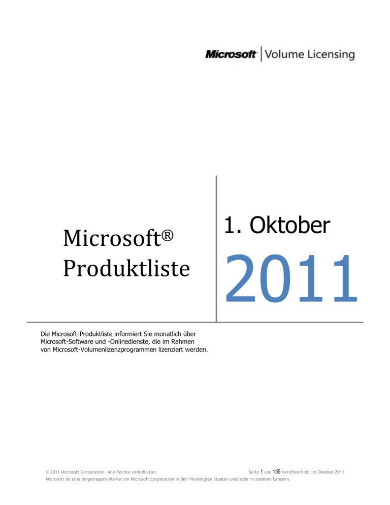 Microsoft® Produktliste 1. Oktober 2011 Die Microsoft-Produktliste informiert Sie monatlich über Microsoft-Software und -Onlinedienste, die im Rahmen von Microsoft-Volumenlizenzprogrammen lizenziert werden. © 2011 Microsoft Corporation. Alle Rechte vorbehalten. Seite 1 von 155 Veröffentlicht im Oktober 2011 Microsoft ist eine eingetragene Marke von Microsoft Corporation in den Vereinigten Staaten und/oder in anderen Ländern. ÜBER DIESES DOKUMENTS Die Microsoft-Produktliste informiert Sie monatlich über Microsoft-Software und -Onlinedienste, die im Rahmen von Microsoft-Volumenlizenzprogrammen lizenziert werden. In der Microsoft-Produktliste wird unter anderem Folgendes beschrieben: Verfügbarkeit neuer Software und Produkte, die im Rahmen von Microsoft-Volumenlizenzprogrammen angeboten werden Wegfall von Software und Produkten, die im Rahmen von Microsoft Volumenlizenzprogrammen angeboten wurden Software- und Produktzuordnungen in Bezug auf den Microsoft-Volumenlizenz-Produktpool Die Punktwerte für die einzelnen Software- und Produkttechnologien Verfügbare Promotions Migrationspfade von einer Softwareversion auf eine andere Version derselben Software Migrationspfade von einer nicht mehr angebotenen Software auf neue Softwareversionen Software Assurance-Vergünstigungen Sonstige spezifische Hinweise und Informationen zu Software und Produkten VERWENDUNG DER MICROSOFT-PRODUKTLISTE Bitte machen Sie sich mit der Tabellenlegende vertraut, die im Anschluss an die nachfolgend genannten Schritte zu finden ist. Schritt 1: Suchen Sie die infrage kommende Software in der Tabelle. Schritt 2: Informieren Sie sich in den zugehörigen Spalten über verfügbare Promotions, Software Assurance-Vergünstigungen, Punktzahlen, Programmverfügbarkeit usw. © 2011 Microsoft Corporation. Alle Rechte vorbehalten. Seite 2 von 155 Veröffentlicht im Oktober 2011 Microsoft ist eine eingetragene Marke von Microsoft Corporation in den Vereinigten Staaten und/oder in anderen Ländern. Schritt 3: Einige Softwareprodukte sind darüber hinaus mit Fußnoten versehen, die weitere Informationen enthalten. Wenn Sie auf die Fußnotennummer (sofern vorhanden) „klicken“ (Strg + Klick), gelangen Sie direkt zu dem entsprechenden Text. Alternativ können Sie die angegebene Fußnote auf den Seiten im Anschluss an die Tabelle nachschlagen und dort die zusätzlichen Informationen lesen. Die zusätzlichen Informationen enthalten Einzelheiten bezüglich Migrationsangeboten oder Berechtigungskriterien, wie im folgenden Beispiel dargestellt. Schritt 4: Weitere Informationen über Software Assurance-Vergünstigungen sowie den Erwerb und die Verlängerung von Software Assurance finden Sie in den Anhängen 5 und 6. Anmerkung: In der Produktliste ist die verfügbare Software nach Programm aufgeführt. Darüber hinaus enthält die Produktliste softwarespezifische Informationen hinsichtlich des Erwerbs von Lizenzen für die betreffende Software. Die Produktliste wird durch Bezugnahme Bestandteil des MicrosoftVolumenlizenvertrages. Die Verfügbarkeit von Software kann von Region zu Region variieren. Für Informationen bezüglich der regionalen Verfügbarkeit eines bestimmten Softwareproduktes sollten sich Kunden an ihren Handelspartner oder Microsoft-Kundenbetreuer wenden. Außerdem ist es sinnvoll, das Produktbenutzungsrechte-Dokument zu konsultieren. Das Produktbenutzungsrechte-Dokument wird vierteljährlich aktualisiert und enthält Informationen über die neuesten Nutzungsrechte für Microsoft-Software unter Microsoft-Volumenlizenzprogrammen. Das Dokument befindet sich unter: http://www.microsoftvolumelicensing.com/userights/Default.aspx © 2011 Microsoft Corporation. Alle Rechte vorbehalten. Seite 3 von 155 Veröffentlicht im Oktober 2011 Microsoft ist eine eingetragene Marke von Microsoft Corporation in den Vereinigten Staaten und/oder in anderen Ländern. MICROSOFT®............................................................................................................... 1 ÜBER DIESES DOKUMENTS ......................................................................................... 2 VERWENDUNG DER MICROSOFT-PRODUKTLISTE ...................................................... 2 Tabellenlegende .............................................................................................................................................. 14 PRODUKTLISTE ......................................................................................................... 16 ANWENDUNGS-POOL ................................................................................................................................. 16 Access 2010 .................................................................................................................................................... 16 AutoRoute 2011 .............................................................................................................................................. 16 Bing Maps Desktop mit erweitertem Inhaltspaket ............................................................................................... 16 Excel 2010 ...................................................................................................................................................... 16 Excel für Mac 2011 .......................................................................................................................................... 16 Expression Studio Professional 4 ....................................................................................................................... 16 Expression Studio Ultimate 4 ............................................................................................................................ 16 Expression Encoder Pro 4 ................................................................................................................................. 16 GeoSynther 3.0 ...........................................................