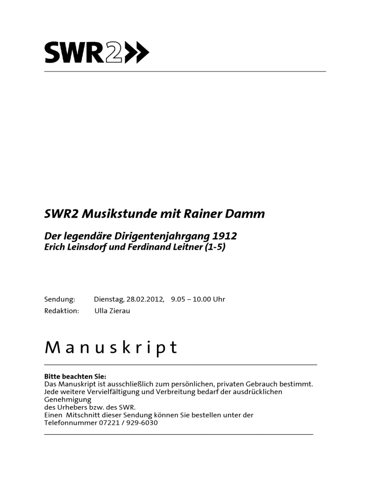 ___________________________________________________________________________ SWR 2 Musikstunde mit Rainer Damm, 28. Februar 2012 Der legendäre Dirigentenjahrgang 1912 Erich Leinsdorf und Ferdinand Leitner (2) Erich Leinsdorf 2 Lesen Sie Musik oder Aimez-vous Beethoven? so überschrieb Erich Leinsdorf seine Musikalischen Gedanken, die Mitte der Siebziger Jahre in Buchform erschienen. Diese offenbar doppelt genähte Affinität zur Musik: das Denken UND das Lieben ist dem österreichisch- amerikanischen Dirigenten, der vor hundert Jahren geboren wurde, immer eigen gewesen. Bisweilen hat man ihm seine selbstverständliche analytische Klarheit, seine kapellmeisterliche Strenge, seine durchdachten Interpretationen fast zum Vorwurf gemacht. Dass international erfolgreiche Dirigenten außerdem noch zu geistreich - kritischem Nachdenken fähig sind, blieb in seinem Metier eher die Ausnahme. Er war ein Glücksfall für Kenner und Liebhaber der Musik... kein Pultstar oder Magier des Taktstocks, vielmehr ein erfahrener Könner, dem kaum eine Partitur von Bedeutung entgangen ist. Einen vorzüglichen musikalischen Handwerker der westlichen Welt hat man ihn einmal genannt, einen Musiker mit jener selten gewordenen Mischung von Wissen und Begeisterung, von nicht - elitärem Selbstbewusstsein und Ablehnung jeglicher Andachtszeremonie im Konzertsaal. ___________________________________________________________________ CD RCA 88697809452 Disc 3 track 8 ab 3‘59 5‘20 ___________________________________________________________________ John Browning war der Solist in diesem Ausschnitt aus dem 1. Satz von Sergej Prokofievs Klavierkonzert Nr. 3 in C - Dur op. 26. Erich Leinsdorf stand am Pult des Boston Symphony Orchestra. Dieser Prokofiev - Zyklus mit den vier Sinfonien, fünf Klavierkonzerten, den beiden Violinkonzerten, der Leutnant Kijé-Suite und einer von Leinsdorf selbst zusammengestellten Romeo und Julia Suite gehört zu den wichtigsten Schallplattenprojekten, die unser Protagonist als Orchesterchef in Boston während der Sechziger Jahren realisiert hat. Obwohl sein Vermächtnis auf Tonträgern bei seinem Stammhaus RCA in den beiden letzten Jahrzehnten, und selbst anlässlich seines 100. 2 Geburtstags eher stiefmütterlich behandelt wurde und wird, so ist doch zumindest seine Prokofiev-Kassette, die Referenzqualität beanspruchen darf, kürzlich zum Schnäppchenpreis wiederaufgelegt worden. Mein Wort darauf, dass ich weder Provisionen in bar, noch Hotel - Upgrades und schon gar keine Gratis - Urlaube für meine Empfehlung bekomme, aber die Anschaffung zum Preis einer Familienpizza lohnt wirklich. Wenn von Leinsdorfschen Großprojekten mit Pioniercharakter die Rede ist, dann muss auch seine Gesamteinspielung der Mozart - Sinfonien mit dem Royal Philharmonic Orchestra London erwähnt werden, die Leinsdorf - man glaubt es kaum - in den Fünfziger Jahren bei dem schon lange untergegangenen aber inzwischen von dem Medien - Giganten Universal aufgesogenen Westminister Label aufgenommen hat. Als allererster, noch lange vor Karl Böhm, Karajan und den inzwischen zahllosen nachfolgenden wie Trevor Pinnock , Christopher Hogwood, Charles Mackeras oder John Eliot Gardiner hat Leinsdorf den Kosmos der Mozartschen Sinfonien in Gänze in Angriff genommen. Mitte der Fünfziger Jahre !!! Nicht nur medien- sondern auch interpretationsgeschichtlich steht diese Großtat Leinsdorfs absolut einzigartig da. Hier wird deutlich, warum er damals ein Außenseiter unter den Mozartdirigenten bleiben musste. Er tat nämlich das, was drei Jahrzehnte später Harnoncourt und Gleichgesinnte mit Nachdruck aufgegriffen haben. Er verschärfte die Kontraste bei der Artikulation und bei der Balance zwischen den Instrumentengruppen. Was die Tempowahl betrifft, lässt sich der Einfluss seines einstigen Förderers Toscanini nicht überhören. Leinsdorf schlägt einen Sturm - und Drang - Tonfall an, der dem damals bevorzugten und eher betulichen Wiener Mozart - Stil von Böhm oder Krips diametral entgegenstand. In seiner Bostoner Zeit hat Leinsdorf dann noch einmal einige seiner Mozartschen Lieblingssinfonien mit seinem Orchester aufgenommen.... ___________________________________________________________________ Umschnitt von Platte RCA (SWR) take 4 ab 6‘39 = 5‘25 ___________________________________________________________________ Das Boston Symphony Orchestra unter der Leitung von Erich Leinsdorf spielte das Finale der Sinfonie Nr. 41 in C- Dur KV 551 von Wolfgang Amadeus Mozart. A propos Mozart.... Leinsdorfs hochinteressante Cosi fan tutte Produktion aus dem 3 Jahre 1967 gehört noch heute zur Grundausstattung jeder fortgeschrittenen Mozart Opernsammlung. Denn es handelt sich um die erste Aufnahme, die den Anspruch auf Vollständigkeit erheben kann, sowohl, was die Rezitative, wie auch die Anzahl der musikalischen Nummern betrifft. Die Besetzung rekrutiert sich aus den damals besten Kräften der Metropolitan Opera, wir erleben großen Klang, der sich von den heutigen kammermusikalisch orientierten und historisch informierten Herangehensweisen deutlich unterscheidet. Eine Lesart, die sich nicht in hintergründigen Subtilitäten verliert, aber trotzdem überzeugend wirkt durch die vitale Herangehensweise, a typically American approach, möchte man sagen. Die Charaktere sind deutlich ausgeprägt, und - was mich persönlich für diese Aufnahme einnimmt - der feine, hintergründige Witz, der hier durchscheint, und der sich beispielsweise von Karl Böhms gewöhnugsbedürftigen und manchmal etwas behäbigem Humorverständnis wohltuend abhebt. Leontyne Price und Tatiana Troyanos verstehen es, genau wie in der Partitur vorgegeben, ein sprunghaft unberechenbares Schwesternpaar zu geben, immer voll bei der Sache, total aufgeregt und überdreht, heute so, und morgen schon wieder ganz anders, so wie Frauen eben sind, wenn sie meinen, die ganze Welt drehe sich nur um sie. Oder noch besser: die ganze Welt läge ihnen zu Füßen. ______________________